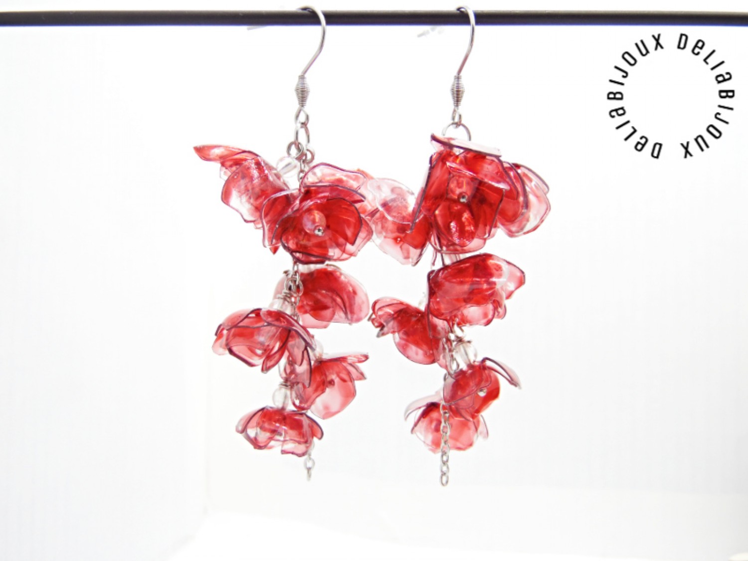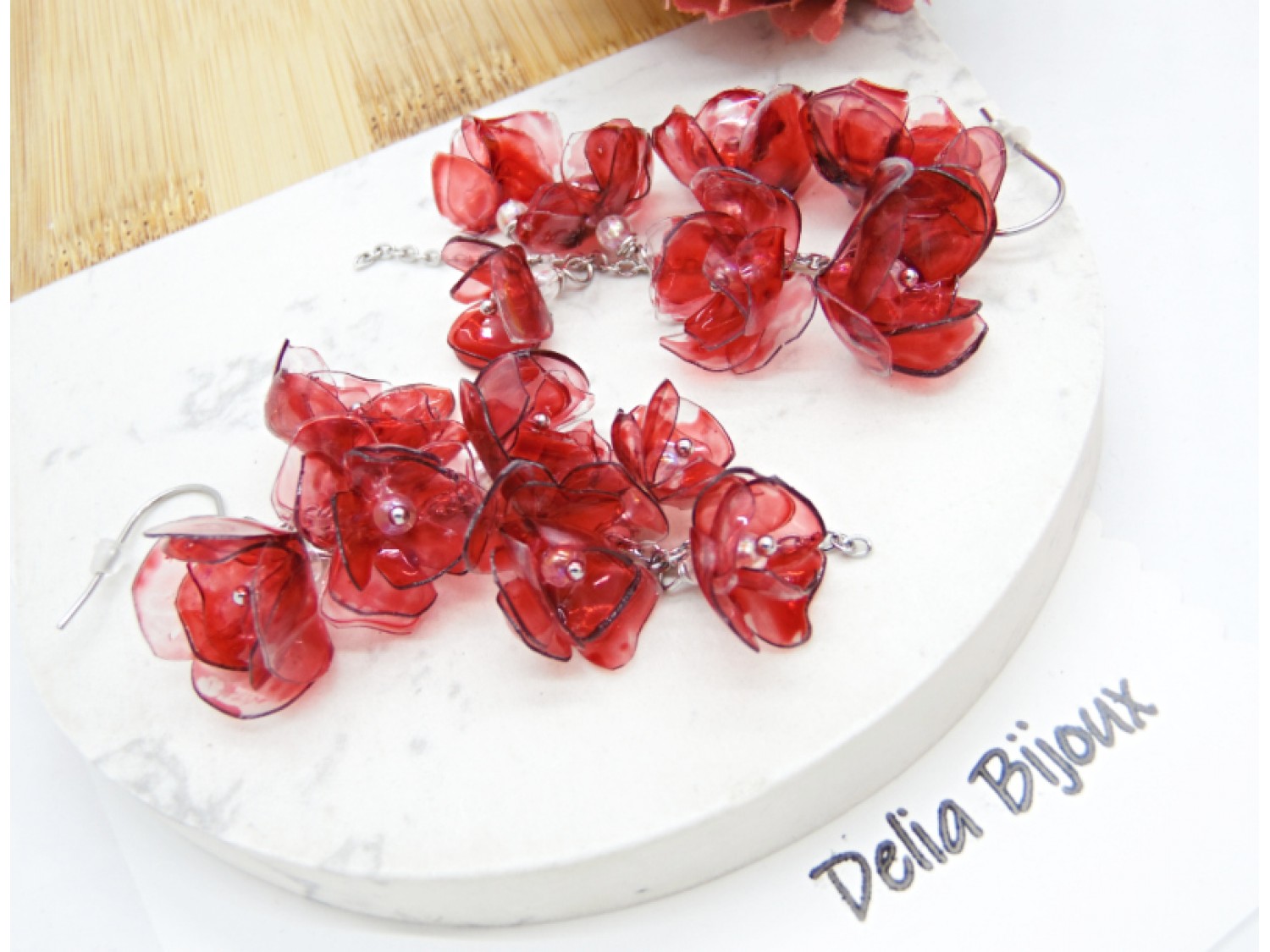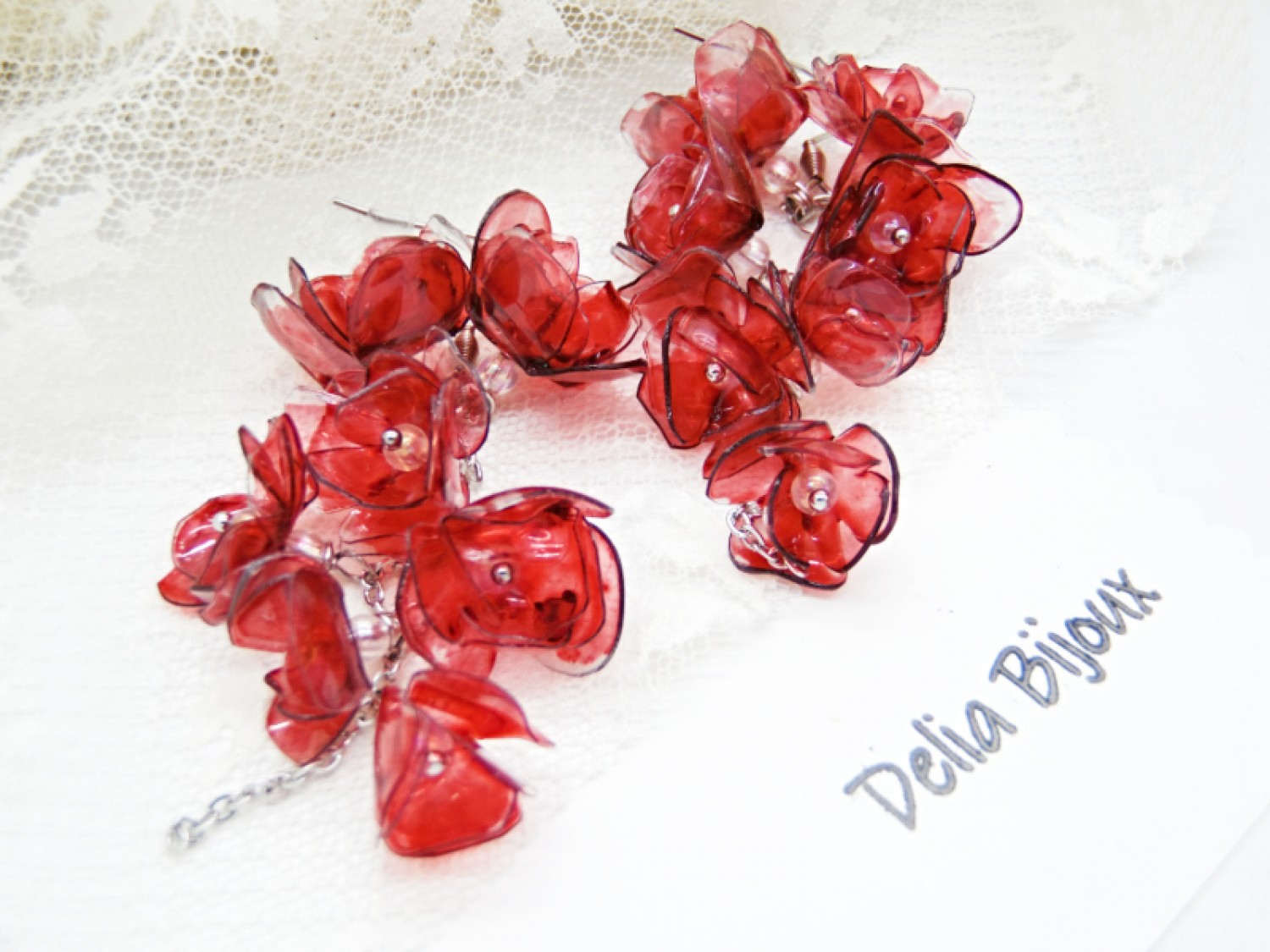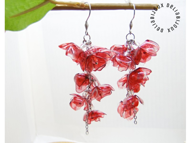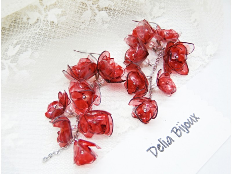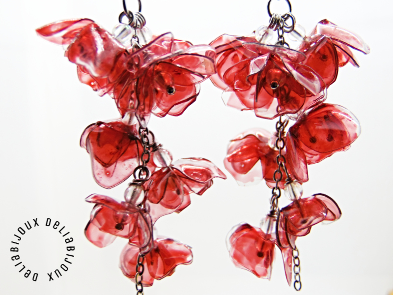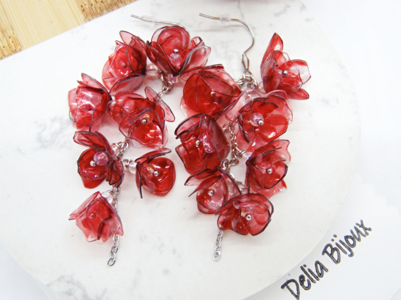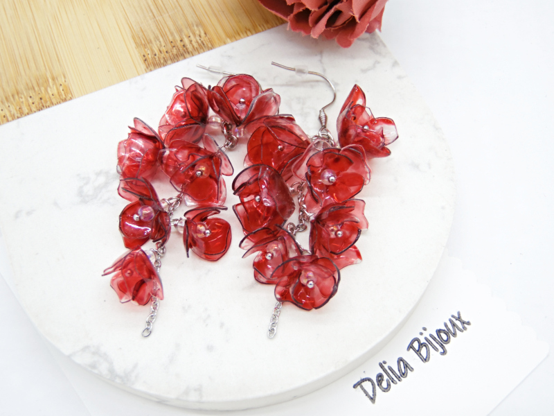 Acești cercei spectaculoși cu flori realizate din sticle de plastic reciclate sunt o alegere perfectă pentru iubitoarele de accesorii originale, sustenabile și ușoare. Fiecare floare este decupată manual, modelată la căldură și pictată în nuanțe intense de roșu bordo, oferind un efect artistic deosebit, cu un aer misterios și elegant.
