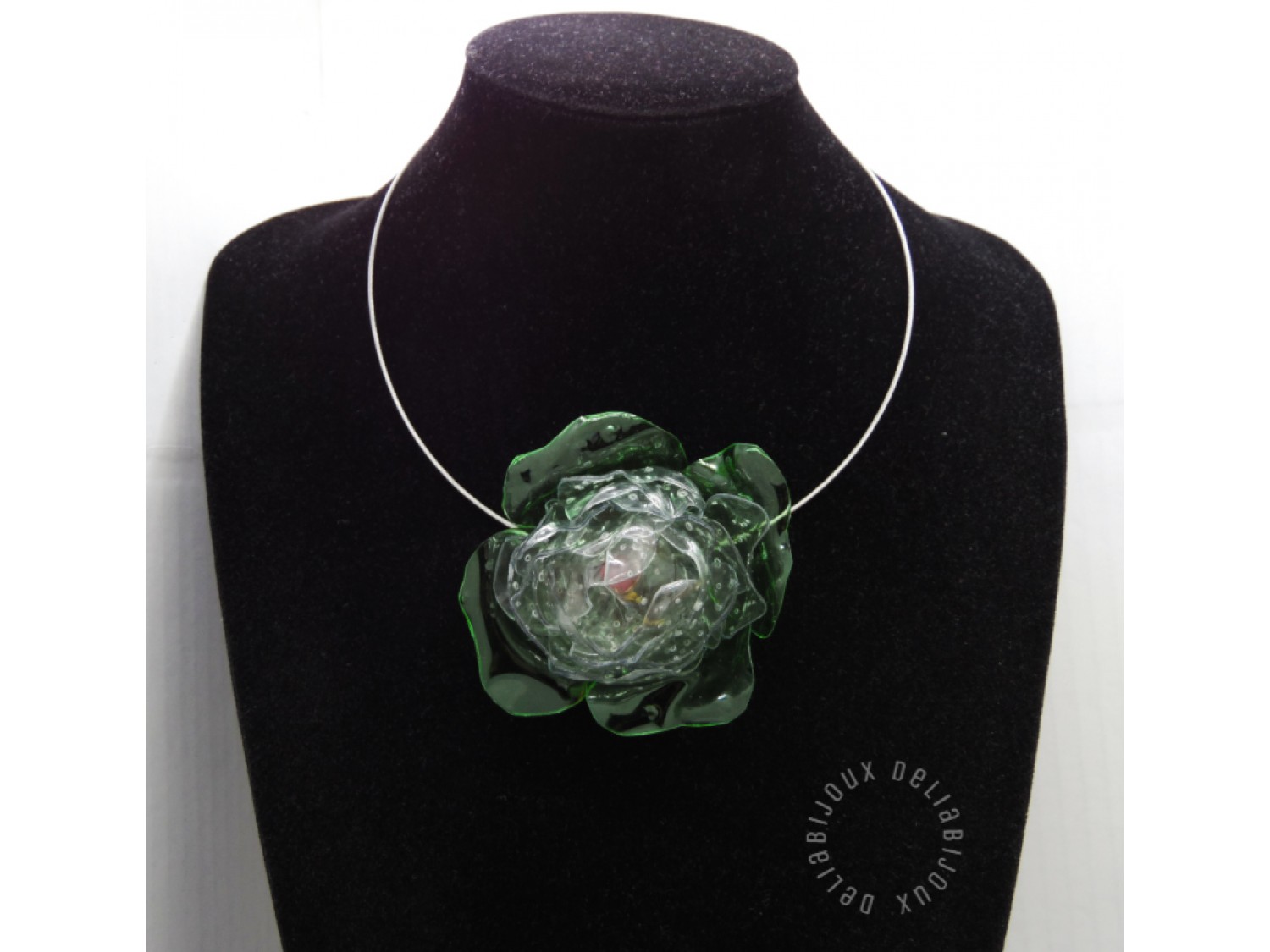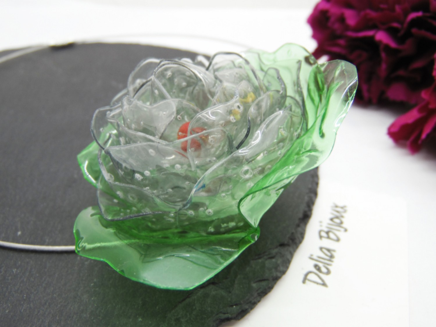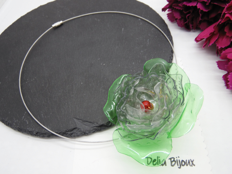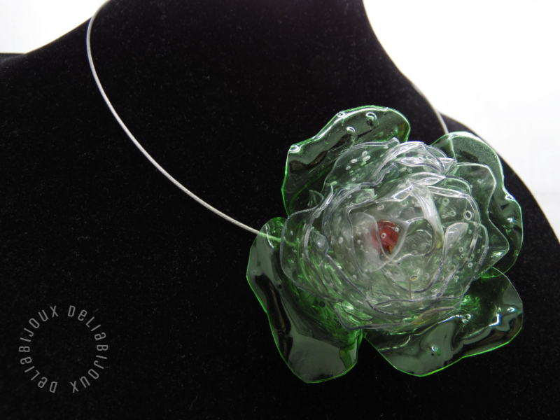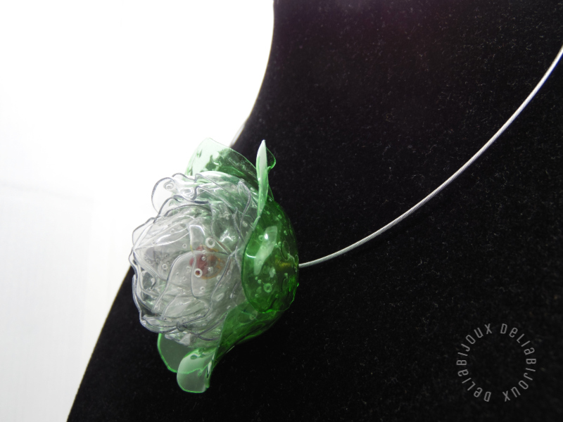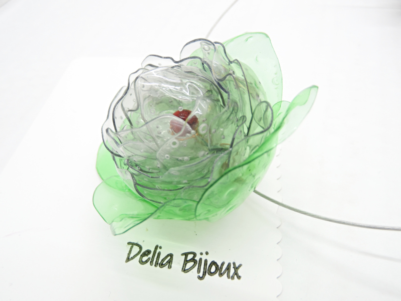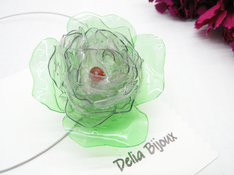 Design deosebit: Floarea centrală este realizată din sticle de plastic, tăiate manual și modelate la cald, rezultând o bijuterie spectaculoasă cu un efect vizual unic.