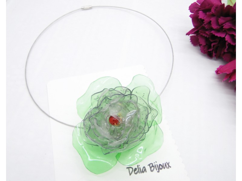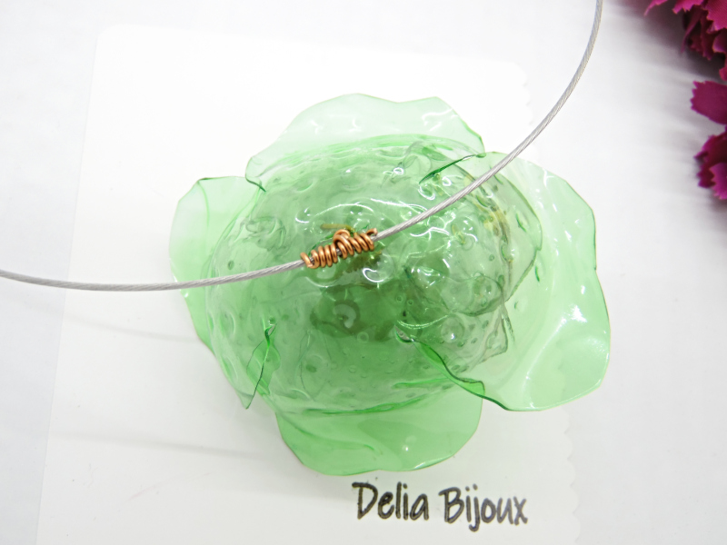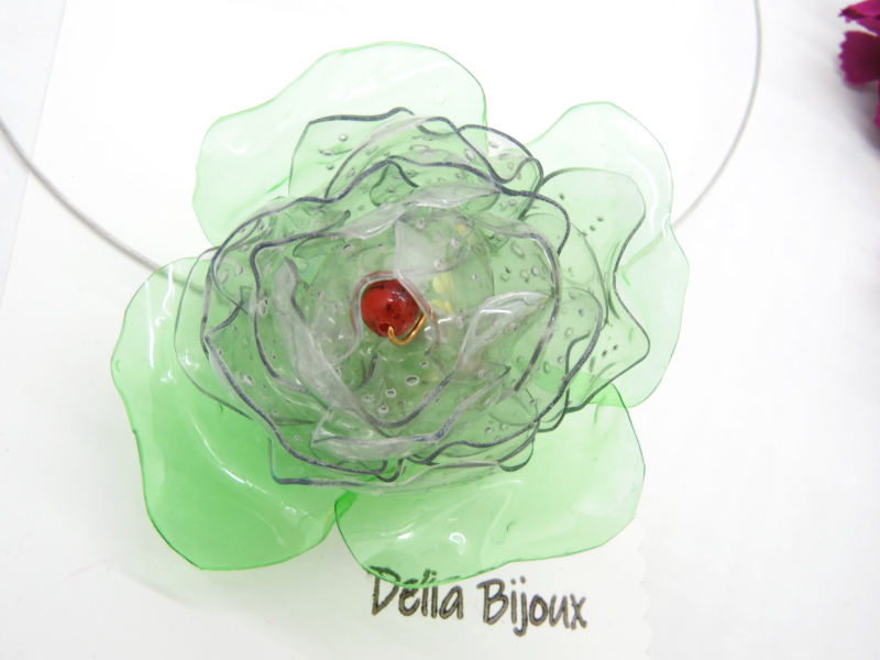 Colier statement, handmade, realizat din plastic reciclat (pet-uri decupate manual si modelate in diverse forme - diametrul florii ~ 7.5 cm, inaltimea - 4 cm), margica de plastic (10 mm), sarma de modelaj cupru non-tarnish (nu oxideaza, nu se pateaza si nu isi pierde aspectul initial), baza colier siliconata rigida (isi pastreaza forma; diametru: 14.5 cm; grosime : 1mm) cu inchizatoare cu filet si elemente metalice.