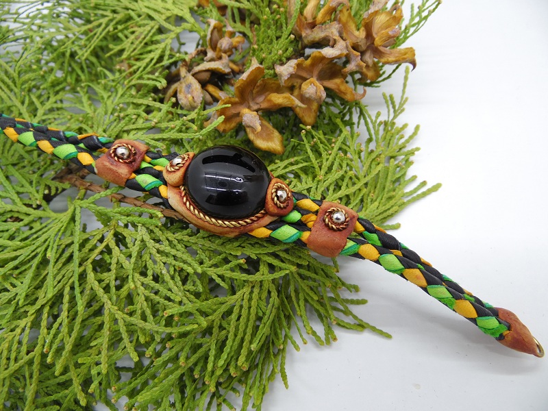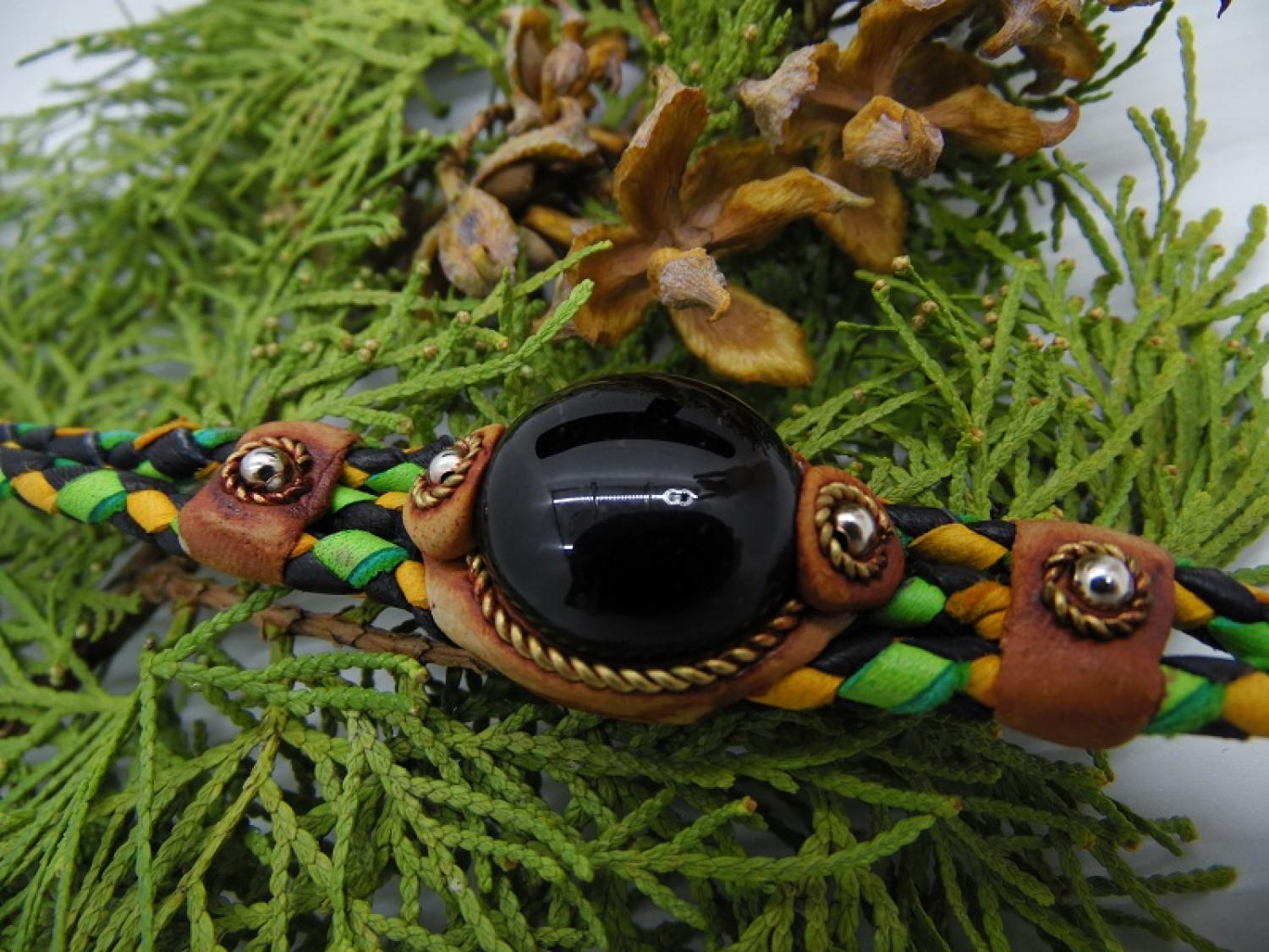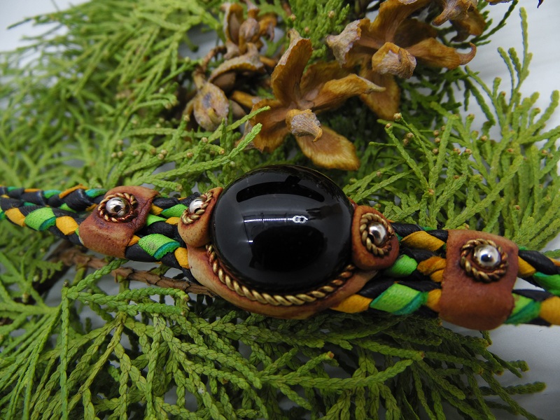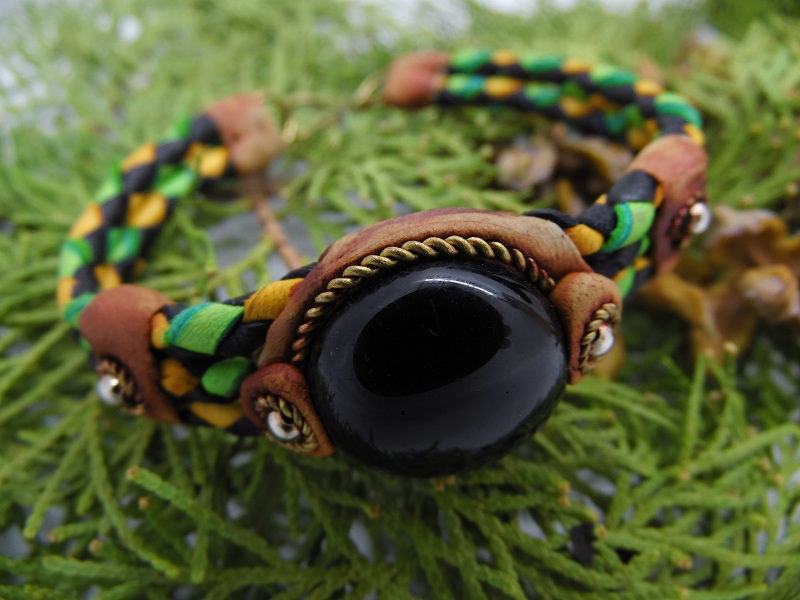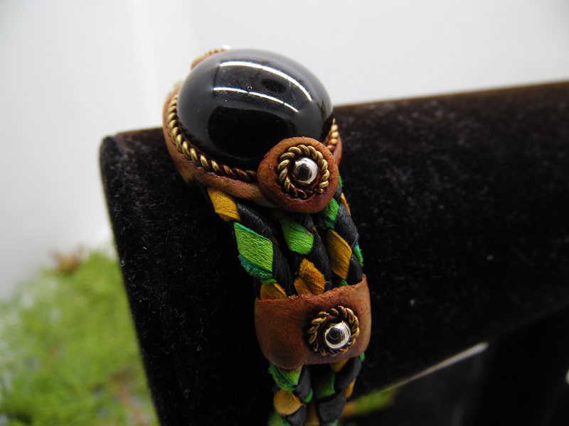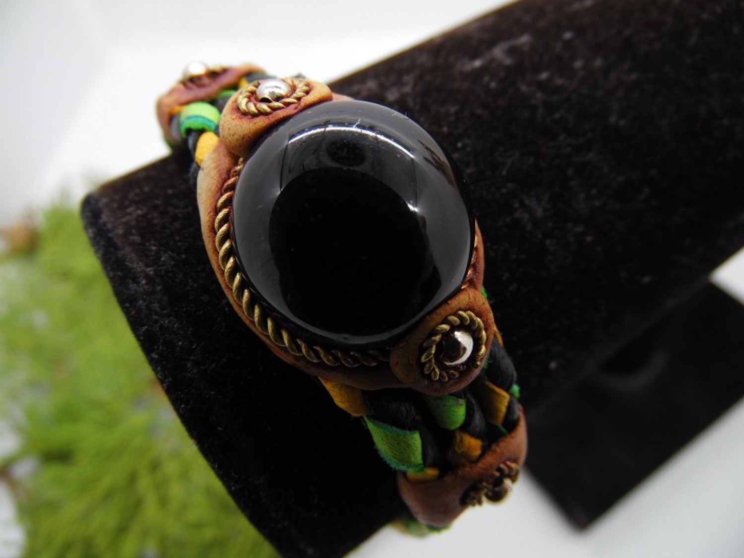 Bratara impletita din piele cu cristal de sticla colorata.Lungime = 18 cm.