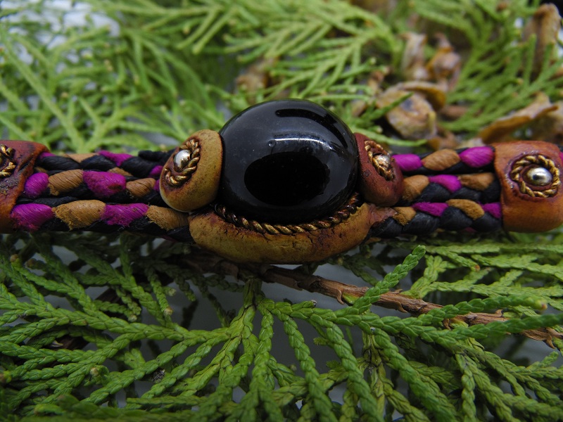 Bratara impletita din piele cu cristal de sticla colorata.Lungime = 17 cm + lant prelungitor 3 cm