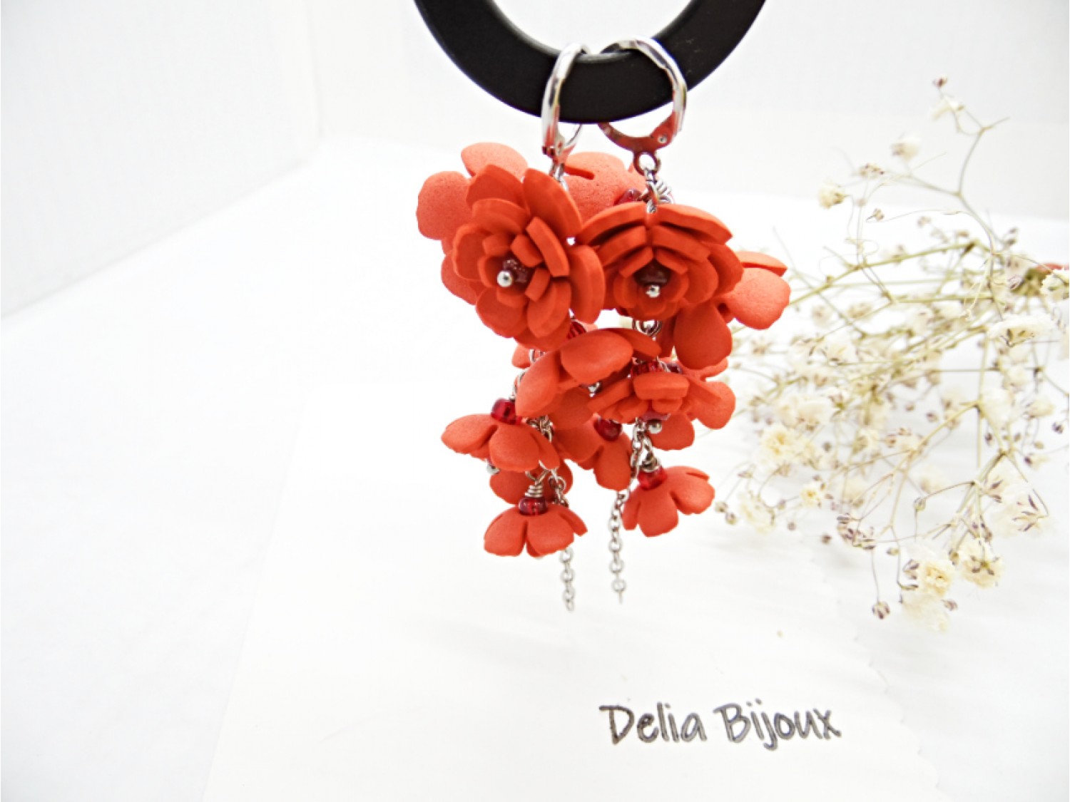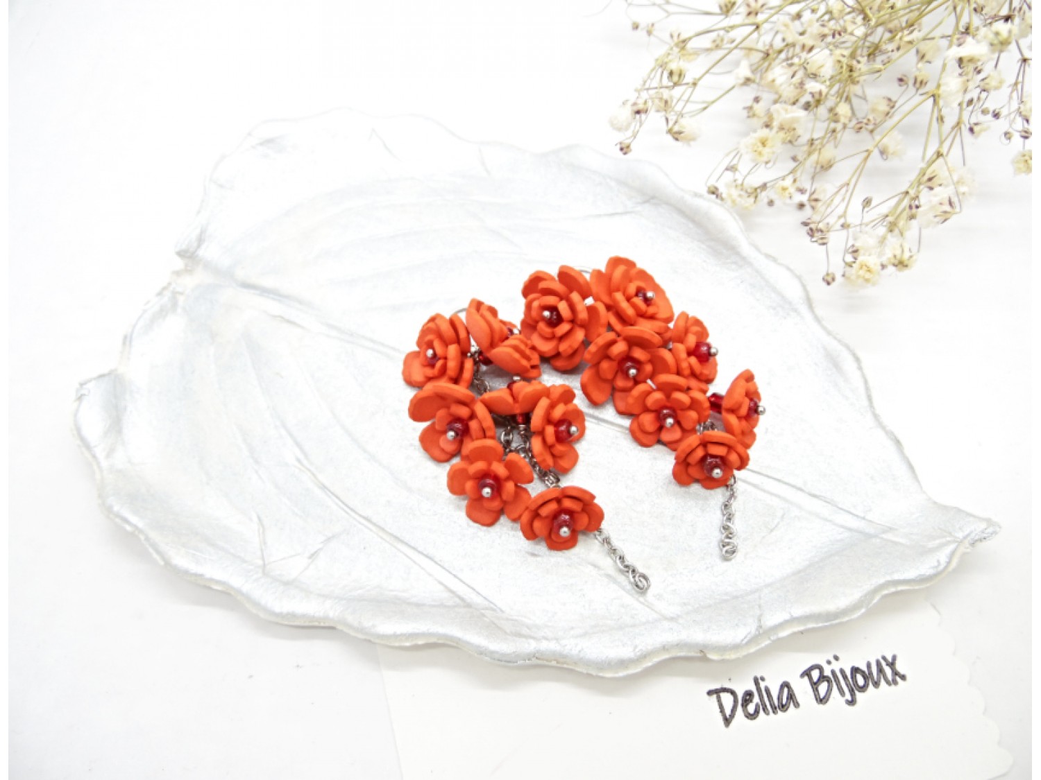 Adaugă un strop de natură și eleganță ținutelor tale cu acești cercei unicat, realizați manual din foamiran rosu, modelat cu grijă în formă de flori delicate. Fiecare floare are în mijloc o mărgica de nisip, oferind un plus de rafinament și strălucire discretă.