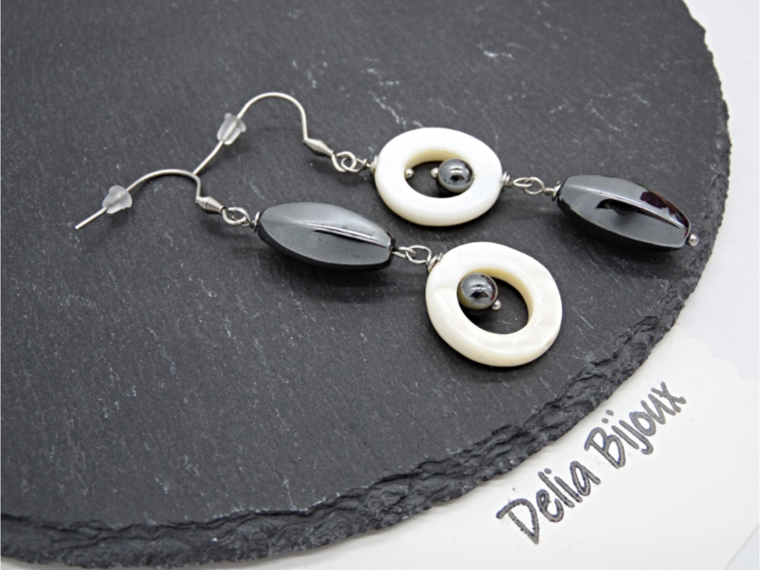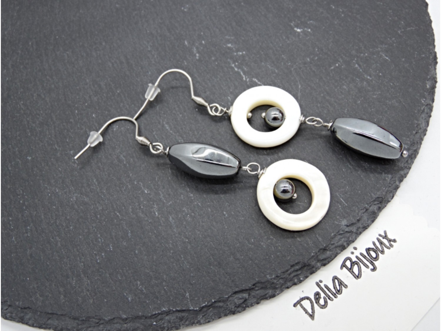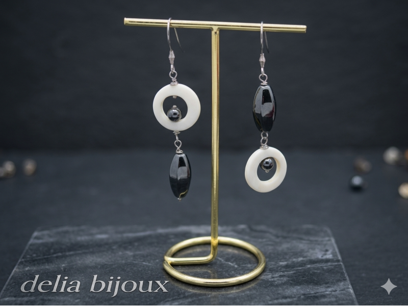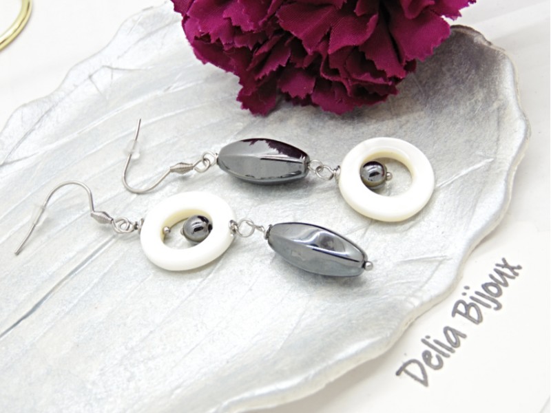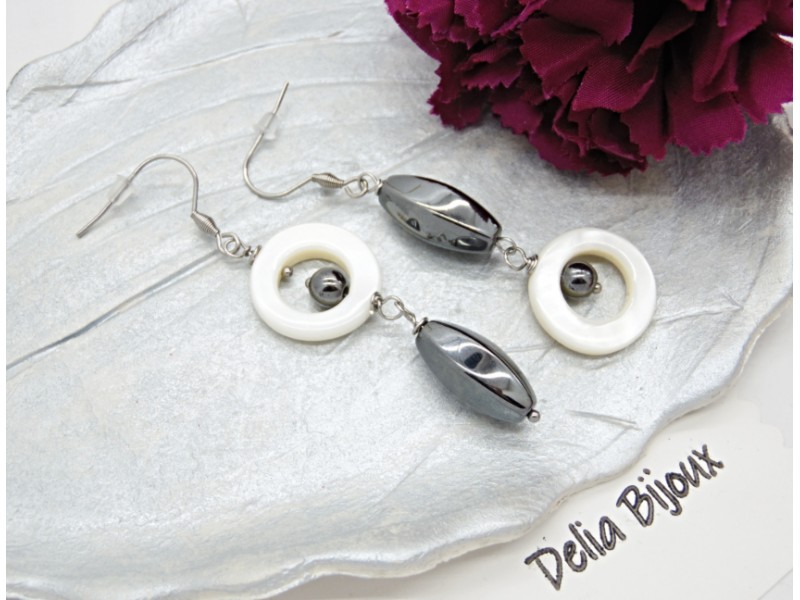 Cercei realizați manual, cu design asimetric modern, combinație elegantă de inele din sidef natural alb și mărgele din hematit, în forme ovale fațetate și sfere. Sideful oferă o strălucire delicată, naturală, iar hematitul adaugă un contrast sofisticat, ușor metalic.