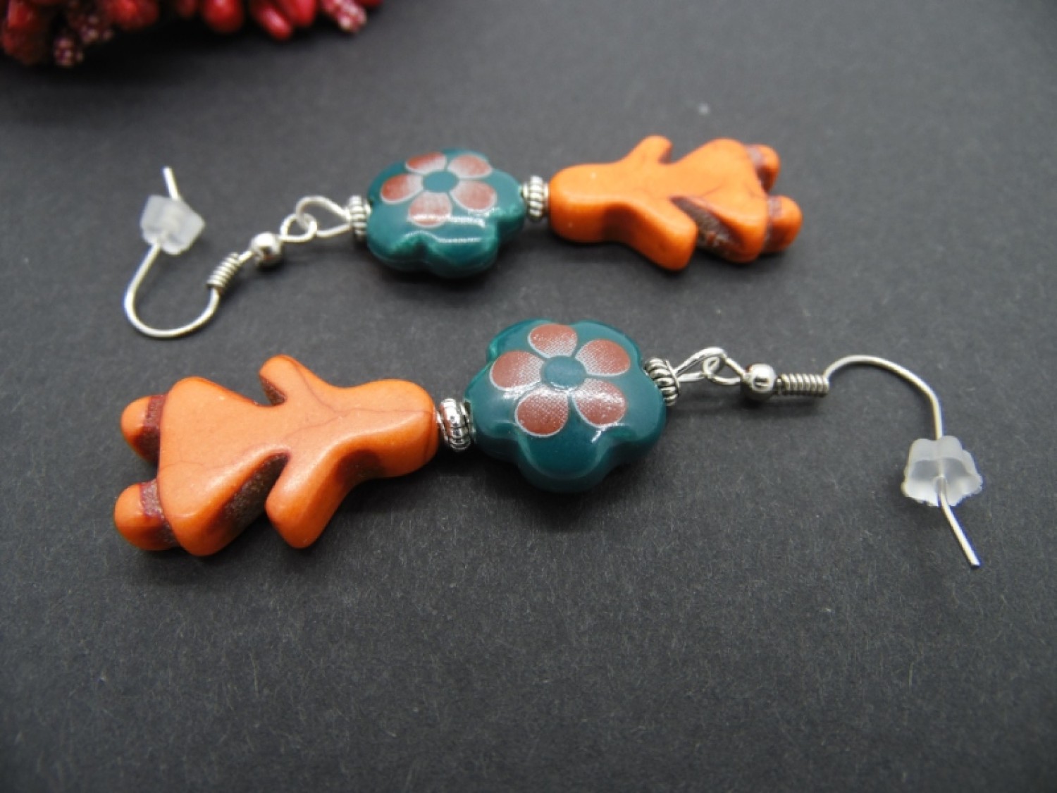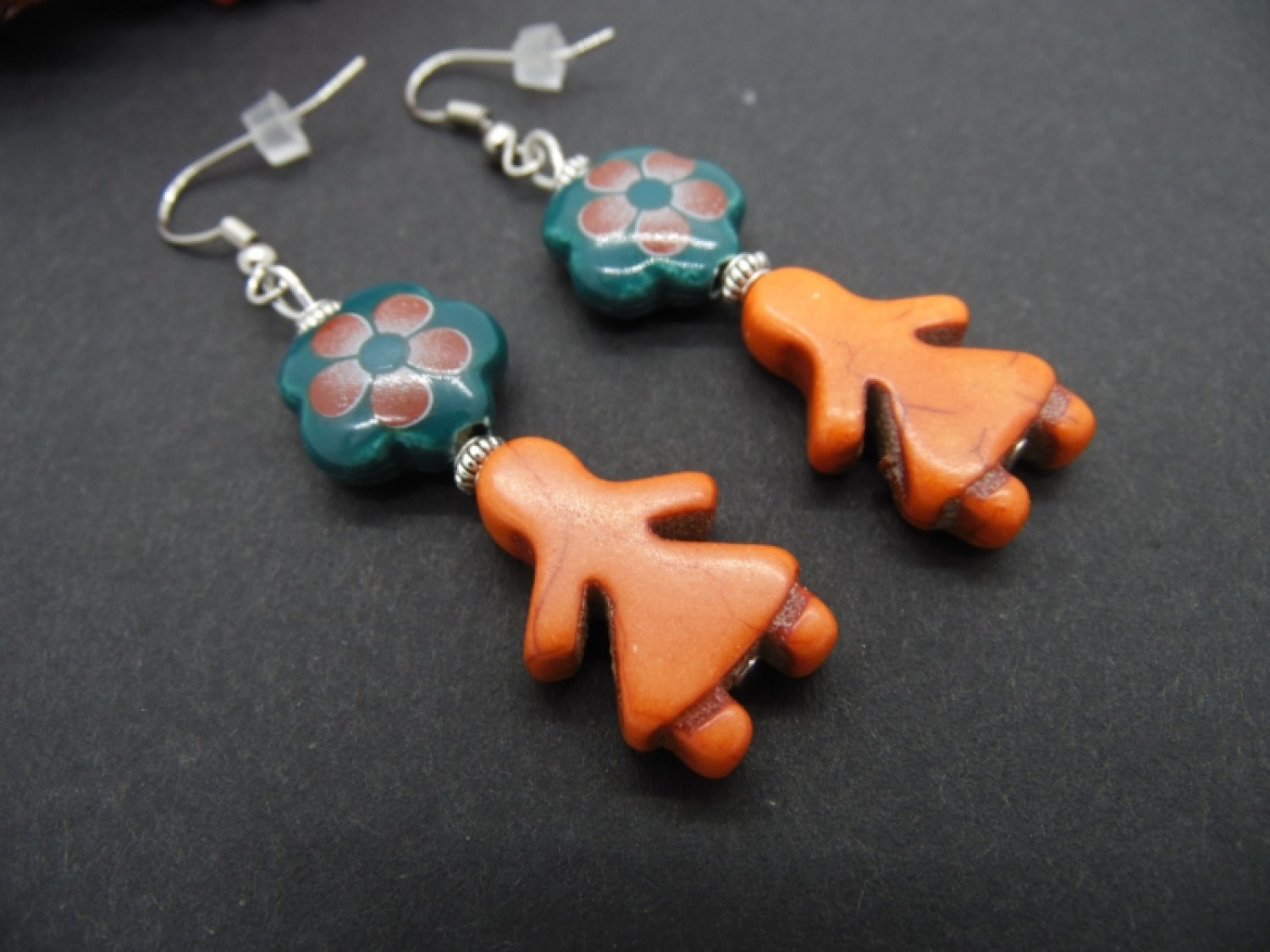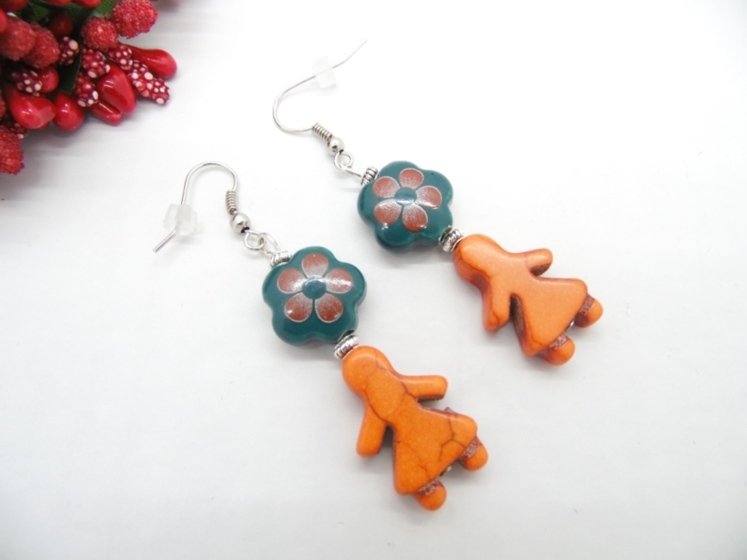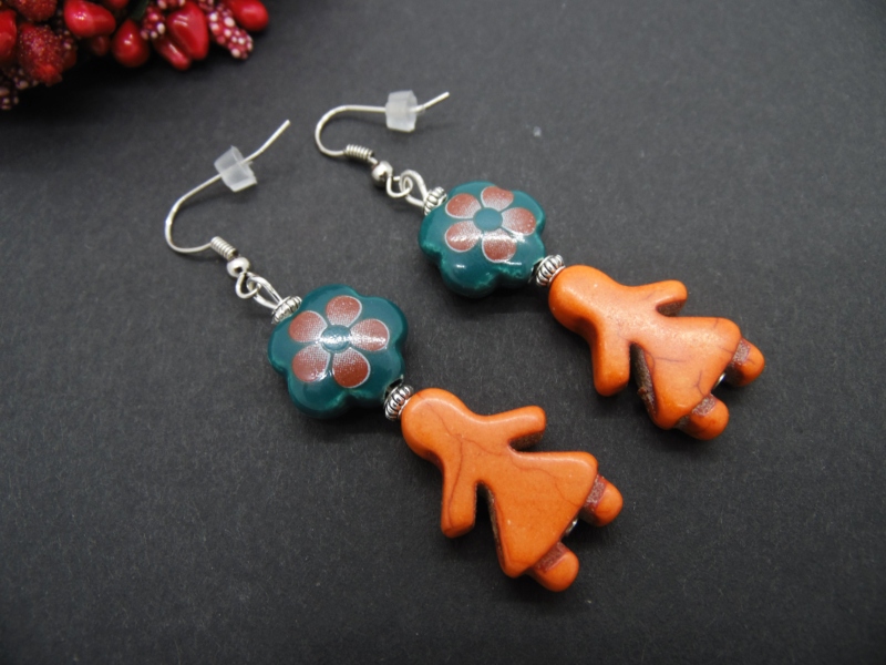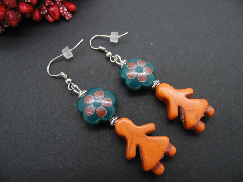 Cercei handmade realizati din flori ceramica (14 mm), howlite de sinteza (22 mm) si elemente metalice. Au dopuri de silicon.