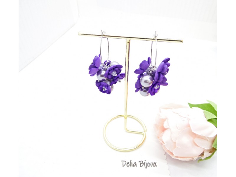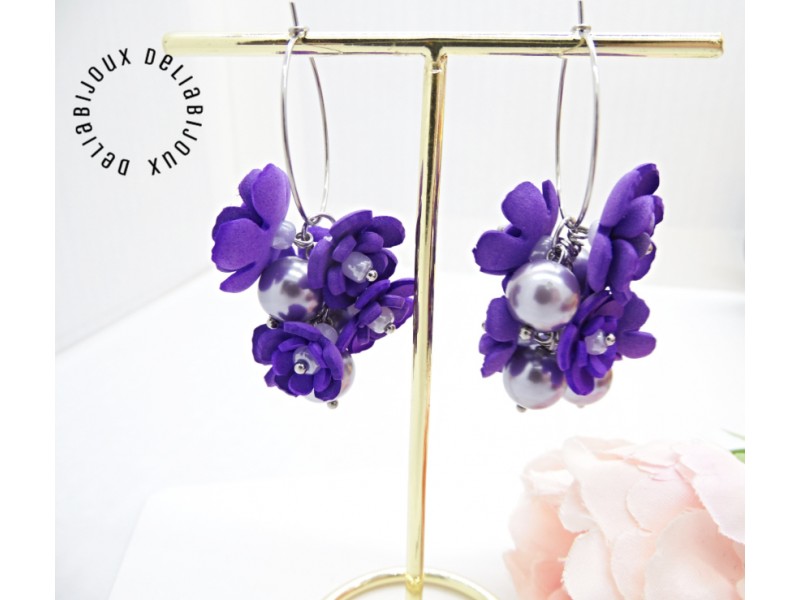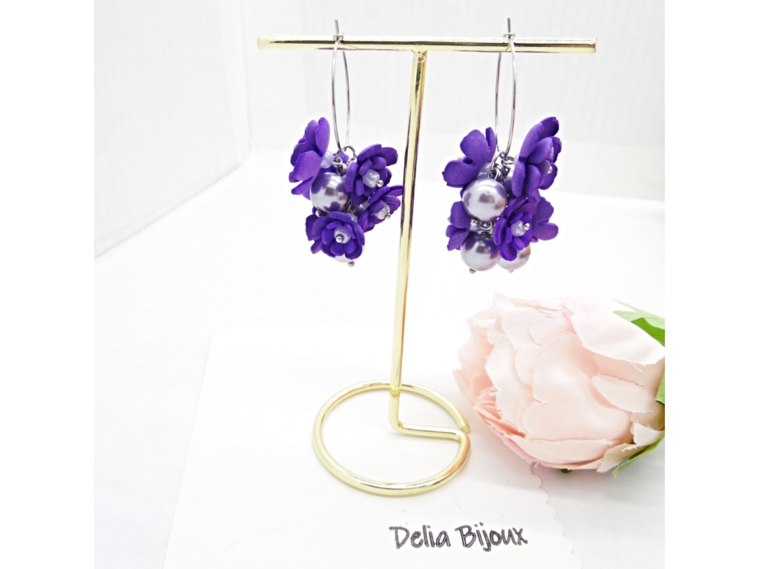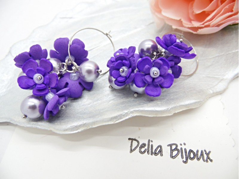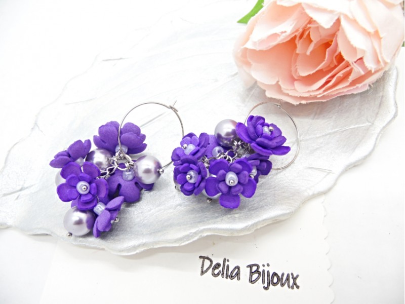 - Cod produs: Cercei handmade, flori mov si perle lila (cod1396)