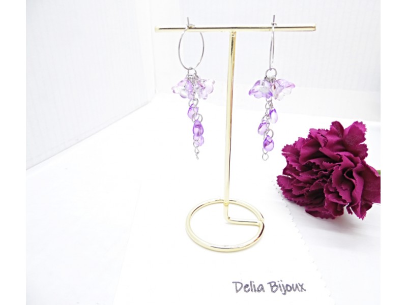 - Cod produs: Cercei handmade, lungi cu flori de sticla lila (cod1394)
