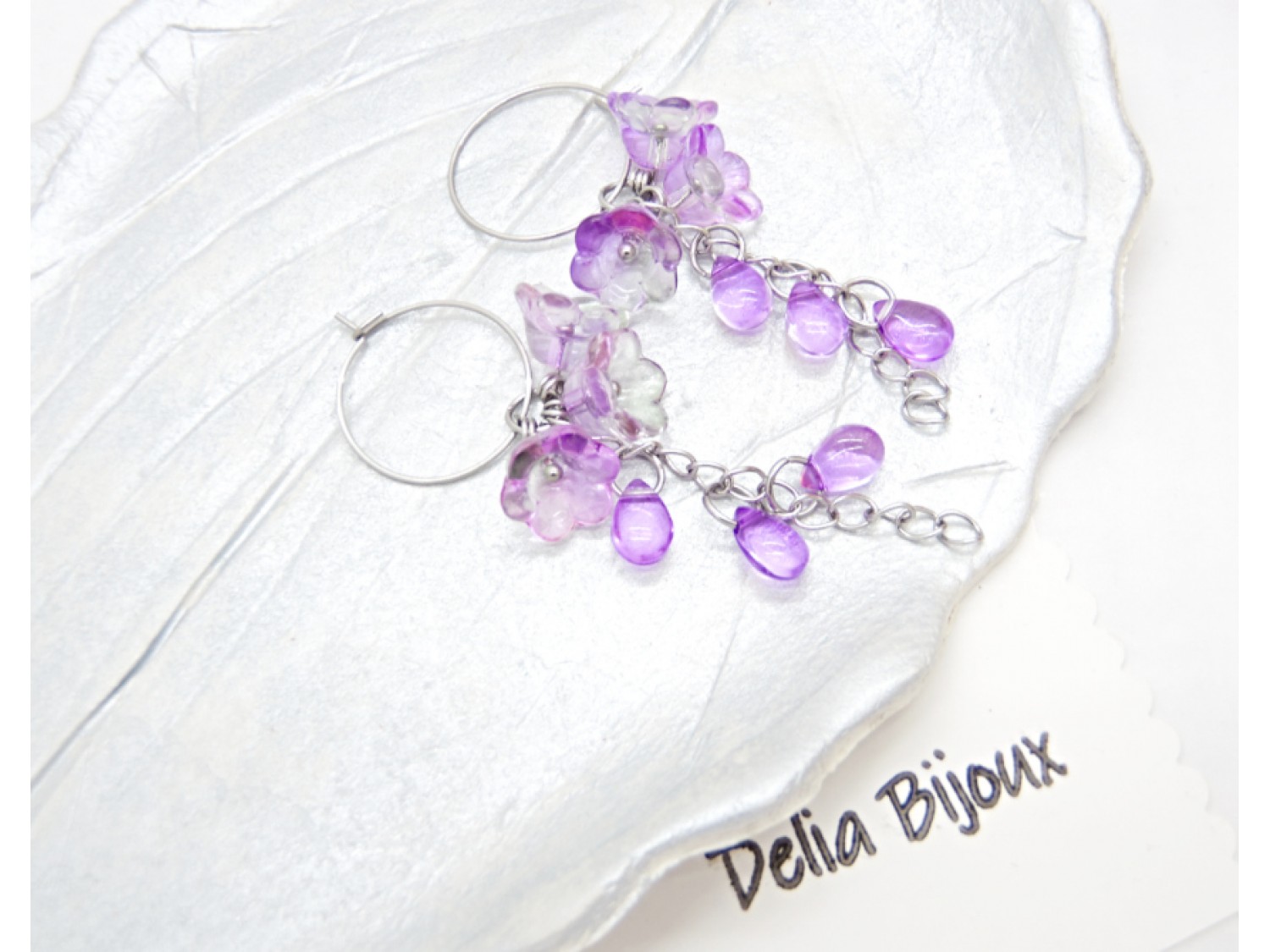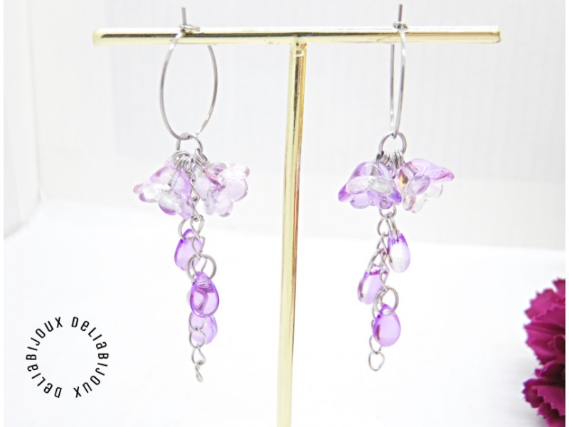 Cercei delicați, realizați cu mărgele din sticlă în nuanțe mov-liliachiu, în formă de flori și margele de sticla - picături translucide. Designul este feminin și romantic, cu elemente florale grupate în partea superioară și lanțuri fine de inox care susțin mărgele tip picătură, oferind mișcare și eleganță la fiecare purtare.
