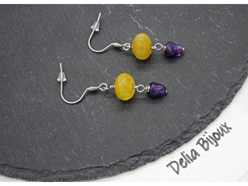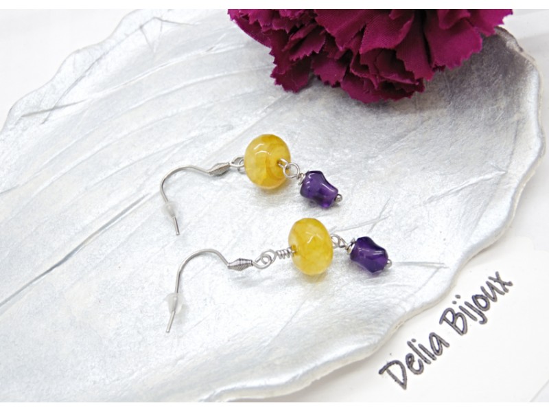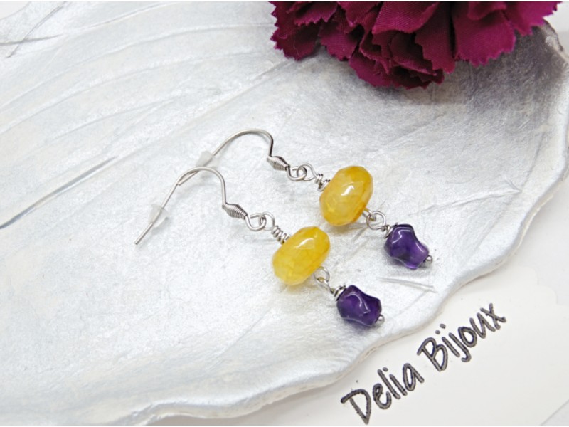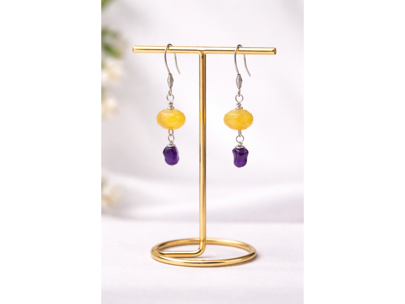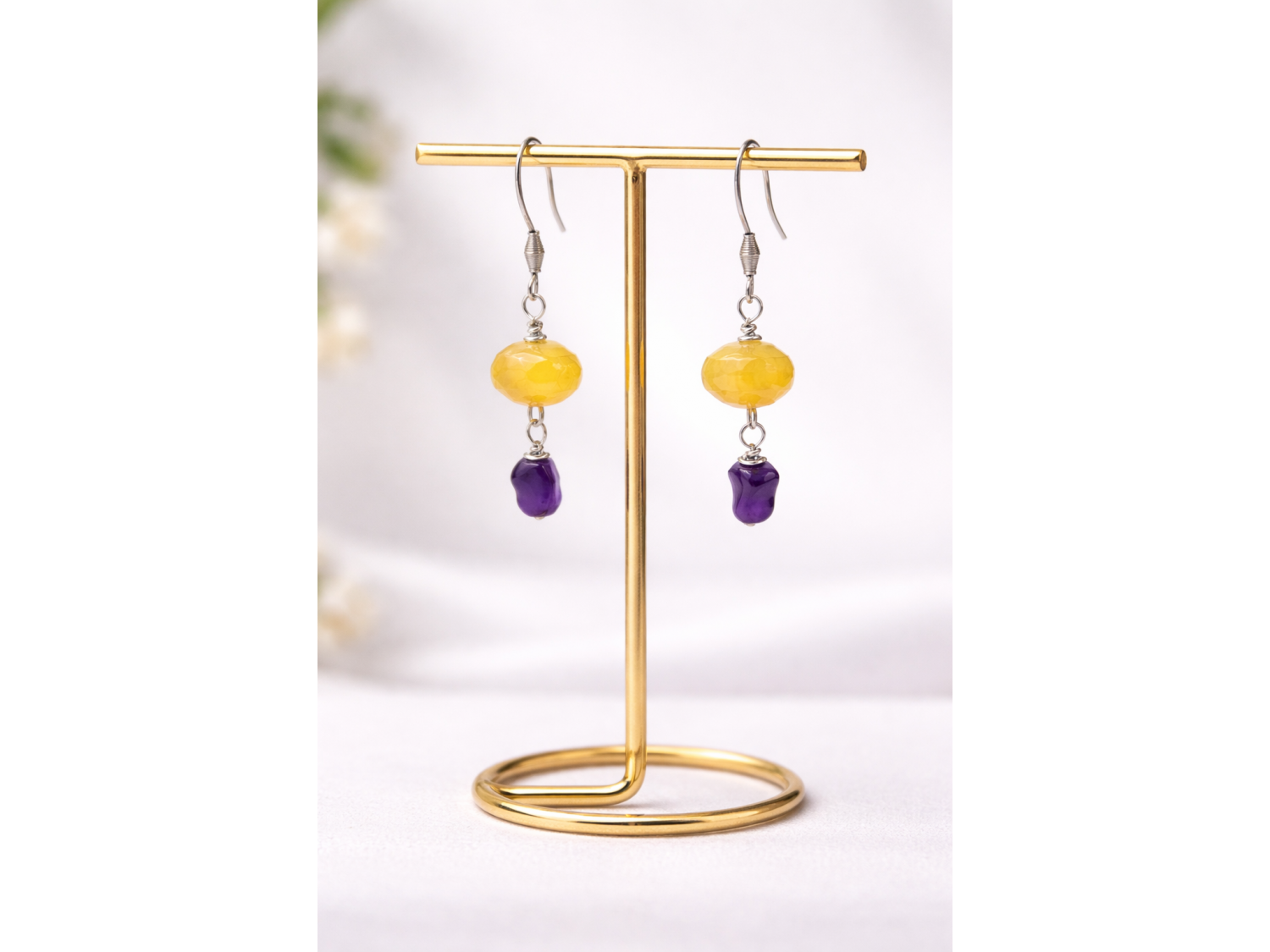 Cercei delicati, realizați manual, ce îmbină armonios energia caldă a agatului galben fațetat cu farmecul natural al ametistului în formă liberă (free form). Designul este simplu și elegant, punând în valoare frumusețea autentică a pietrelor.
