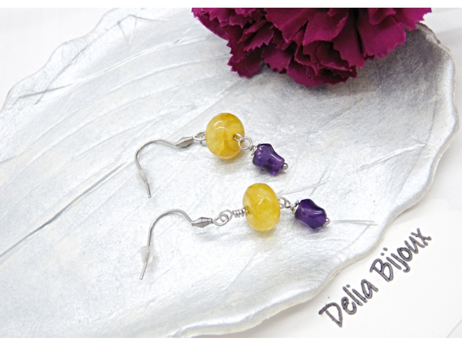 Agatele galbene, atent fațetate, reflectă lumina într-un mod subtil, aducând o notă luminoasă și veselă, în timp ce ametistul, cu formele sale organice, adaugă un contrast sofisticat și unic fiecărei perechi.