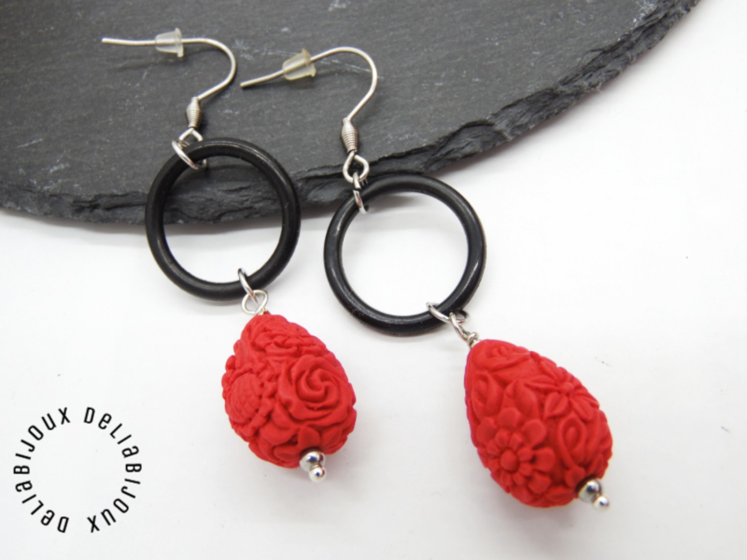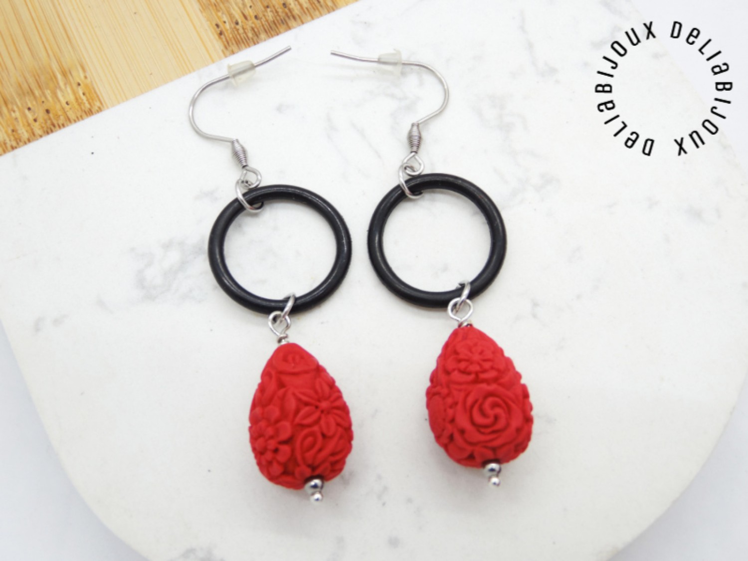Acești cercei statement combina perfect estetica industrială cu eleganța vibrantă a cinabrului roșu. Realizați din inele negre de cauciuc și decorați cu mărgele roșii în formă de picături, acești cercei atrag imediat atenția prin contrastul dintre materialele neașteptate și designul expresiv. Picăturile de cinabru adaugă o notă de culoare intensă și rafinată, iar forma lor alungită aduce mișcare și dinamism fiecărui pas. Perfecți pentru a adăuga o notă îndrăzneață și modernă oricărei ținute, acești cercei sunt ideali pentru iubitoarele de accesorii unice și pline de personalitate.