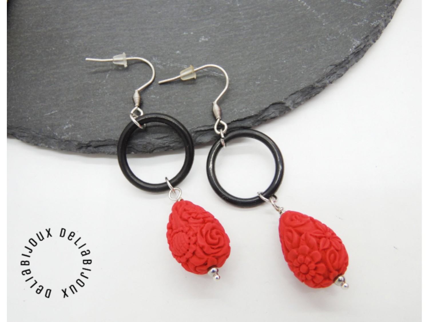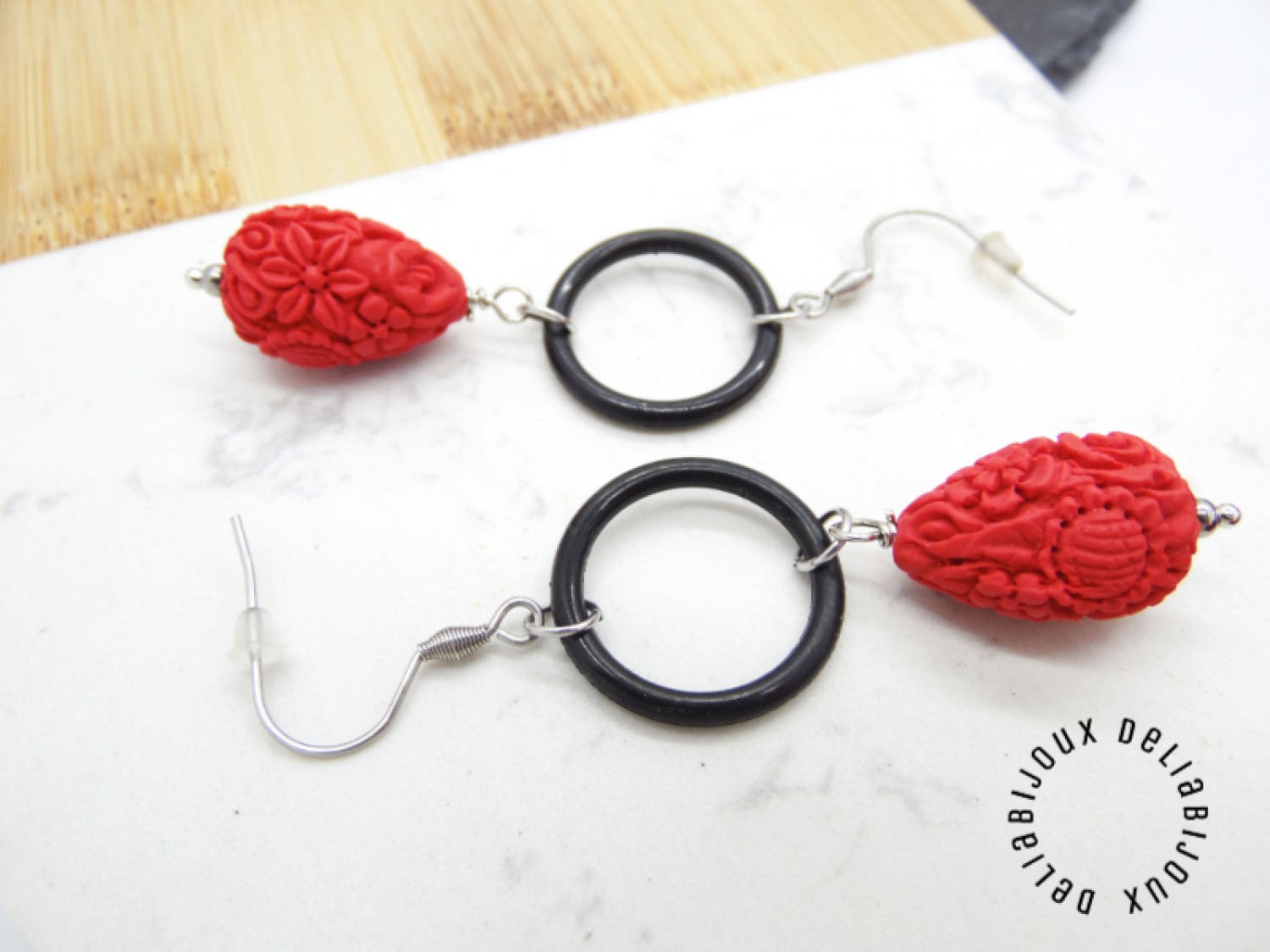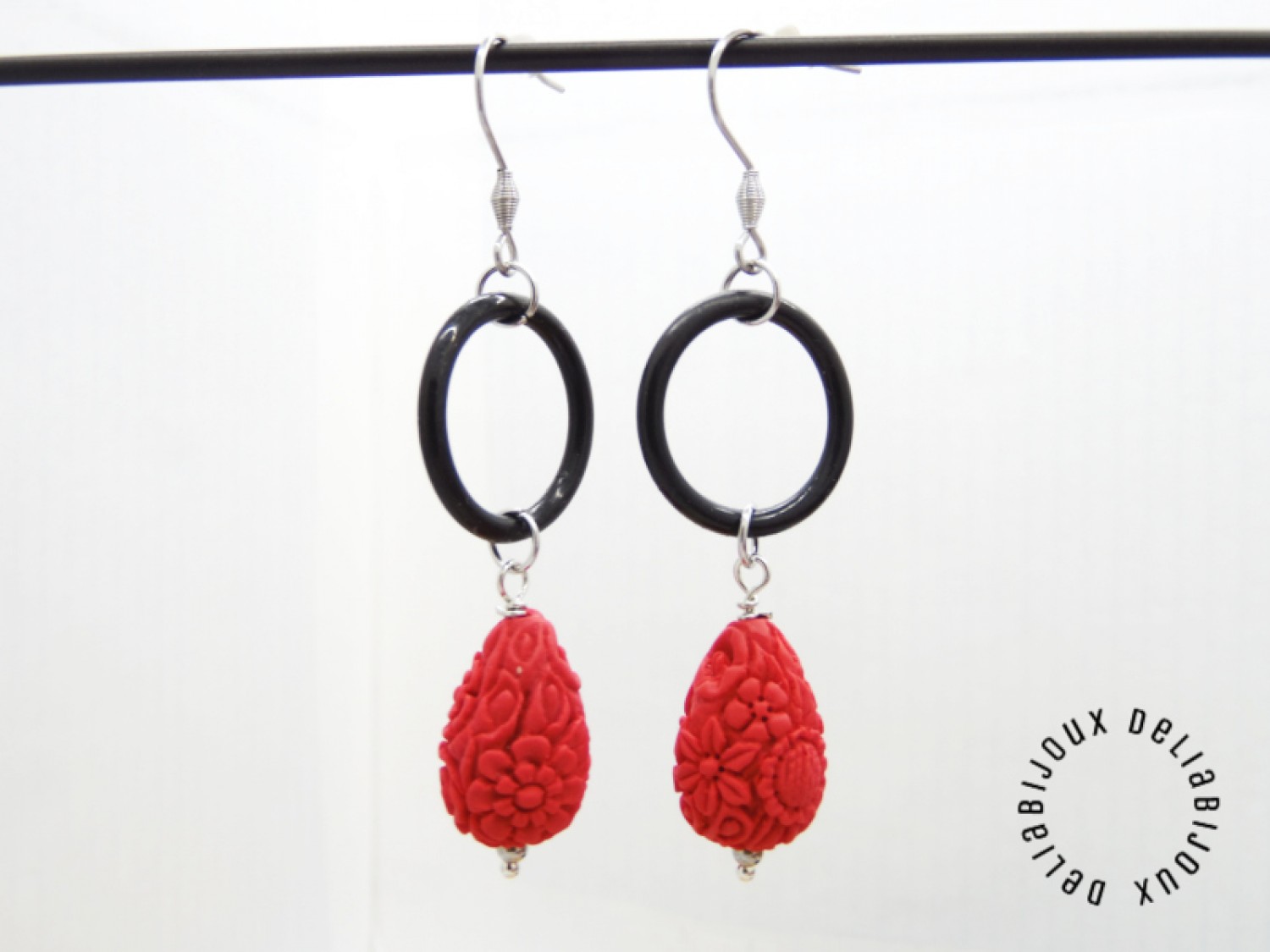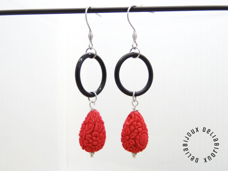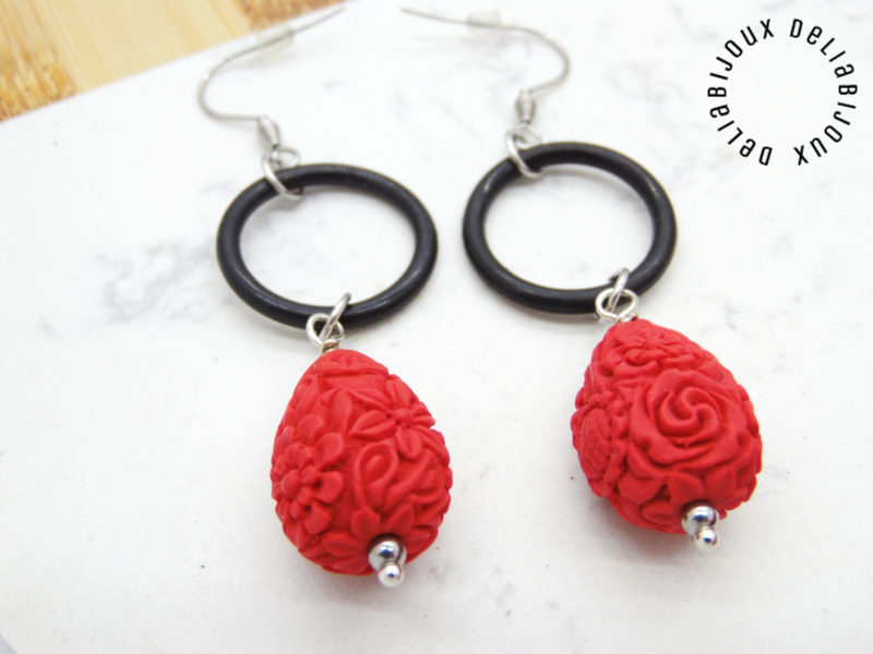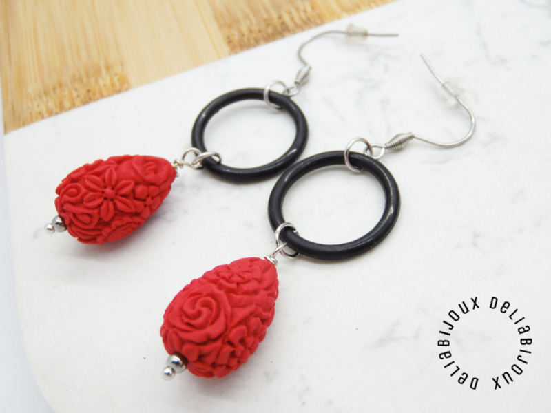 Cercei statement, lungi, realizati din cinabru sculptat in forma de lacrima (imitatie - 20.5 mm x 14 mm), inele de cauciuc (22 mm), bile inox (3 mm), tortite din otel inoxidabil, elemente metalice otel inoxidabil si dopuri de silicon.