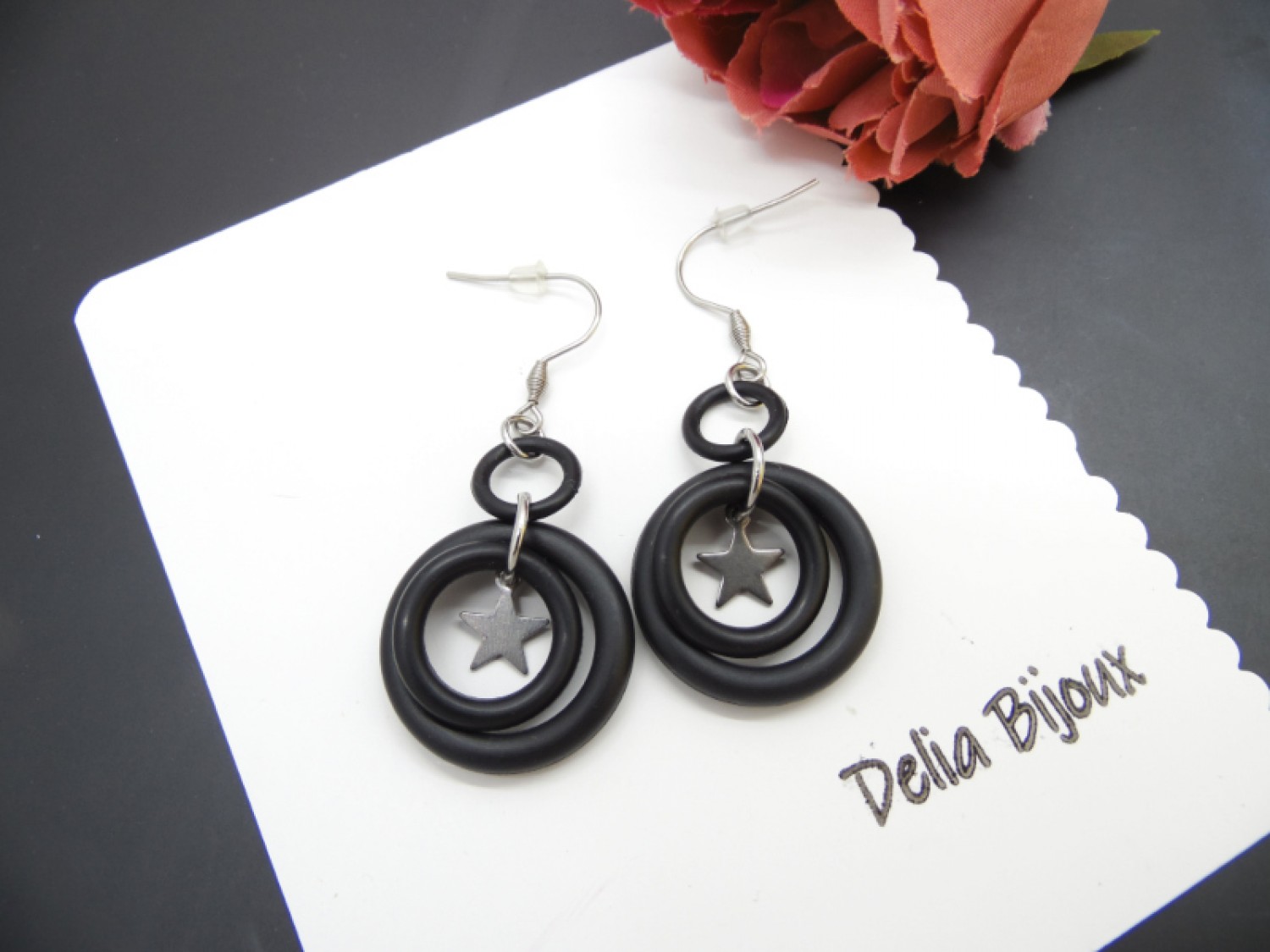 În centrul fiecărei piese se află o mică stelută din oțel inoxidabil, adăugând un contrast subtil, dar sofisticat, între textura cauciucului și reflexiile metalice ale oțelului. Ușori și confortabili, acești cercei sunt o alegere perfectă pentru cei care apreciază accesoriile moderne cu o notă de originalitate.