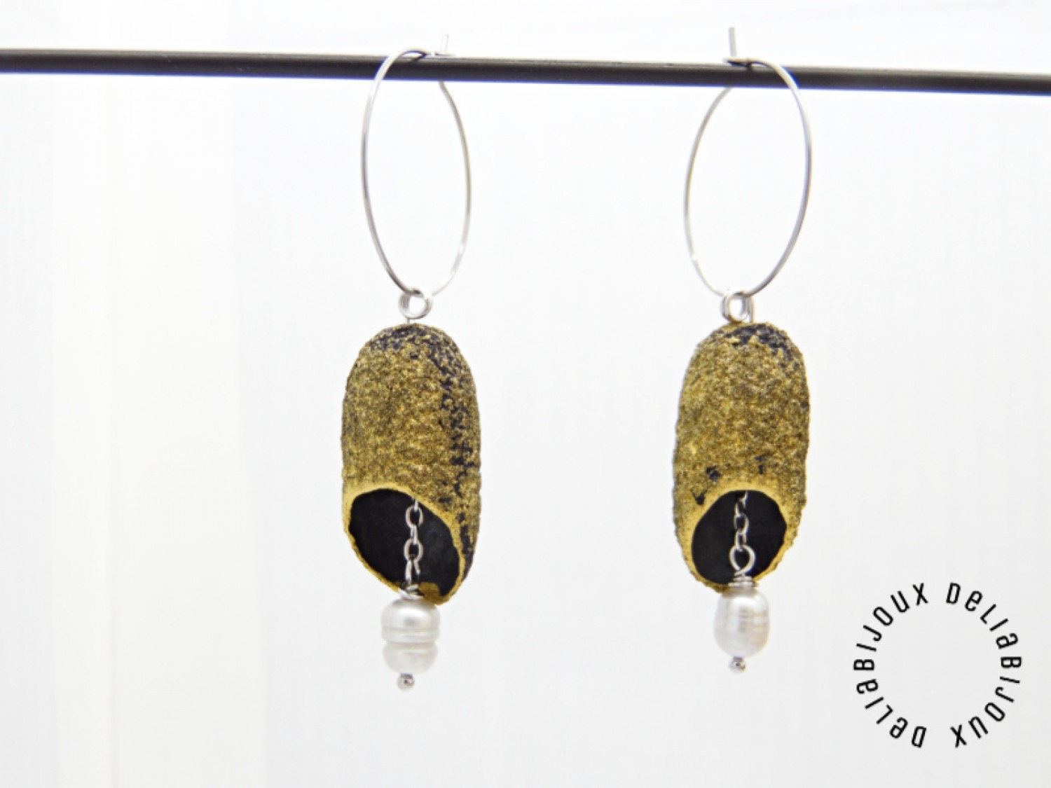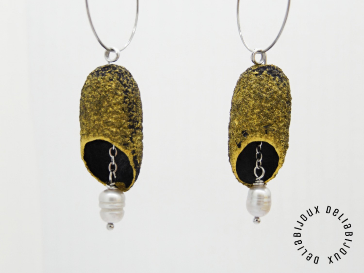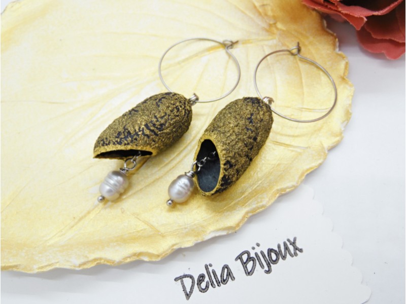 Cercei statement, lungi, usor asimetrici, realizati din coconi de matase naturala (~3 cm x 1.5 cm; marimea este aproximativa, pot exista mici diferente de marime si textura intre coconi, nefiind identici), perle de cultura (forma neregulata 7-8 mm), lant inox, tortite din otel inoxidabil, elemente metalice din otel inoxidabil.