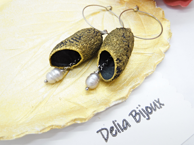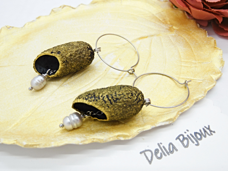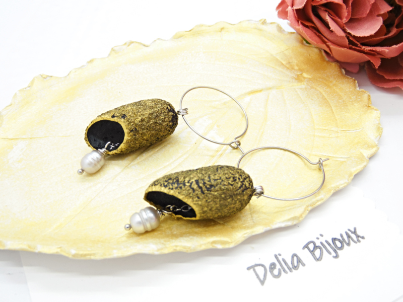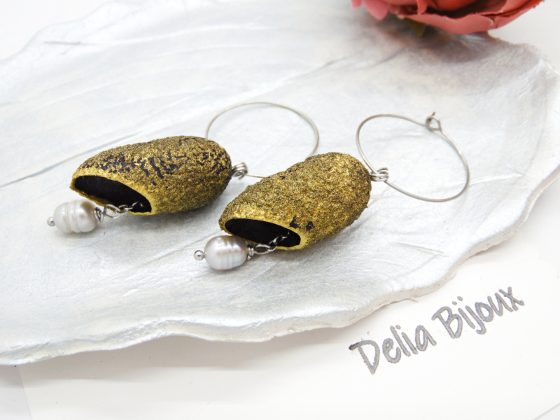 Această pereche de cercei unicat este realizată manual din coconi de mătase gri, vopsiți cu accente delicate de auriu acrilic, ce le oferă un aer sofisticat și plin de strălucire.