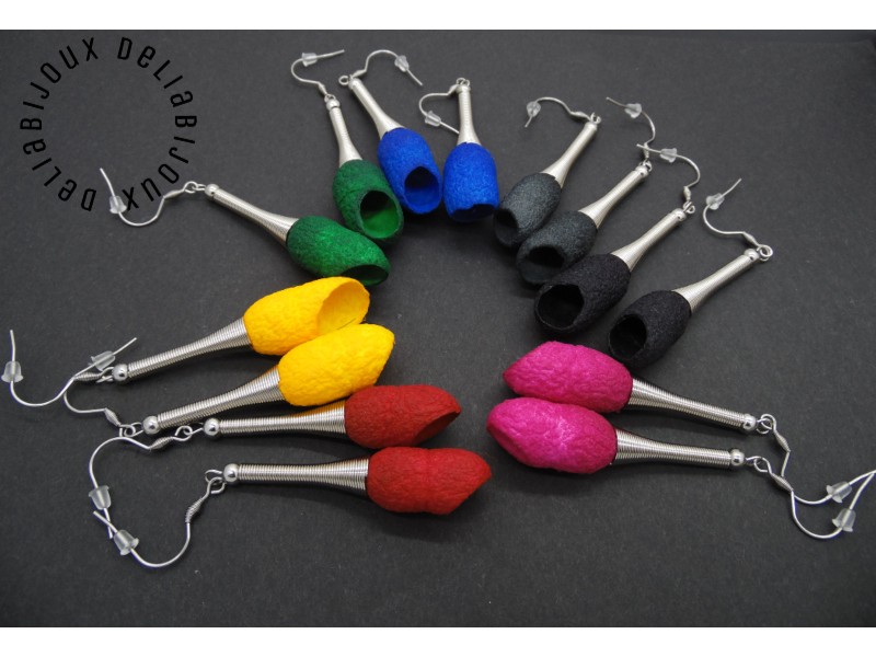 Cercei statement, lungi, realizati din coconi de matase naturala (~3 cm x 1.5 cm; marimea este aproximativa, pot exista mici diferente de marime si textura intre coconi, nefiind identici), bile de inox (5 mm), margele ovale de hematit ( se afla in interiorul coconilor - 5 mm), tortite din otel inoxidabil, elemente metalice si dopuri de silicon.