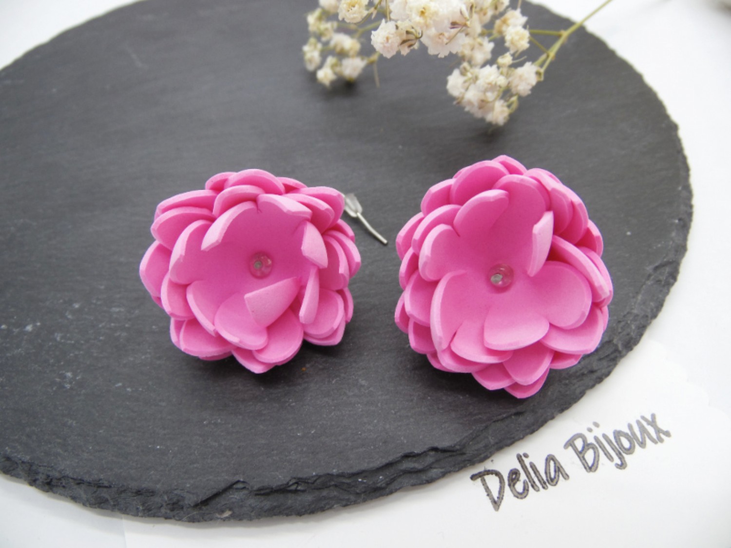 Acești cercei handmade statement din foamiran roz sunt o celebrare a delicateții și frumuseții naturale. Fiecare floare este decupată și modelată manual, cu petale fine ce imită textura și forma unei flori reale. Nuanța de roz pal aduce un aer romantic și subtil, evocând prospețimea primăverii.