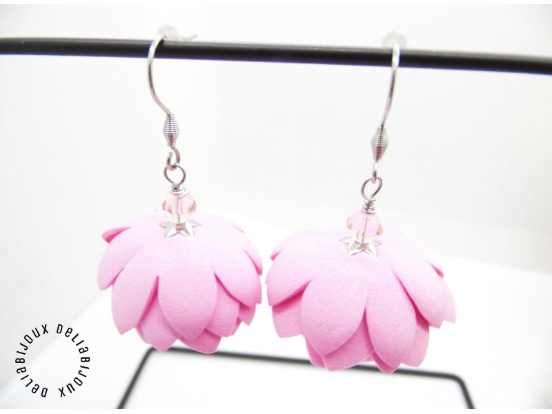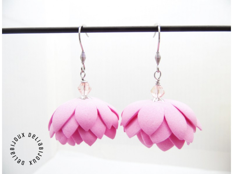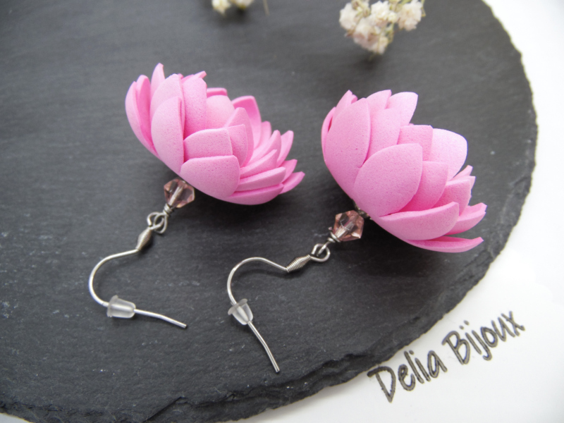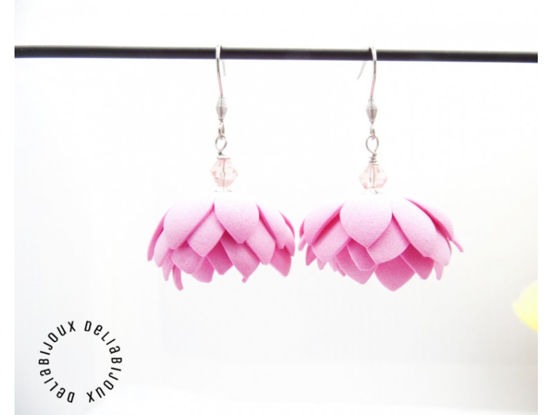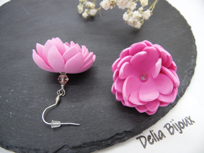 Cercei statement cu flori, unicat, usor asimetrici, realizati din foamiran taiat manual si modelat (diametrul florilor intre 3 cm - 3.2 cm), cristale de sticla fatetate (6 mm), margele de nisip (3 mm), tortite din otel inoxidabil, elemente metalice din otel inoxidabil.