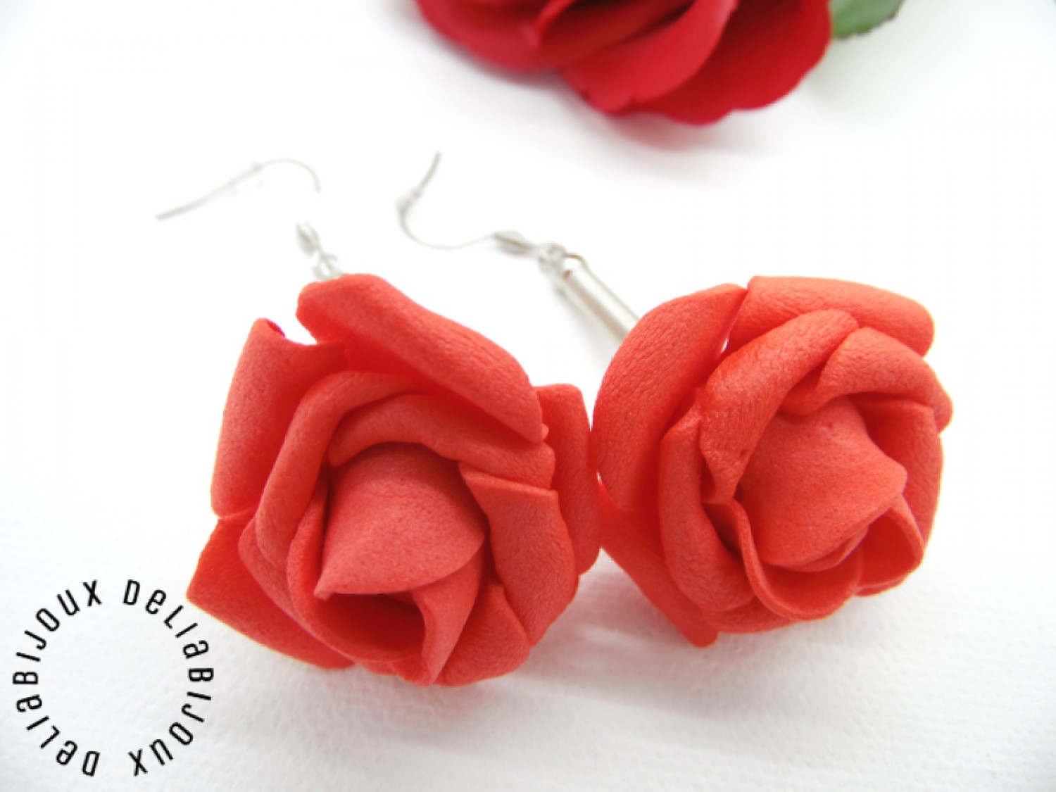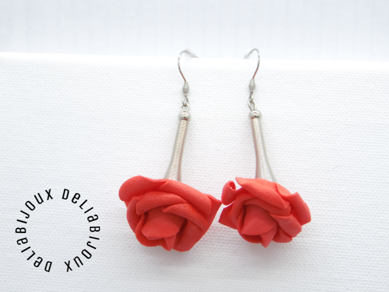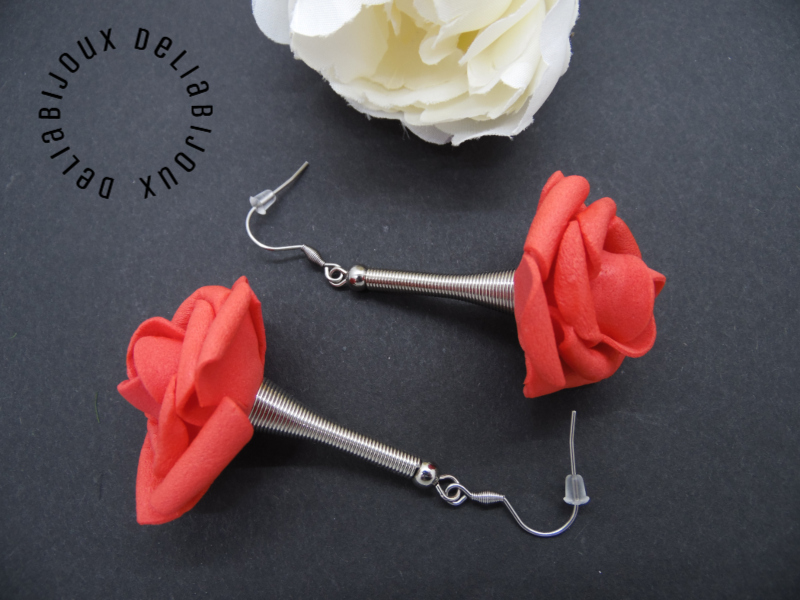 Această pereche de cercei handmade unicat este cu adevărat specială datorită materialului din care au fost realizați și a formei lor. Acești cercei au fost confecționați din foamiran rosu, care a fost tăiat manual si modelat sub formă de flori. Această particularitate face ca acești cercei să fie unici, usori și irepetabili.