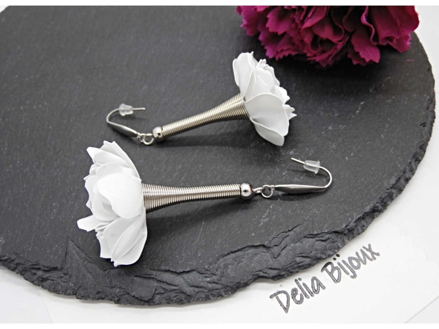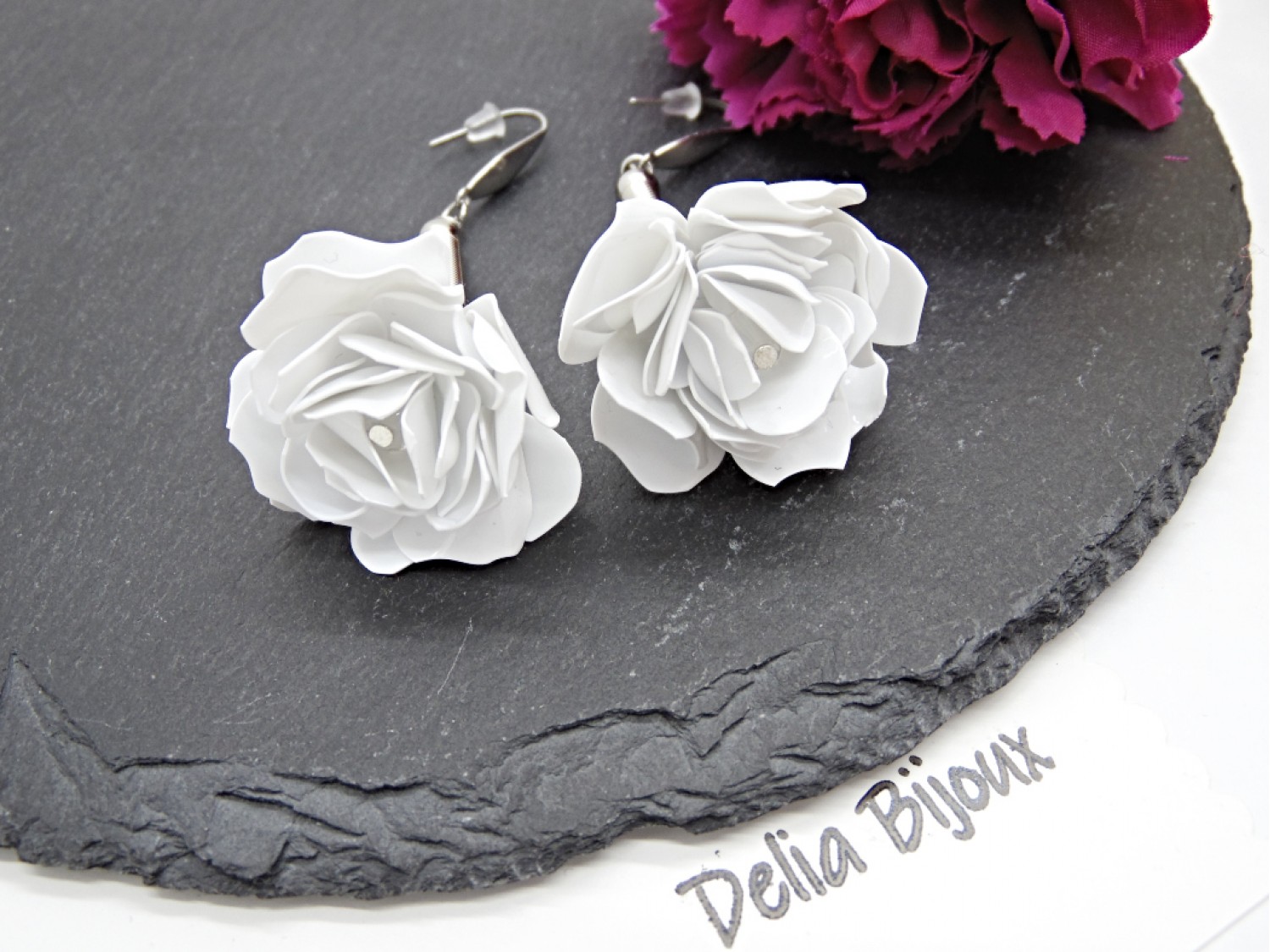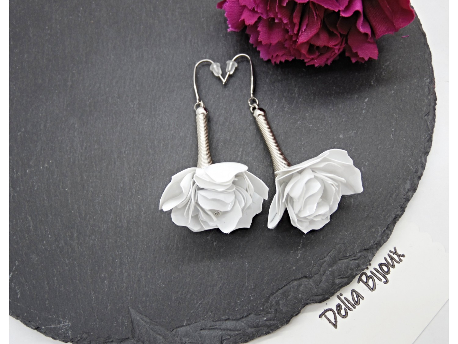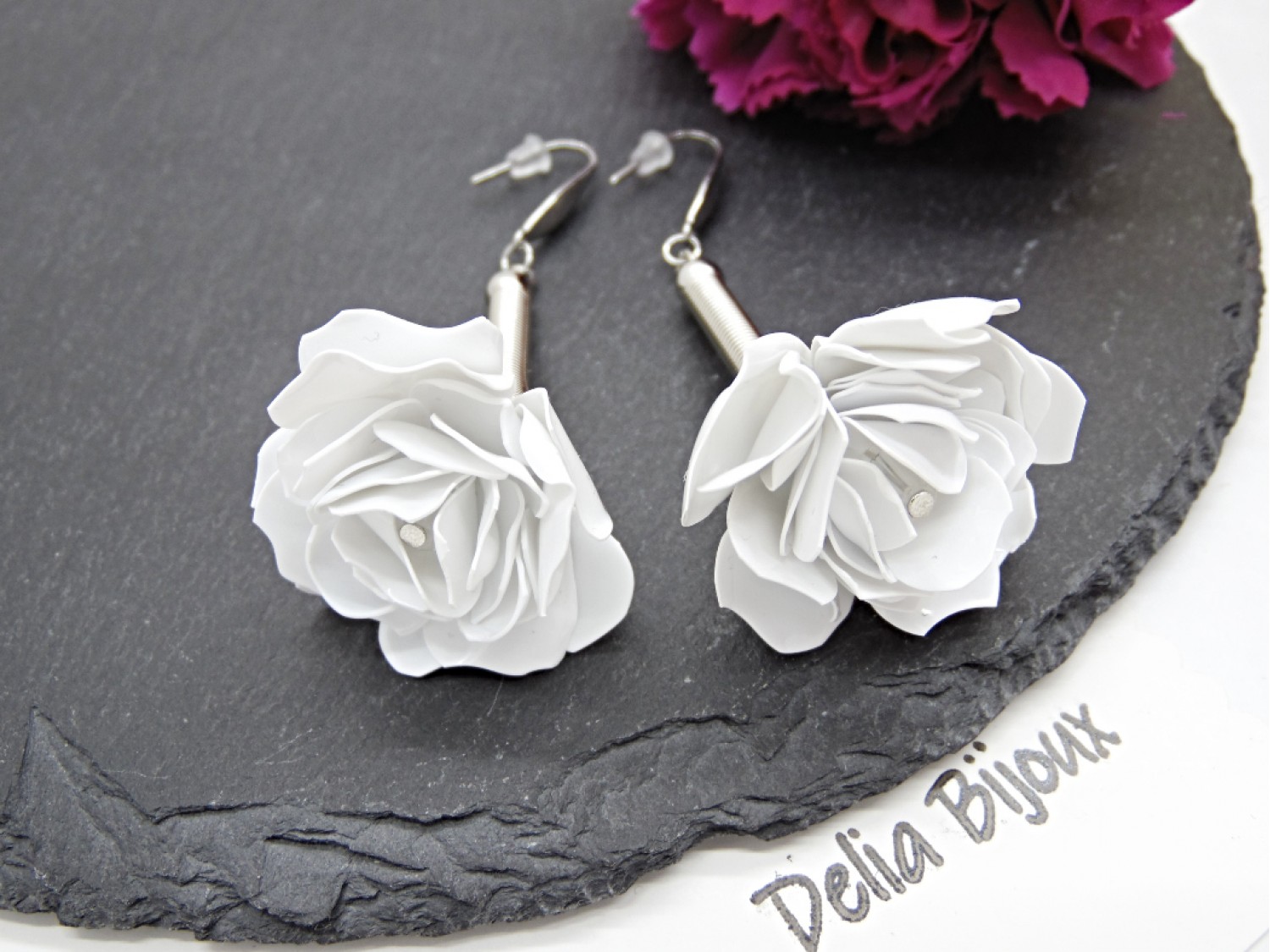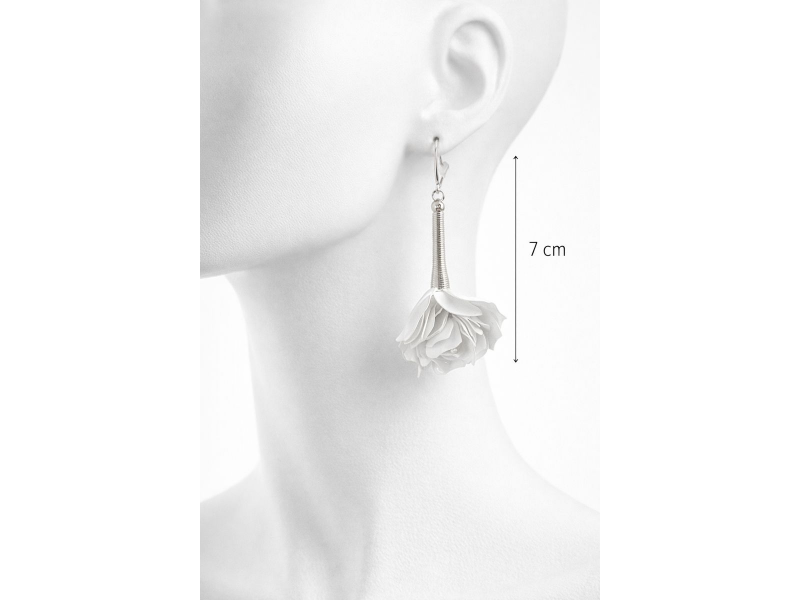 Cercei handmade din plastic reciclat, realizați manual din caserole albe reciclate, transformați prin tehnici de tăiere și modelare într-o pereche delicată de trandafiri albi. Fiecare floare este modelată manual, petală cu petală, rezultând o bijuterie unicat, cu aspect fin și elegant.