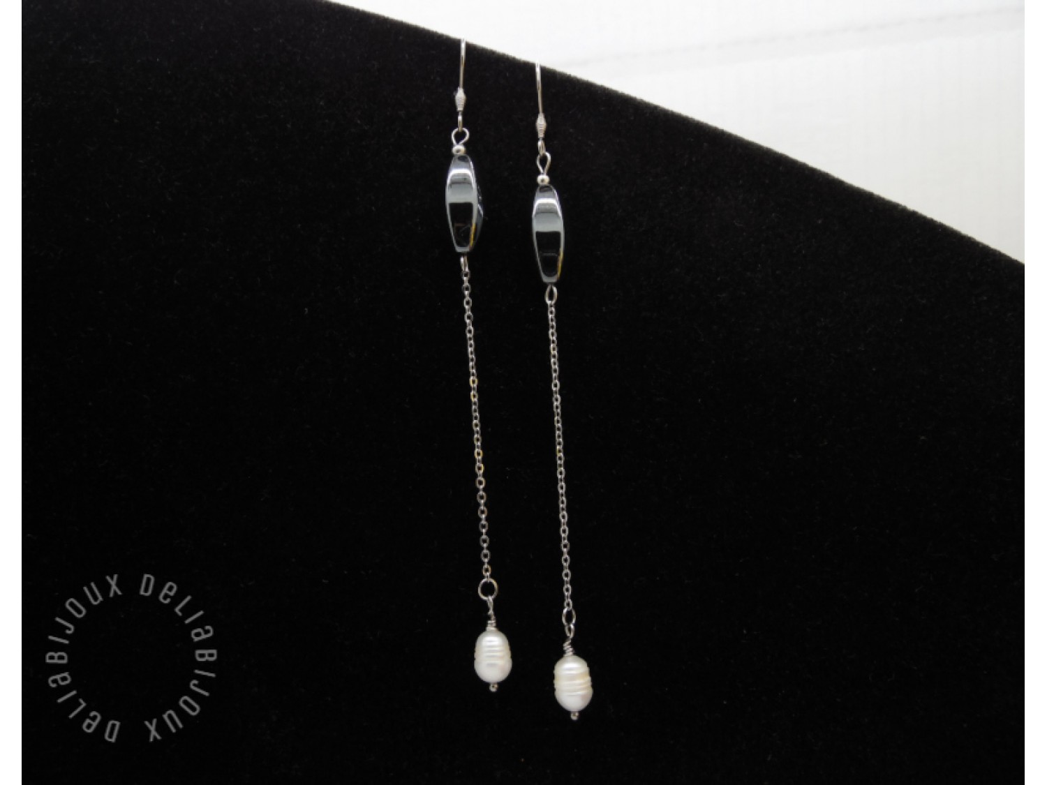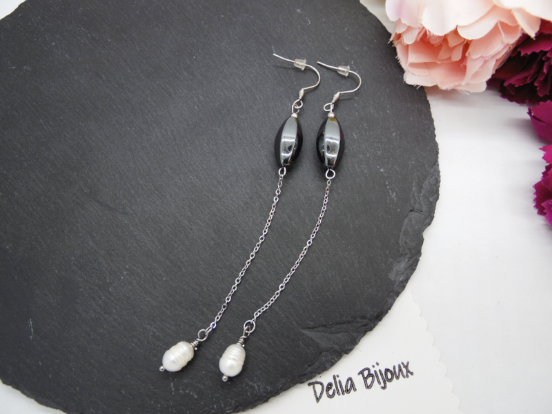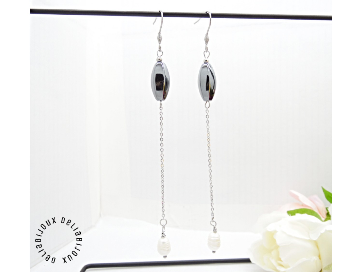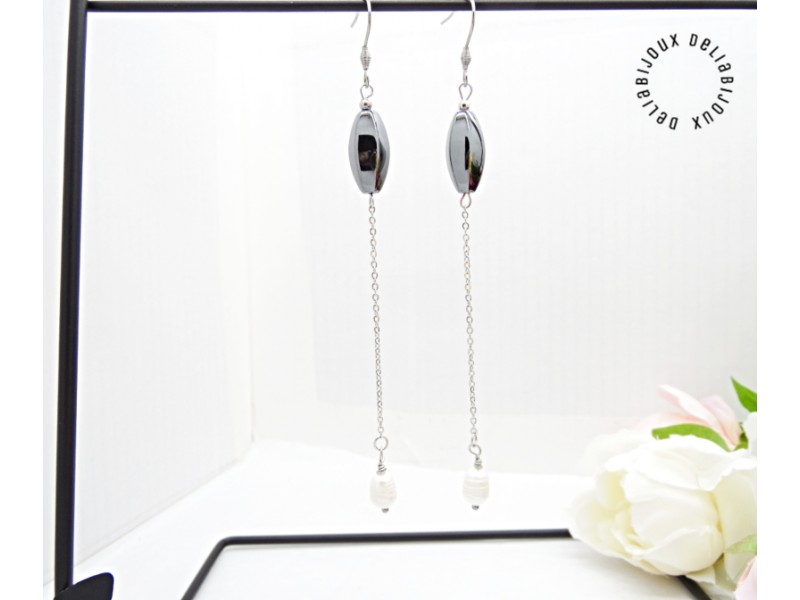 Cercei lungi, eleganti, realizati din hematit fatetat oval (20 mm x 9 mm), perle de cultura naturale - forma neregulata ( 10 - 11mm - perlele naturale de cultura difera ca aspect intre ele, fiecare fiind unica), bile inox (3 mm), , lant otel inoxidabil si elemente metalice din otel inoxidabil. Tortitele sunt din otel inoxidabil.