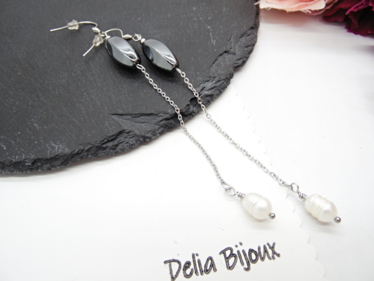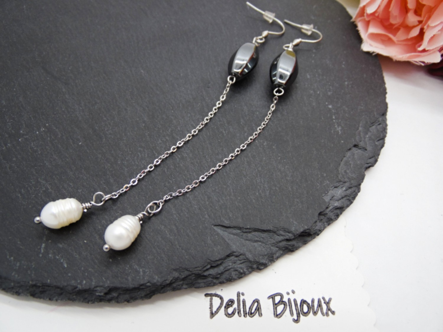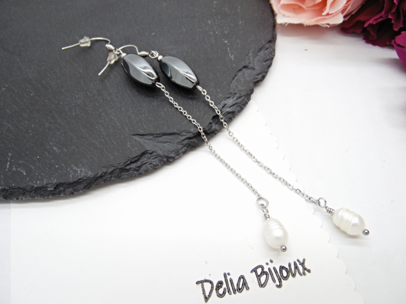 Cercei lungi, eleganti, realizati din hematit fatetat oval (20 mm x 9 mm), perle de cultura naturale - forma neregulata ( 10 - 11mm - perlele naturale de cultura difera ca aspect intre ele, fiecare fiind unica), bile inox (3 mm), , lant otel inoxidabil si elemente metalice din otel inoxidabil. Tortitele sunt din otel inoxidabil.