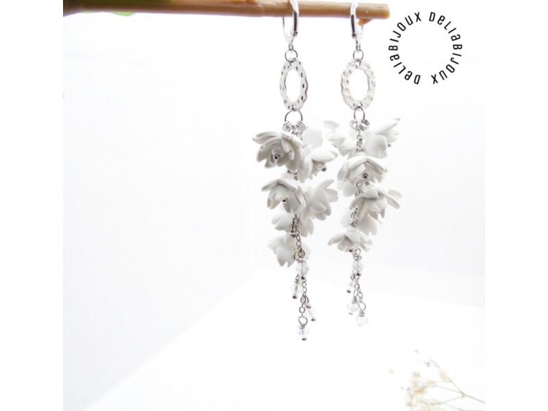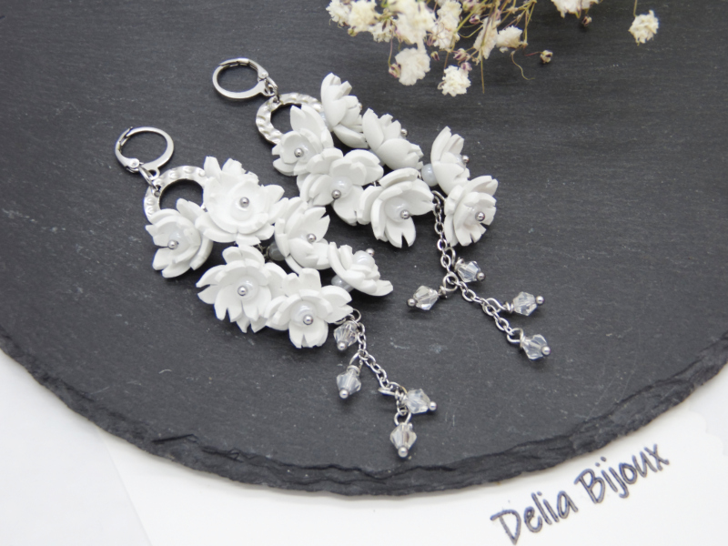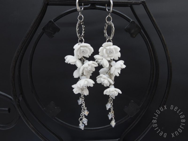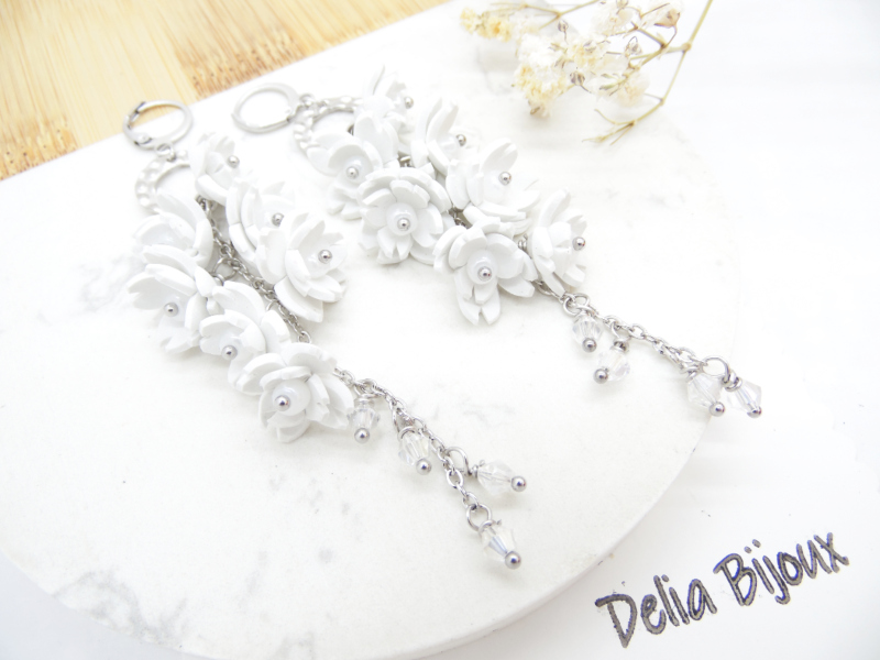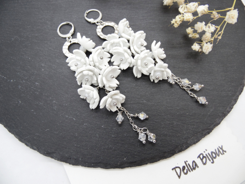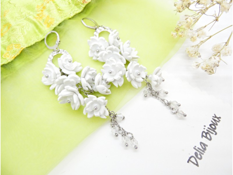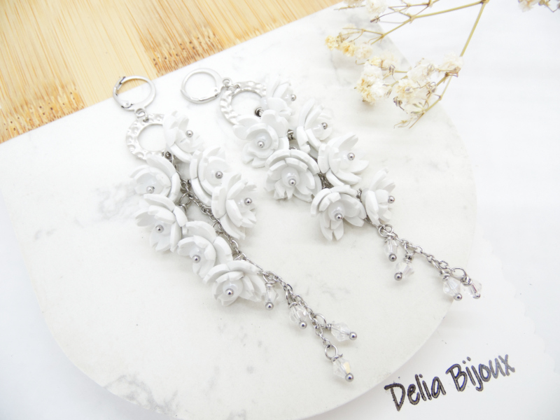 Acești cercei statement lungi cu flori albe sunt realizați manual cu migală, din foamiran alb, tăiat și modelat sub forma unor flori delicate.