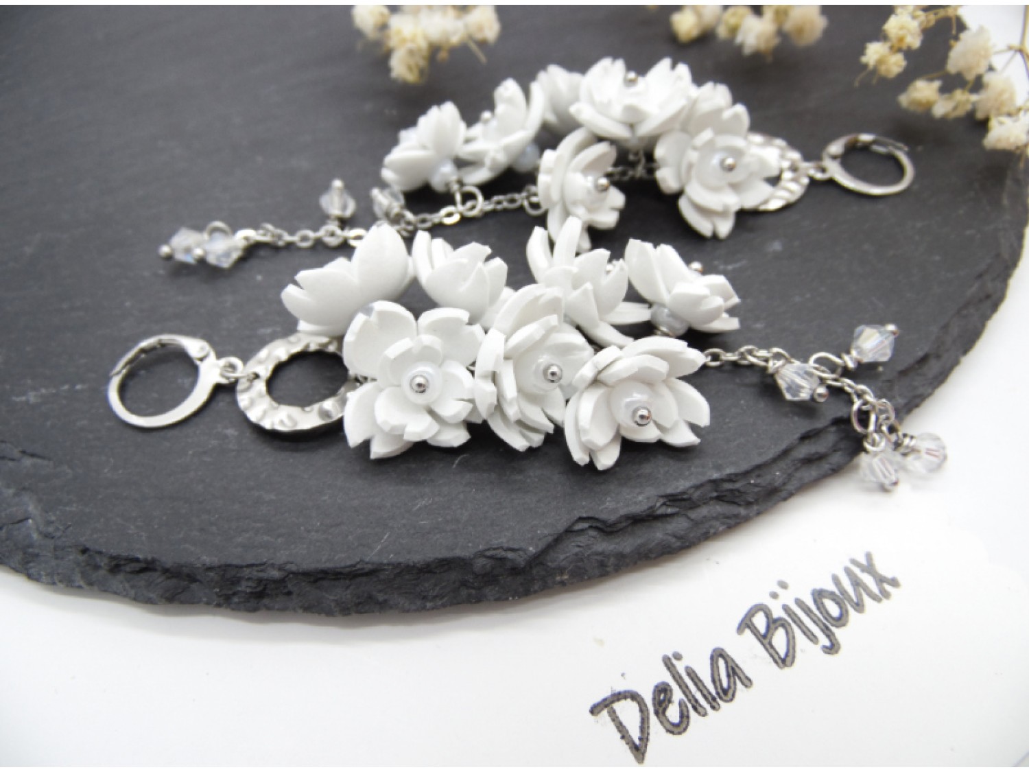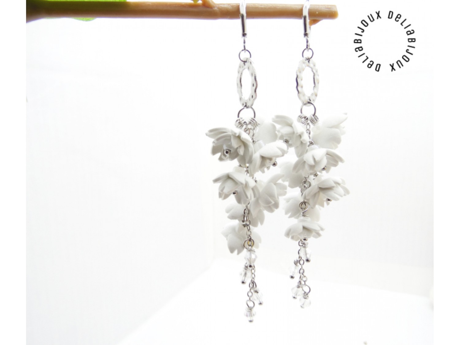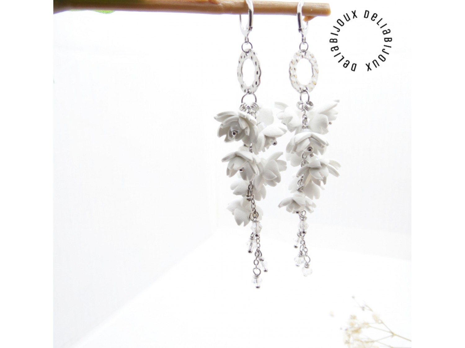 Acești cercei statement lungi cu flori albe sunt realizați manual cu migală, din foamiran alb, tăiat și modelat sub forma unor flori delicate.