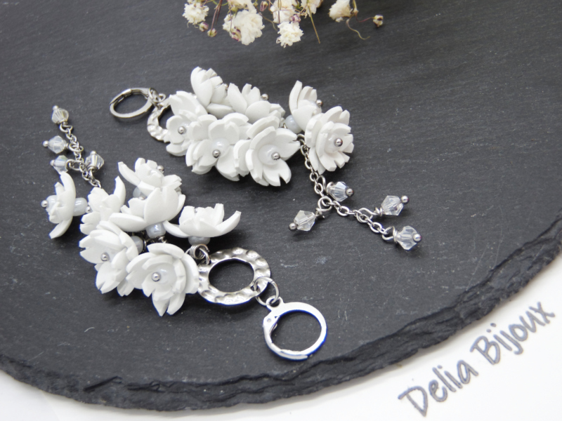 În centrul fiecărei flori se regăsesc mărgele de nisip albe, care adaugă finețe și un aer romantic. Florile sunt prinse pe un lanț din oțel inoxidabil, formând un buchet curgător, care adaugă fluiditate și dinamism look-ului tău, iar la capătul acestuia se leagănă grațios cristale biconice translucide din sticlă, ce reflectă lumina și oferă strălucire subtilă.