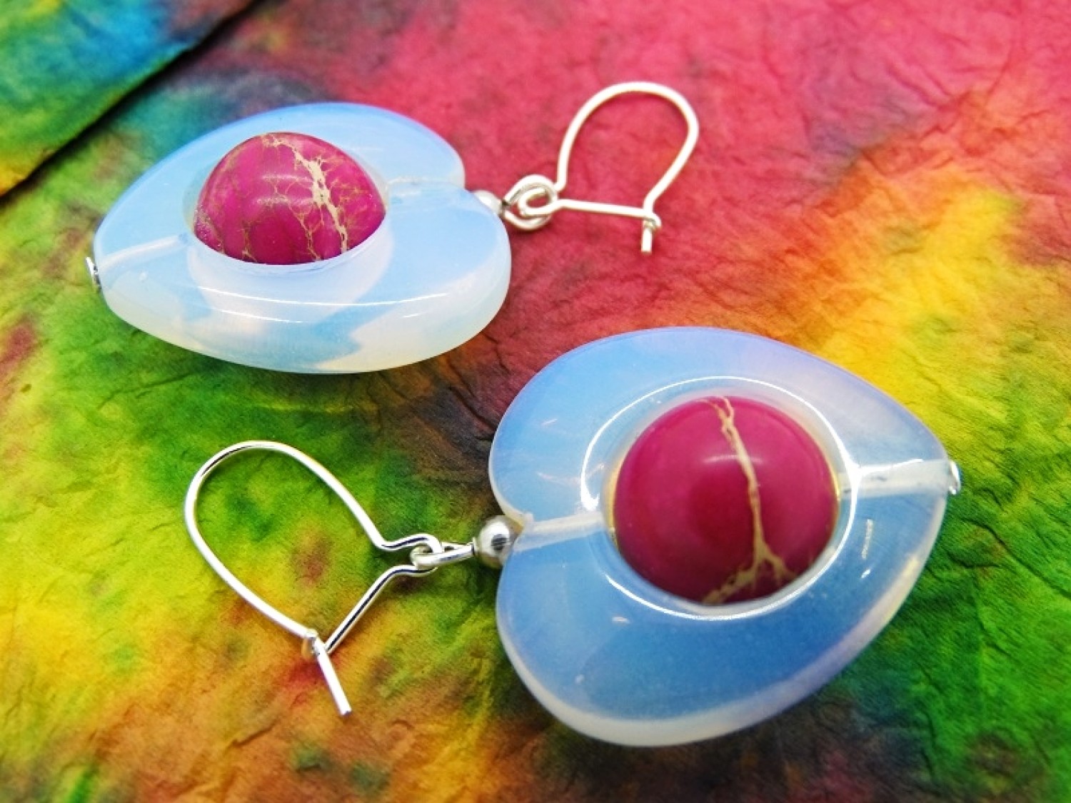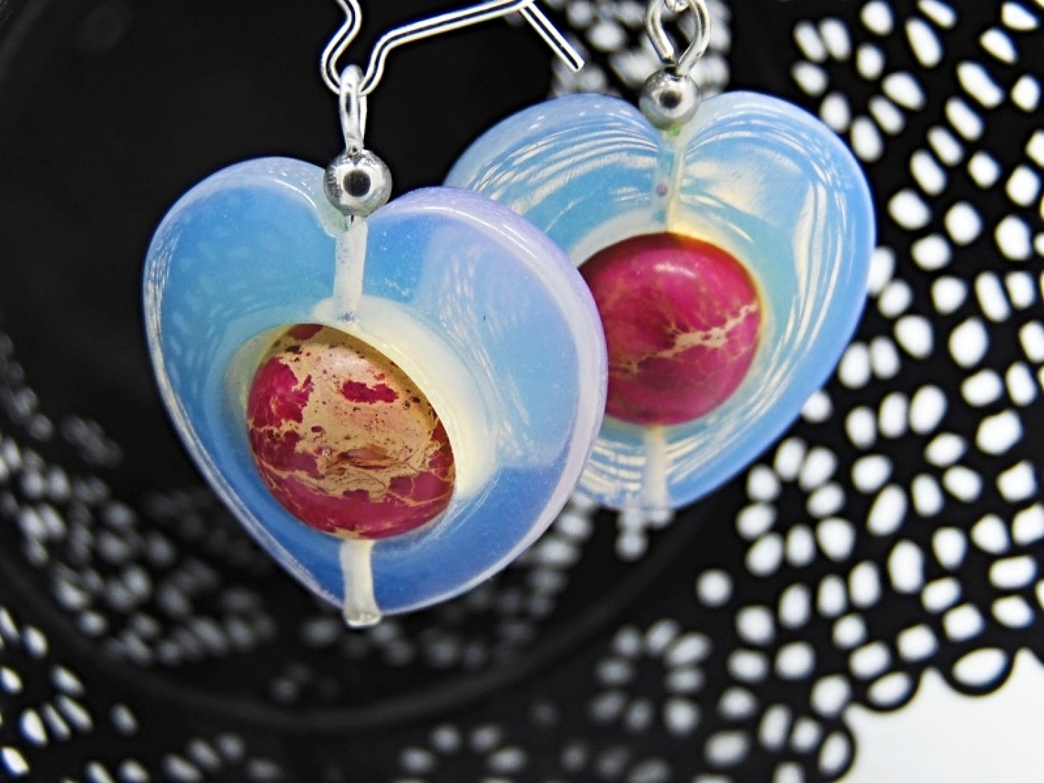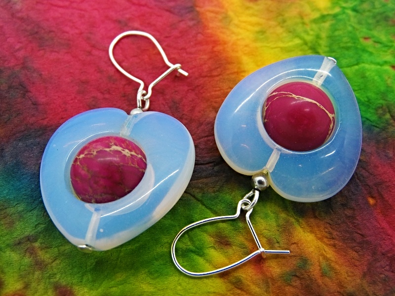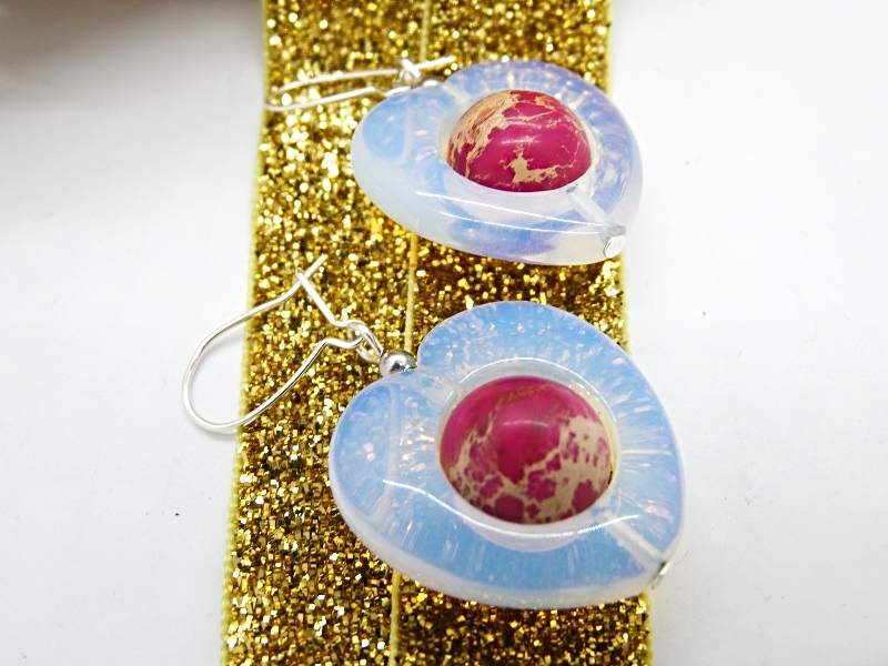 Cercei realizati din inimioare de opalit (25 mm x25 mm), sfere de regalite (12 mm), bile inox (3 mm) si elemente metalice. Tortitele kidney sunt din argint.