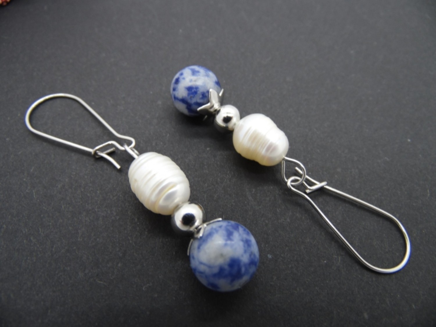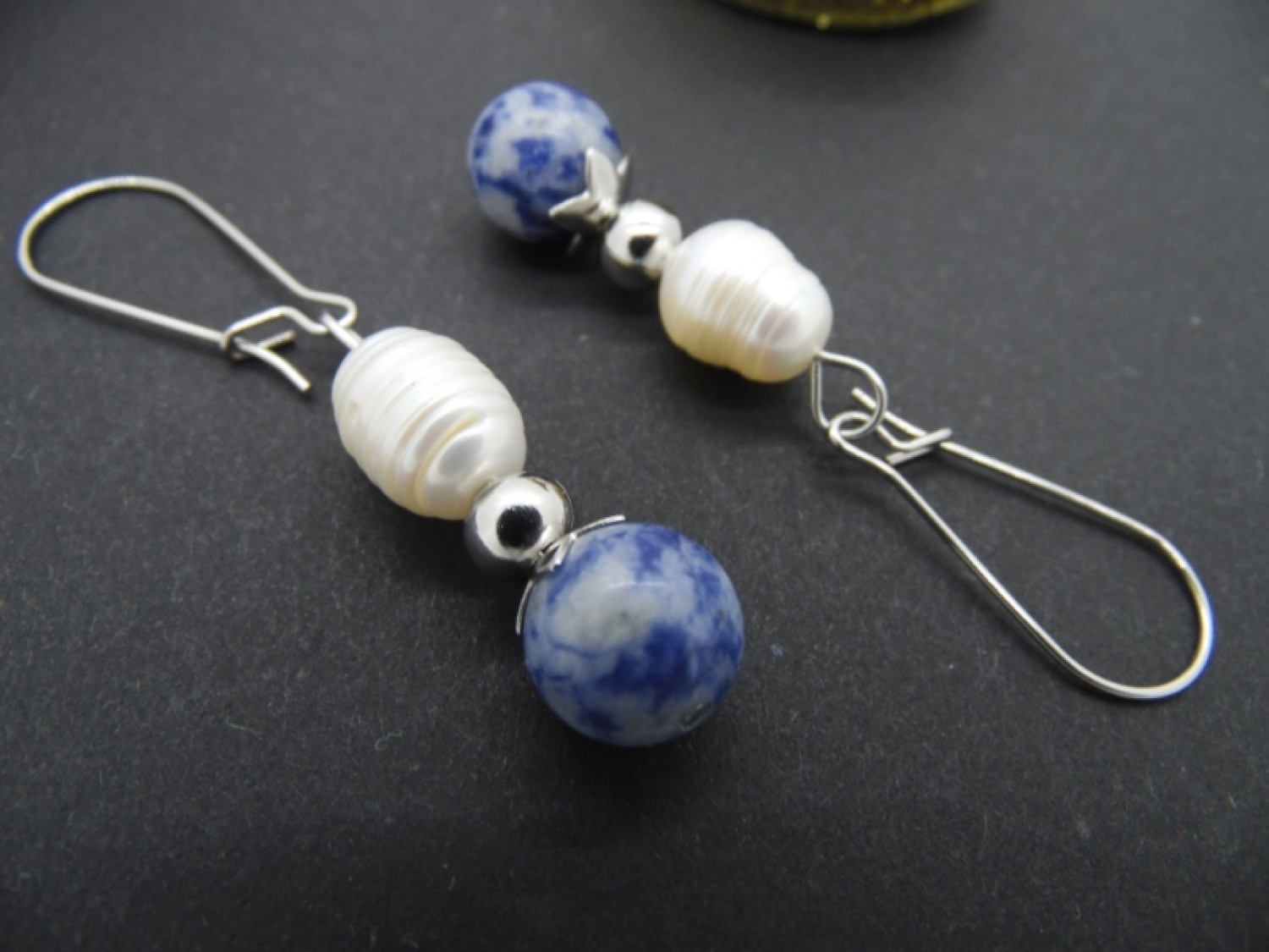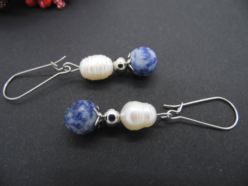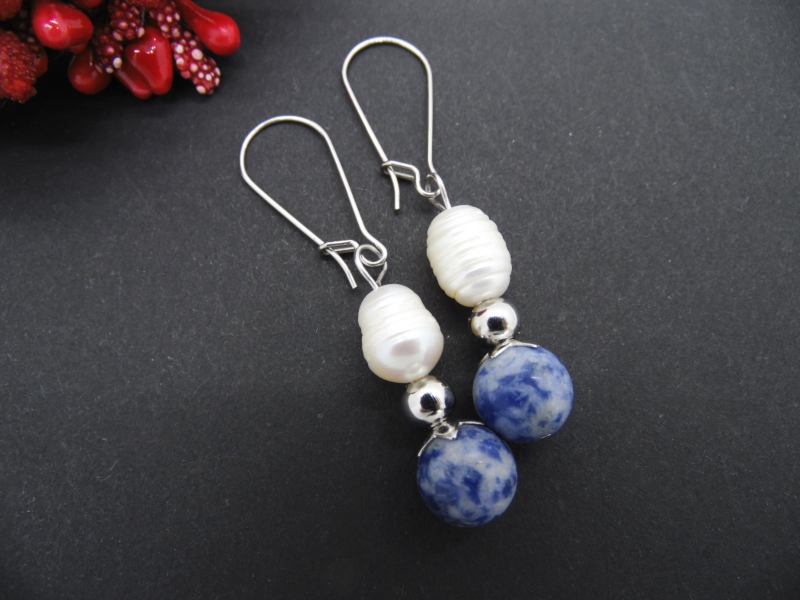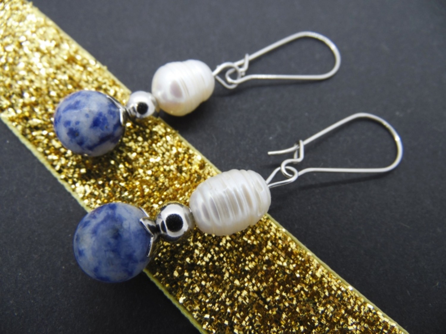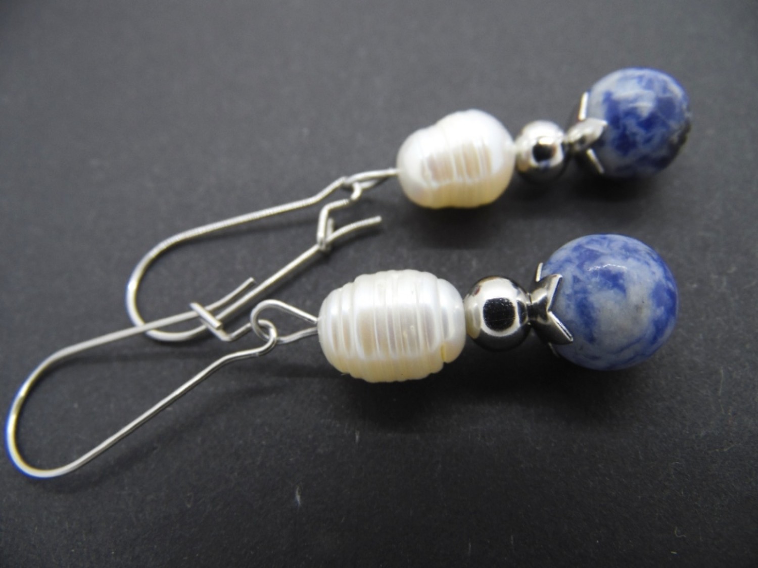 Cercei handmade unicat realizati din perle -imitatie forme neregulate (11~12 mm), sodalit sfere (10 mm), bile otel inoxidabil (6 mm), elemente metalice din otel inoxidabil. Tortitele kidney sunt din otel inoxidabil.