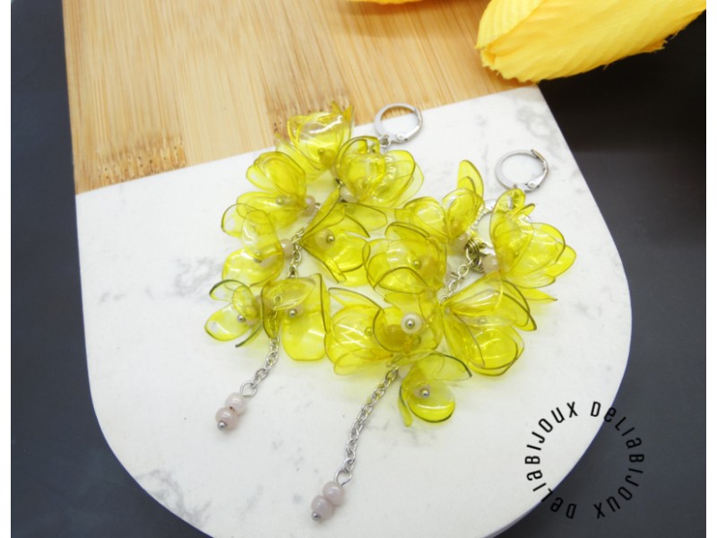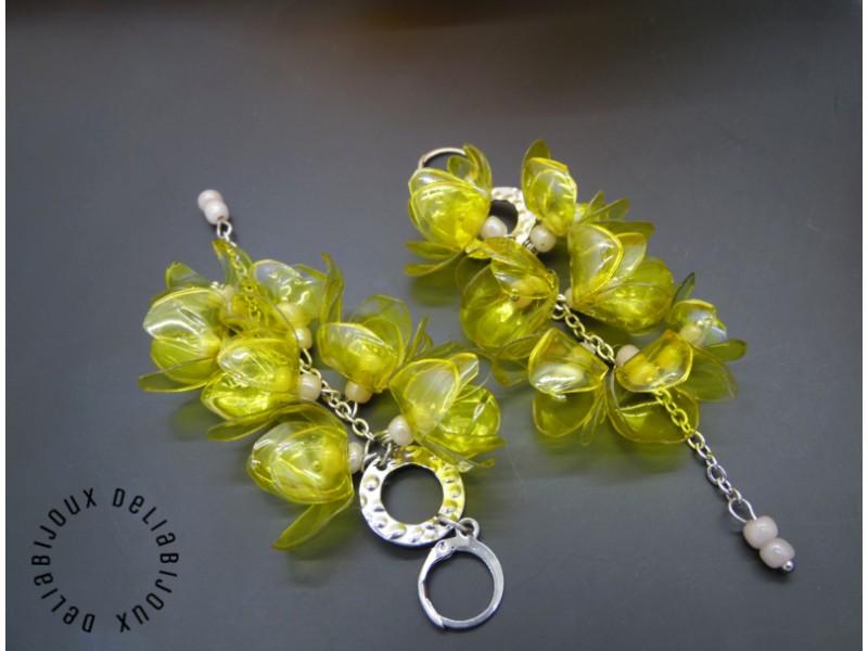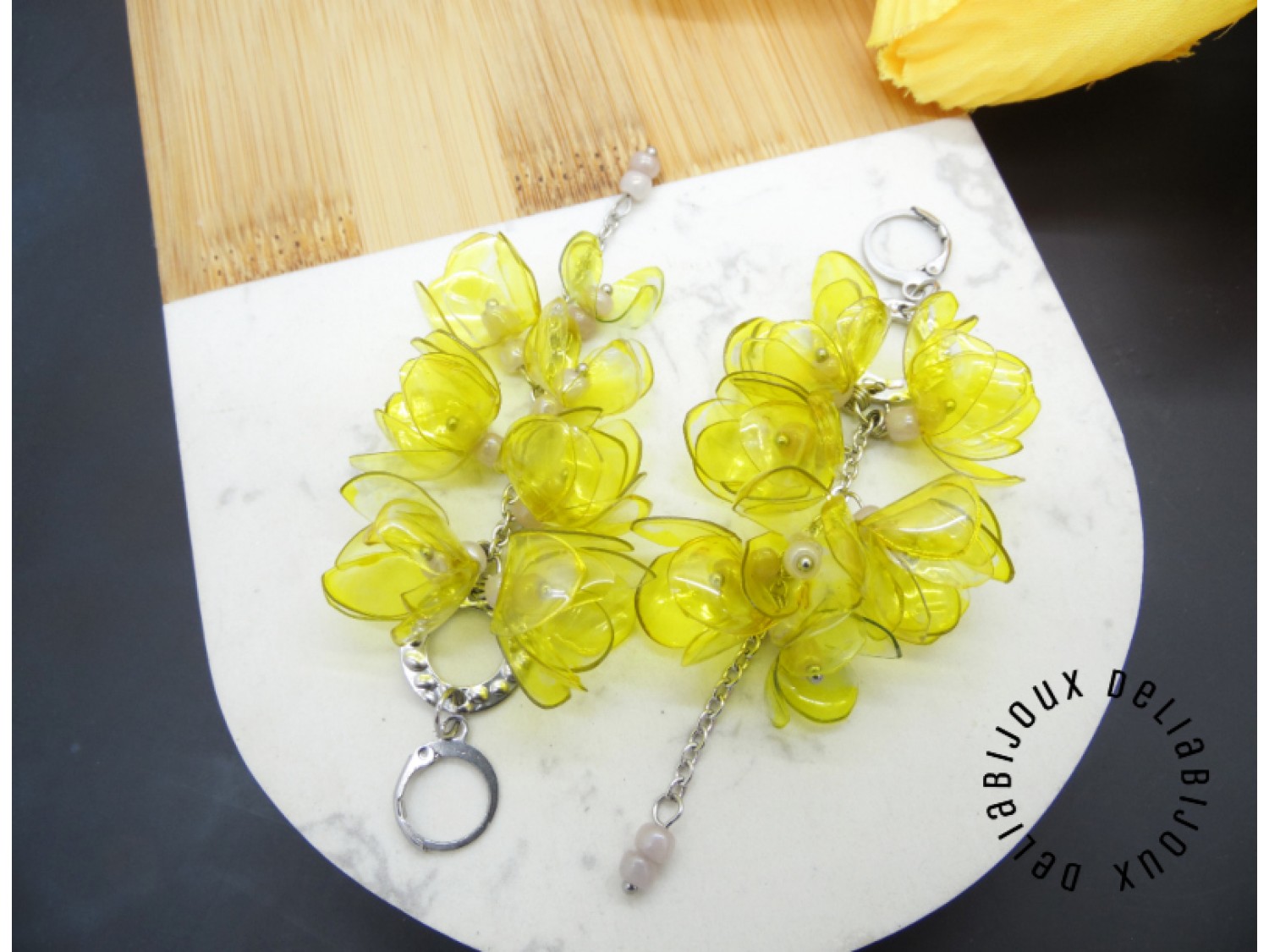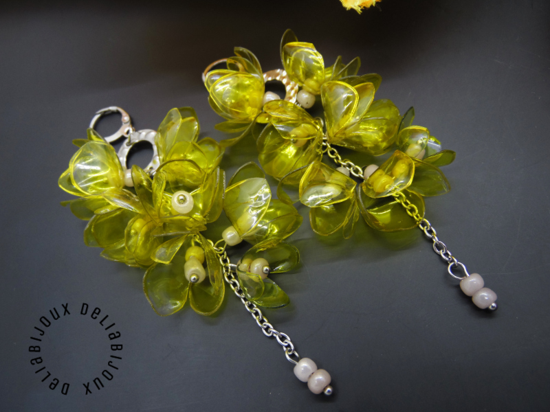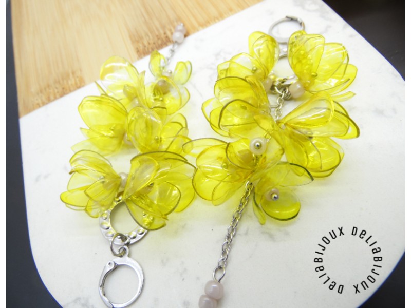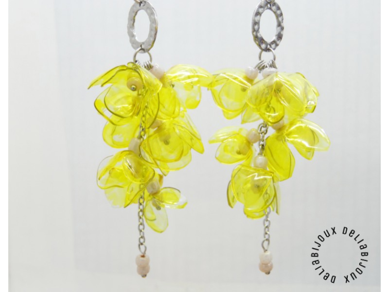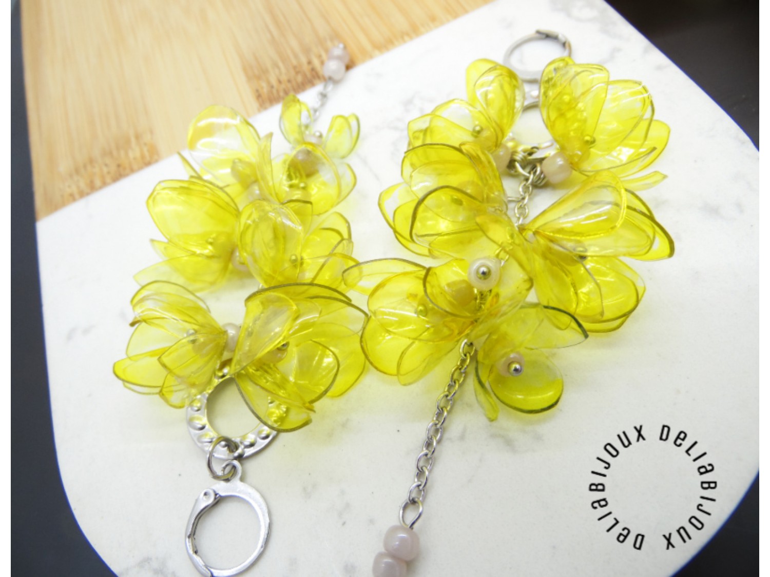 Adaugă o notă eco-chic ținutei tale sau surprinde o persoană dragă cu un cadou special! Acești cercei handmade sunt creați din sticle de plastic reciclate, modelate cu grijă în forma unor flori delicate. Sunt vopsiți manual cu vopsea pe bază de alcool rezistentă, în nuanțe vibrante de galben, pentru un look modern și fresh.