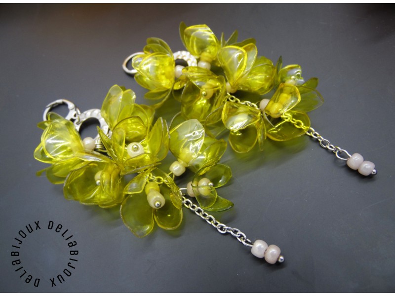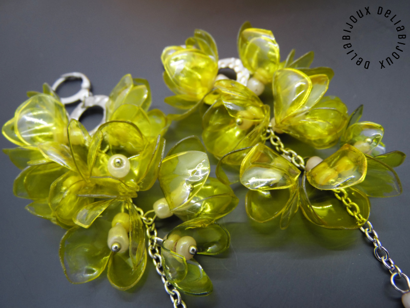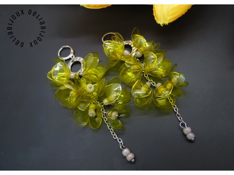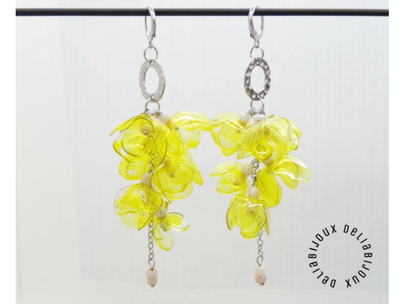 Cercei handmade statement, lungi, foarte usori si versatili, usor asimetrici, realizati din plastic reciclat (PET-uri decupate si modelate in diverse forme - diametrul florilor aprox 2.2 cm - 1.5 cm, florile nu sunt identice), margele de nisip (3 mm), inele din otel inoxidabil (15 mm), lant otel inoxidabil si elemente metalice din otel inoxidabil