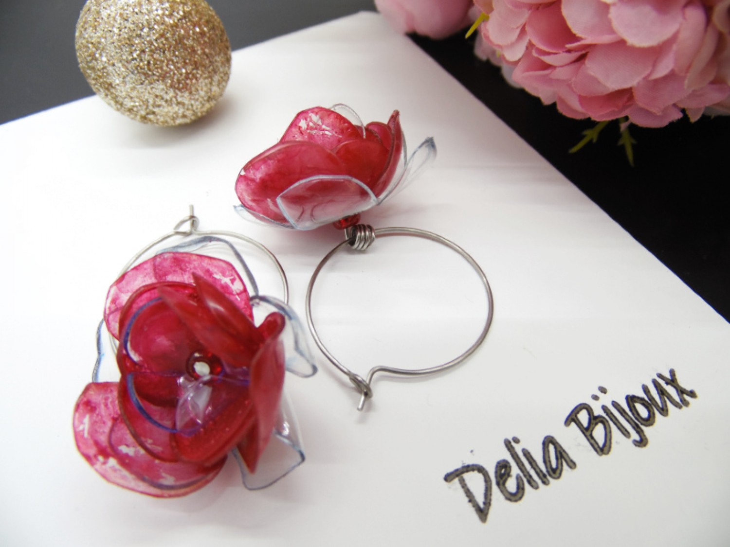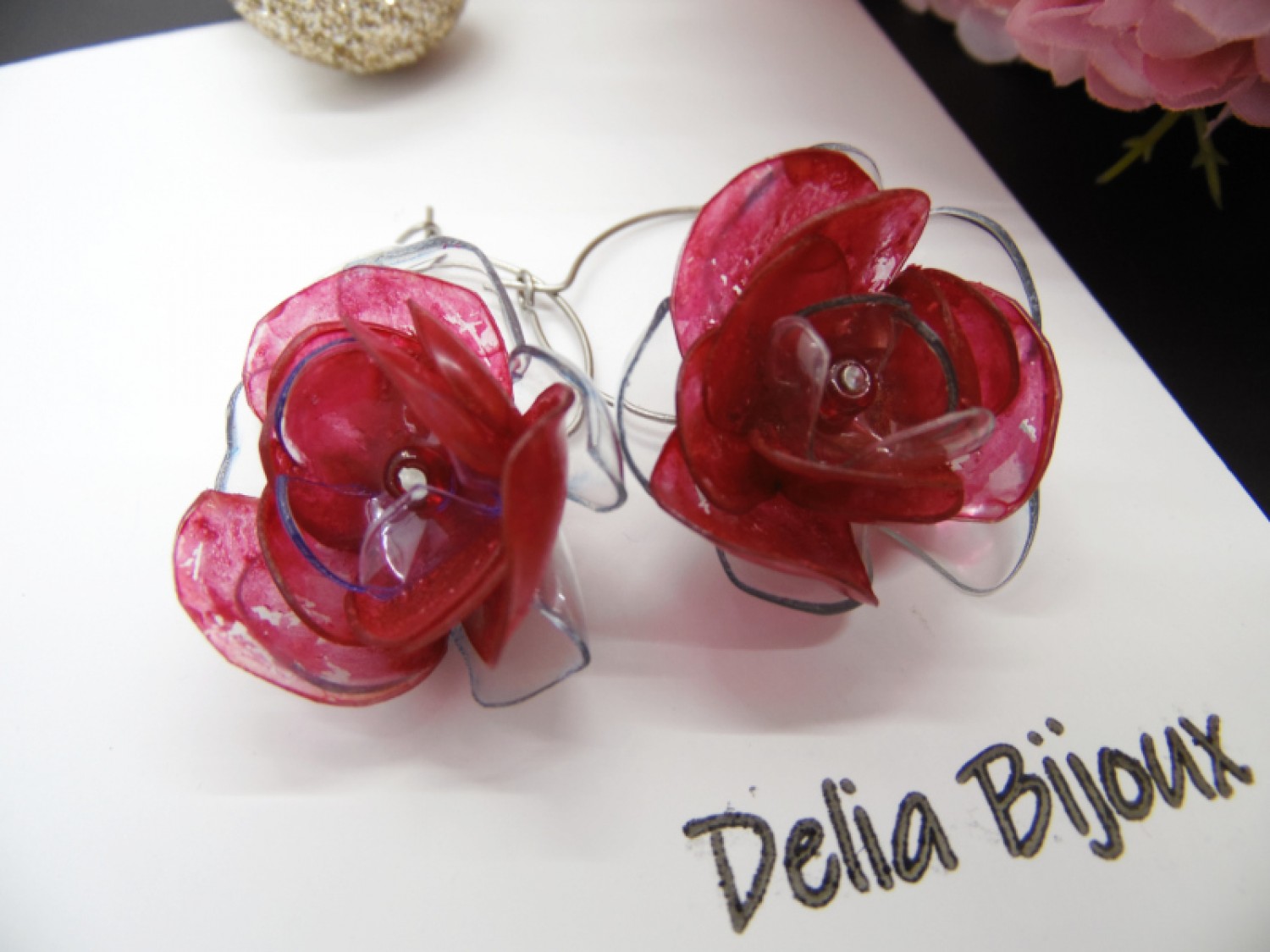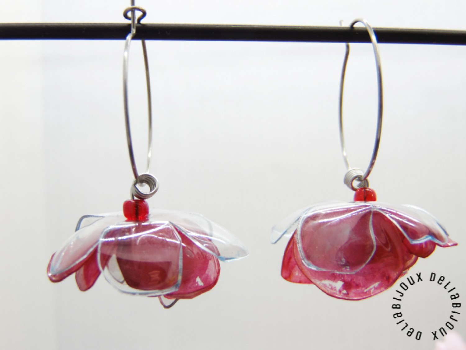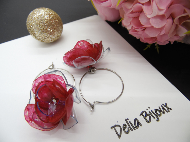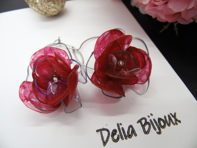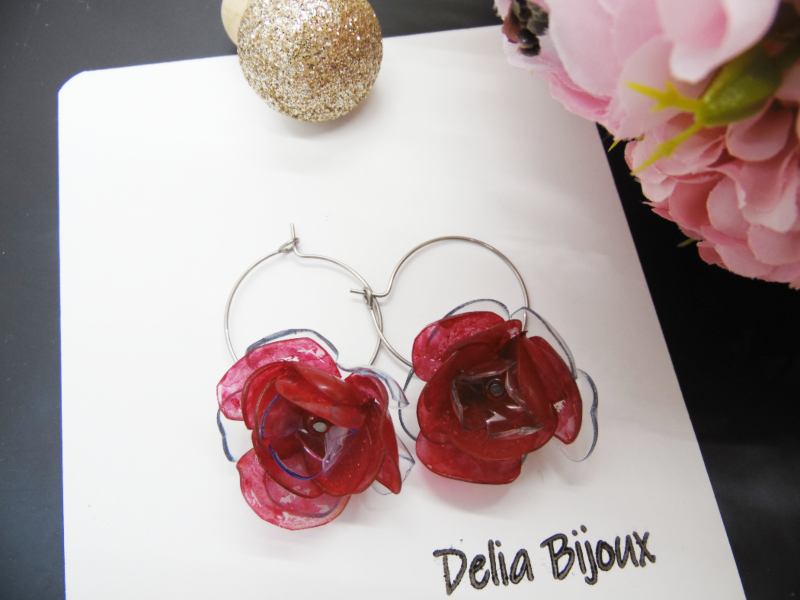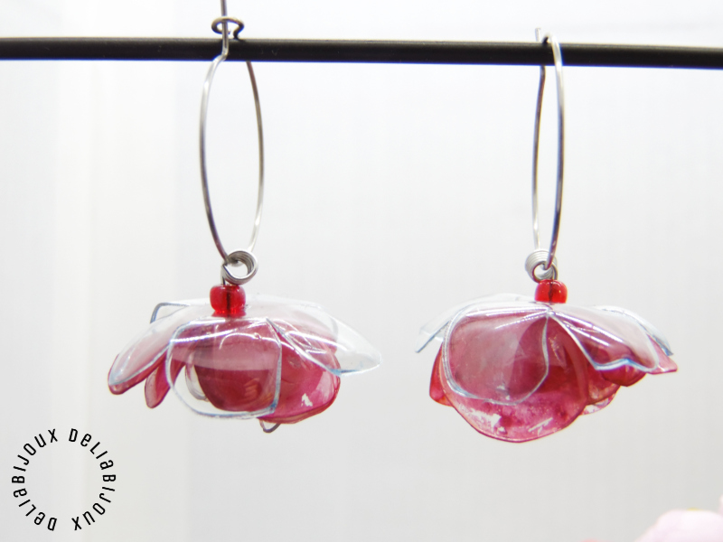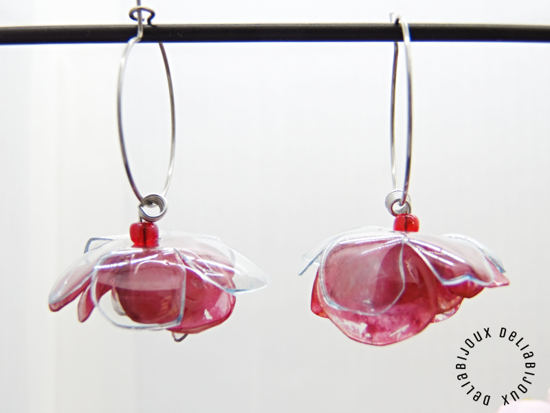 Florile delicate, modelate manual din PET-uri reciclate provenind din sticle de plastic de apa minerala, adaugă o notă de prospetime și originalitate cerceilor. Fiecare petală a fost atent modelată pentru a reda delicatețea și detaliile unui trandafir înflorit, conferind cerceilor un aspect tridimensional și elegant. Plasticul a fost vopsit cu culori acrilice, în nuanțe vibrante de roșu pentru flori, oferind un finisaj intens. Vopseaua acrilică are o textură aparte, cu urme vizibile de pensulă. Vopseaua nu este distribuită uniform, ceea ce adaugă un farmec autentic și artistic fiecărei piese. Vopseaua este durabilă și nu se șterge, însă se recomandă evitarea contactului cu parfumuri sau alte substanțe chimice pentru a păstra aspectul intact.