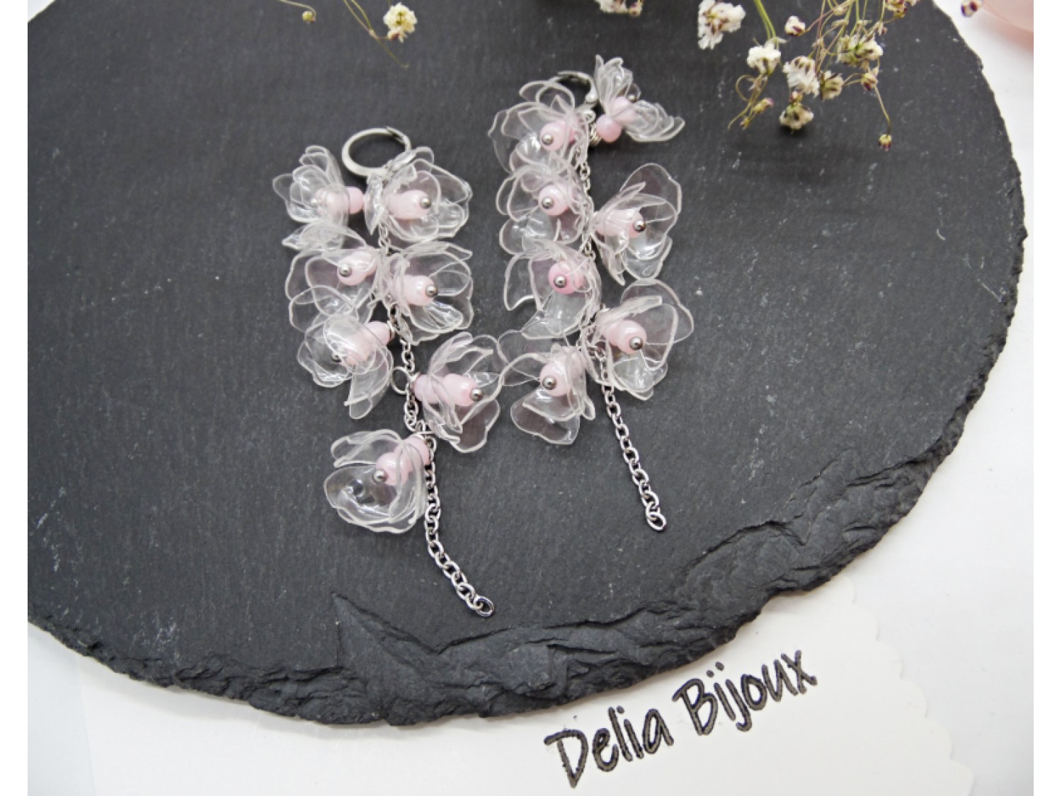 Acești cercei lungi și spectaculoși sunt realizați manual, fiind o piesă unicat care îmbină frumusețea delicată a florilor cu un design modern și sustenabil.