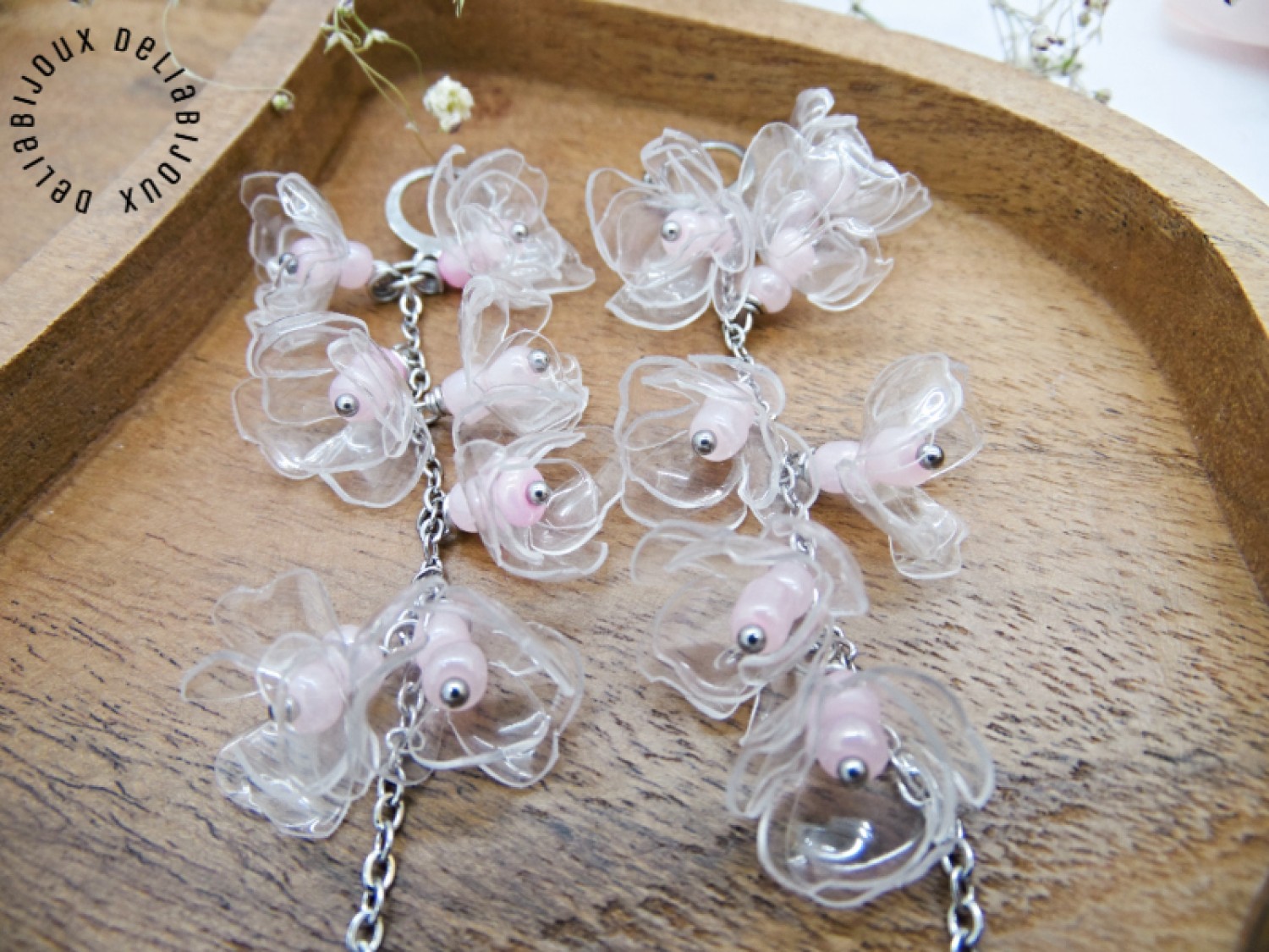 Sunt creați manual din sticle de plastic transparente, reciclate și transformate cu grijă în petale fine, modelate la cald, păstrând un aspect ușor ondulat, diafan, elegant și natural. În centrul fiecărei flori am adăugat o mărgea roz pal, ce aduce un contrast subtil și un accent feminin, elegant.