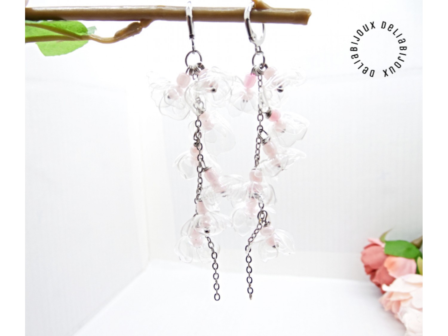 Cercei handmade statement, lungi, foarte usori si versatili, usor asimetrici, realizati din plastic reciclat (PET-uri decupate si modelate in diverse forme - diametrul florilor aprox 1.7 cm - 1.2 cm, florile nu sunt identice), margele de nisip (3 mm), lant otel inoxidabil si elemente metalice din otel inoxidabil