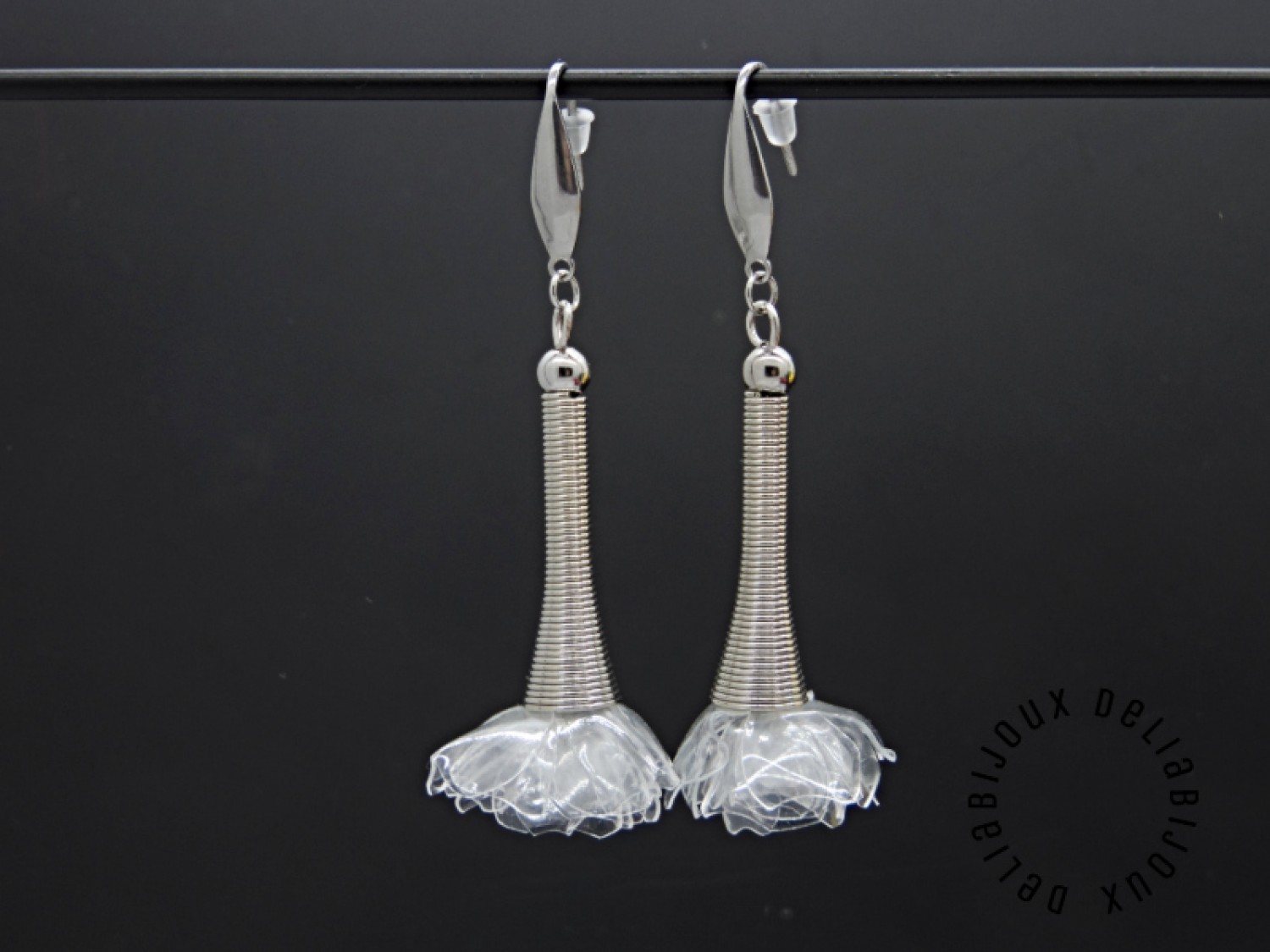 Florile translucide sunt modelate manual petală cu petală și montate pe elemente metalice argintii din otle inoxidabil, oferind un contrast modern și rafinat. Datorită materialului reciclat, cerceii sunt surprinzător de ușori, în ciuda dimensiunii lor statement.