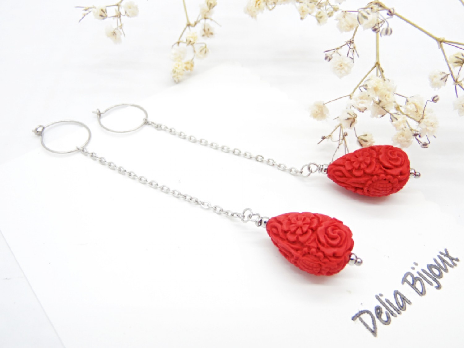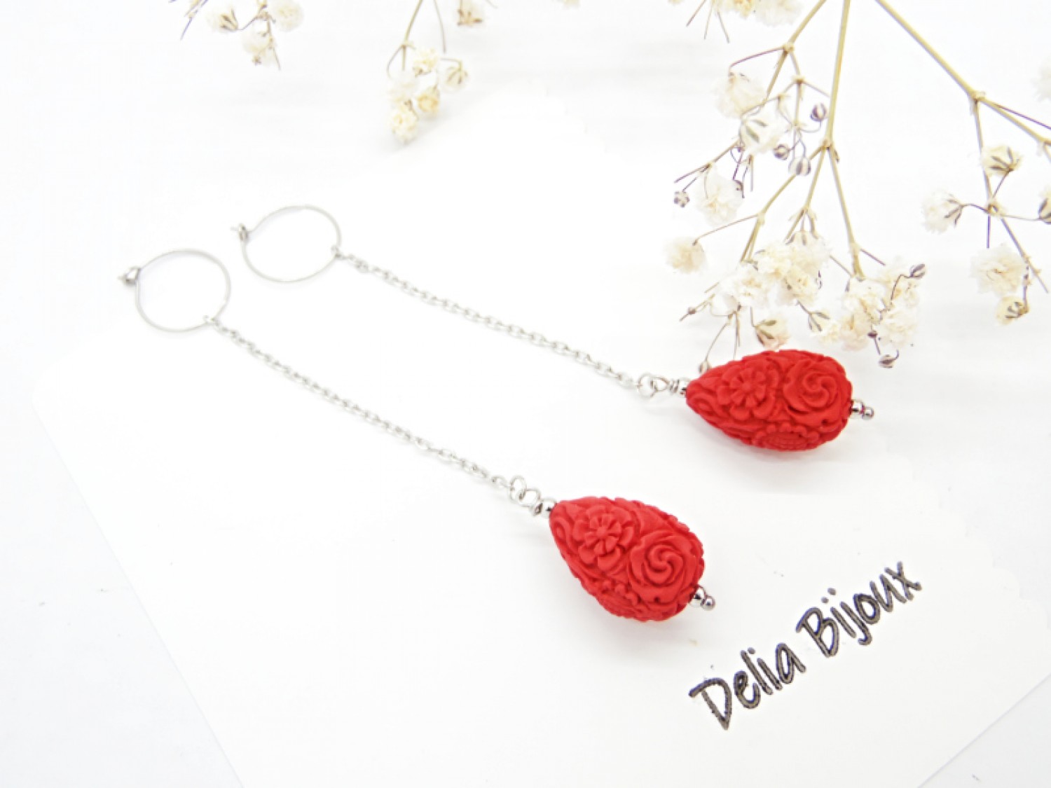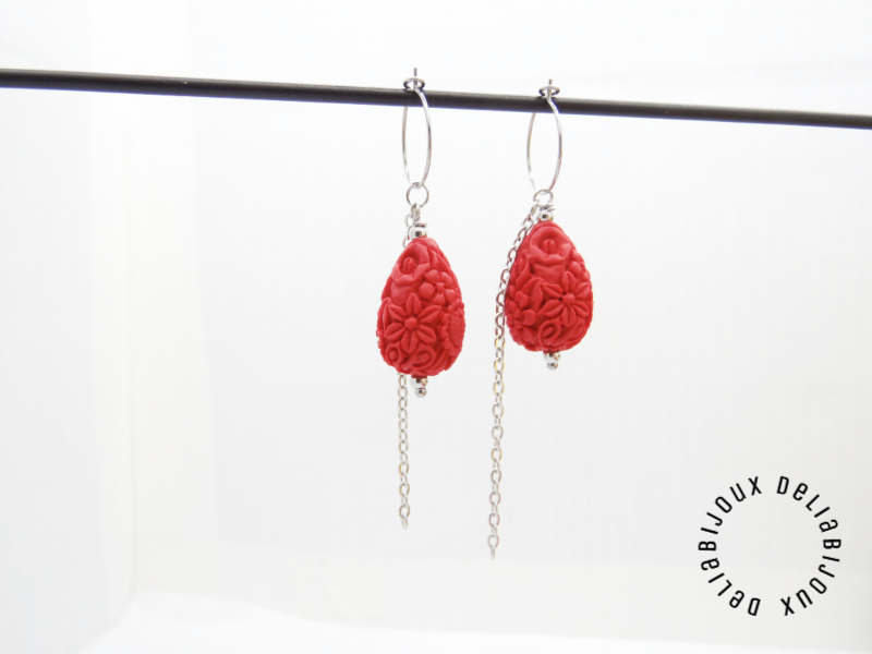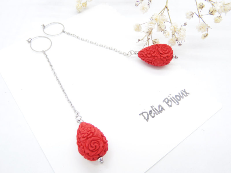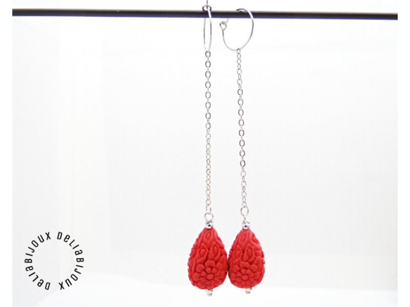 Cercei lungi, eleganti, realizati din cinabru sculptat in forma de lacrima (imitatie - 20.5 mm x 14 mm), bile inox (3 mm), lant otel inoxidabil si elemente metalice din otel inoxidabil. Tortitele sunt din otel inoxidabil.