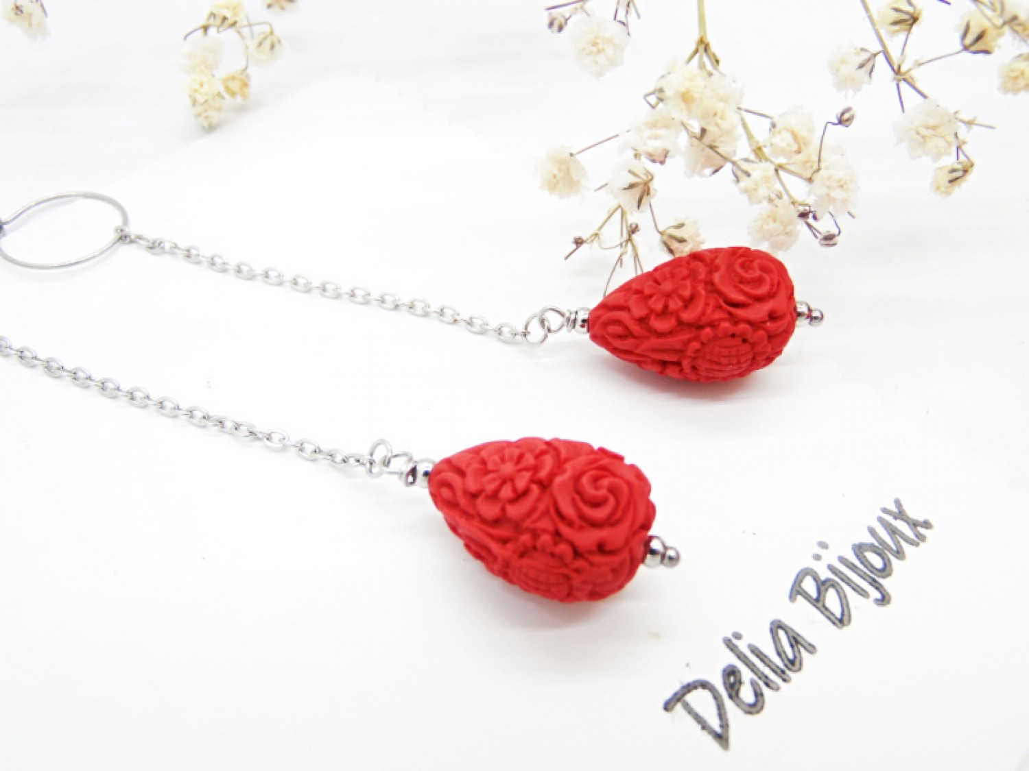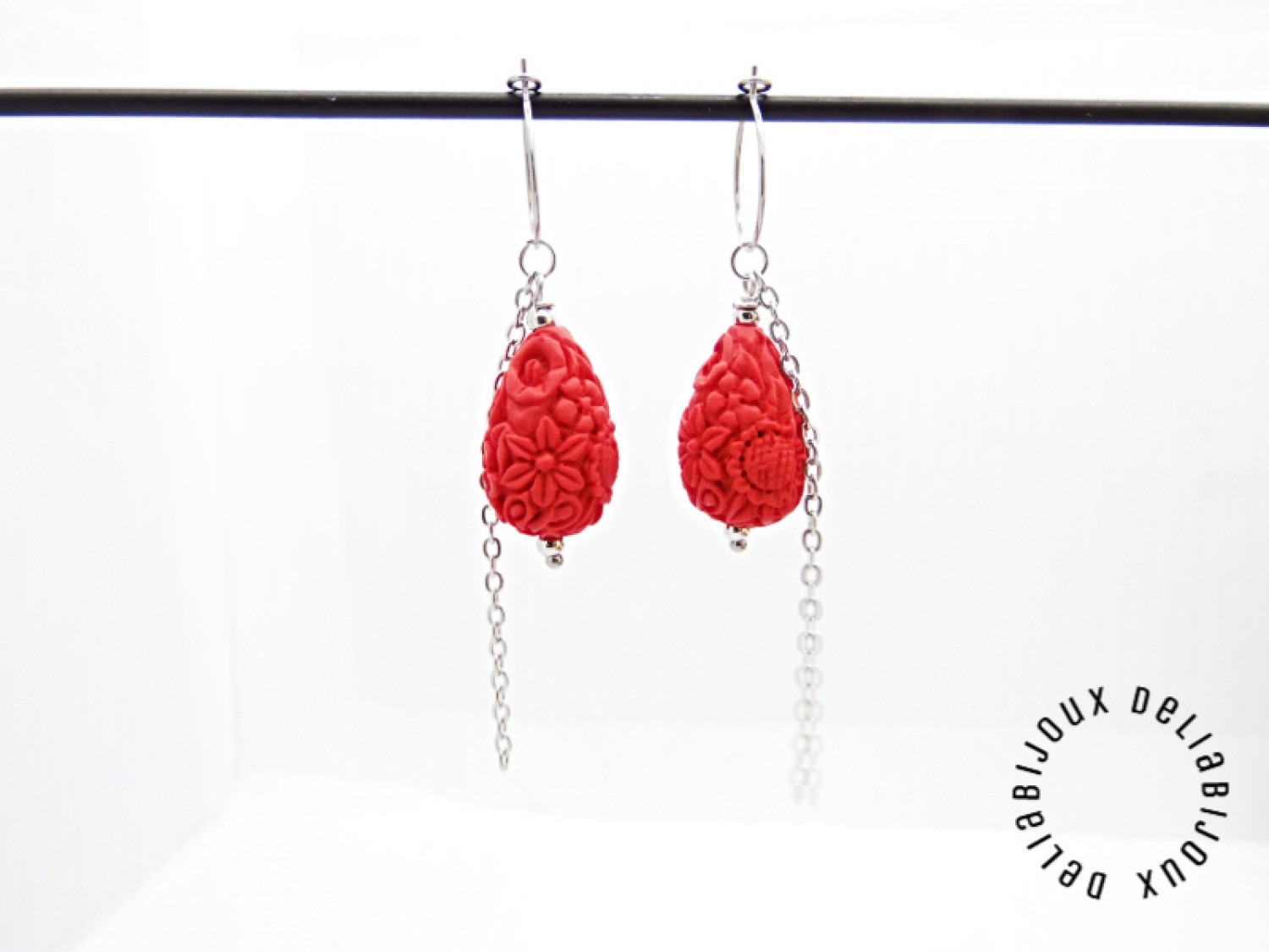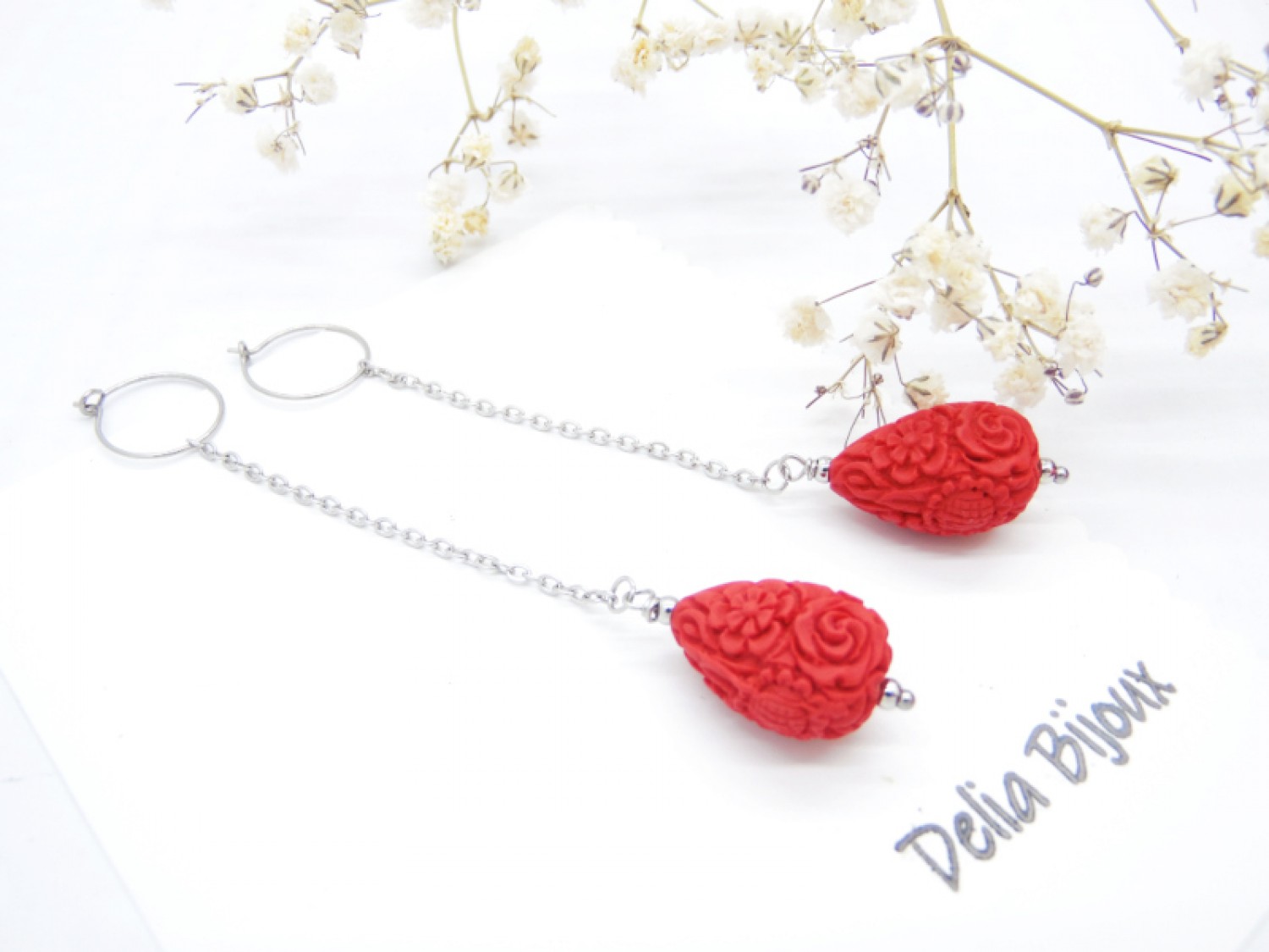 Cercei lungi, eleganti, realizati din cinabru sculptat in forma de lacrima (imitatie - 20.5 mm x 14 mm), bile inox (3 mm), lant otel inoxidabil si elemente metalice din otel inoxidabil. Tortitele sunt din otel inoxidabil.