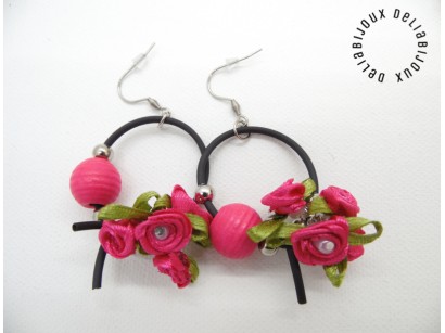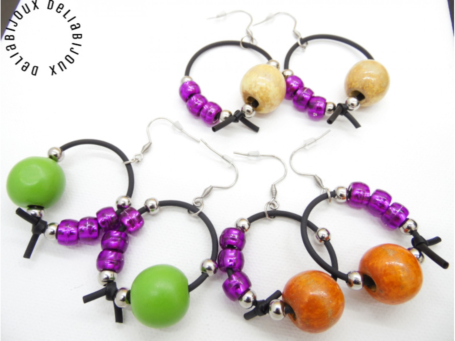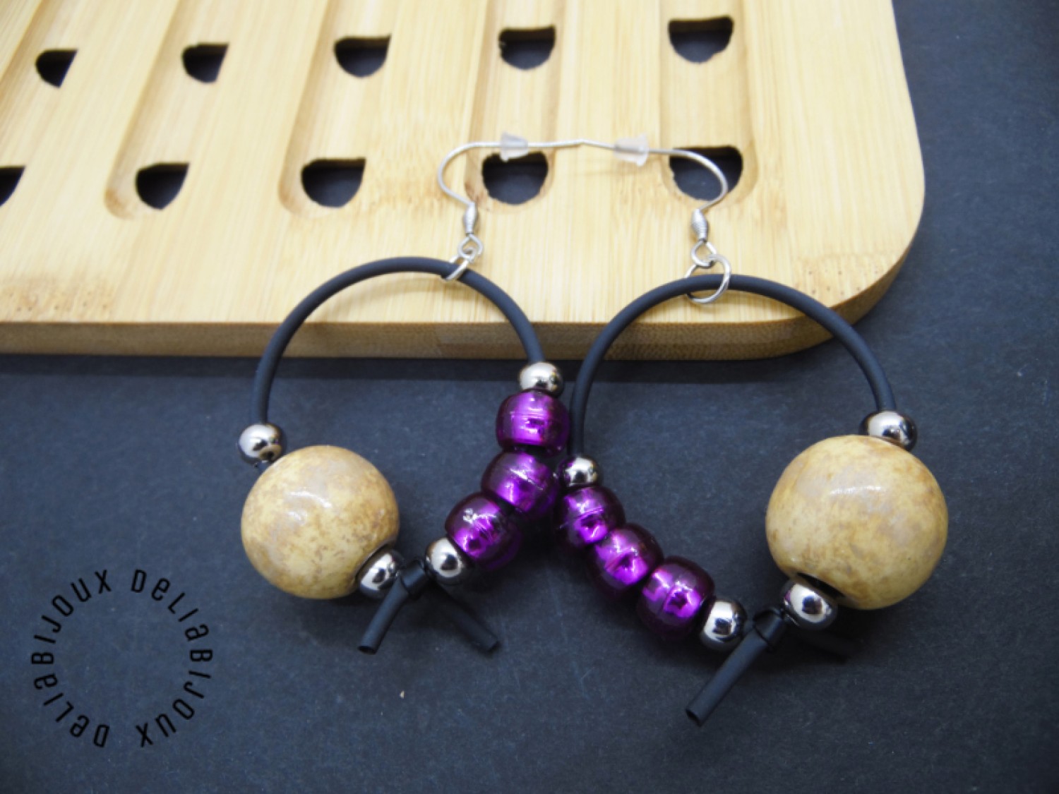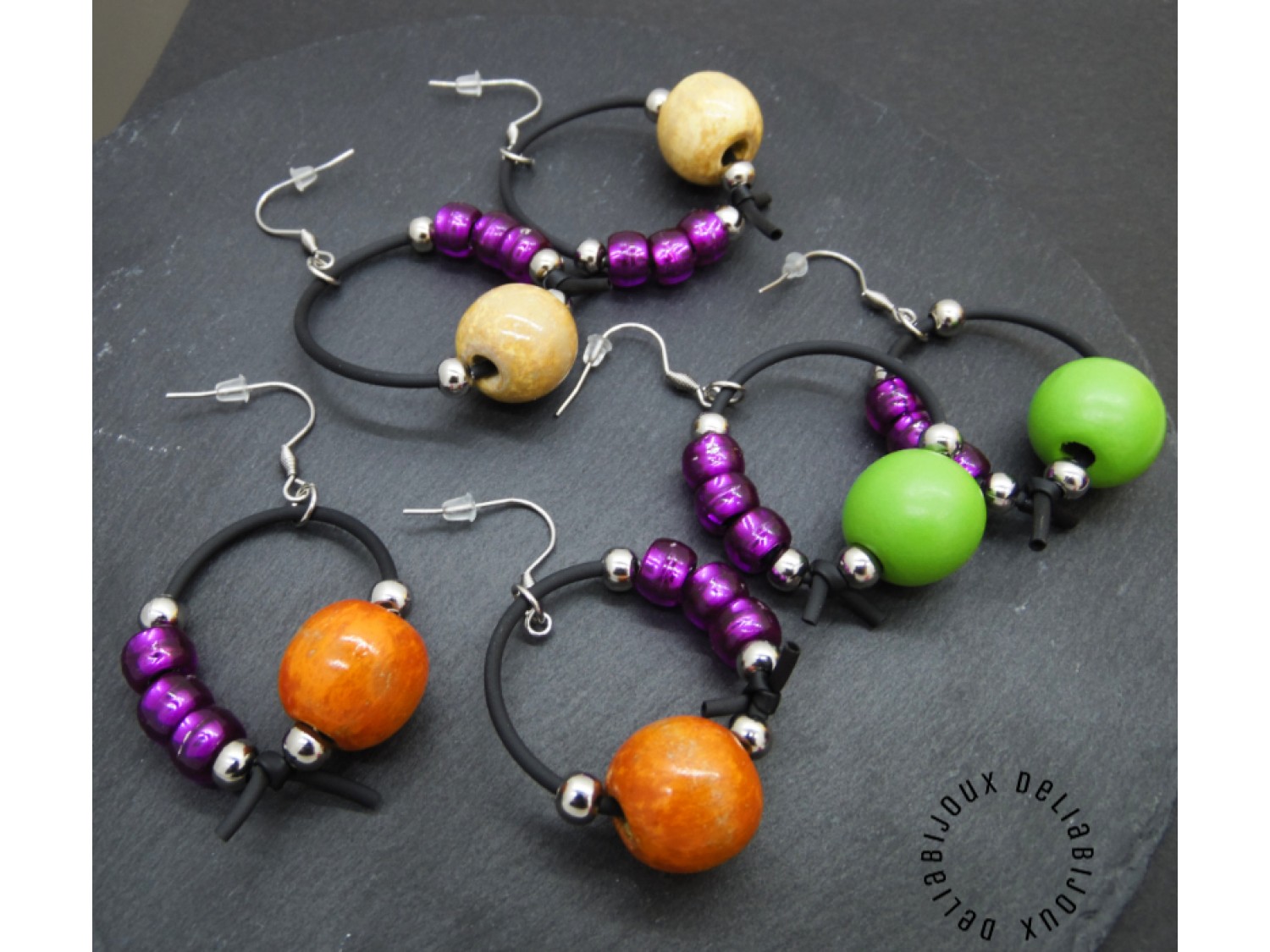 Cercei handmade, model contemporan, versatili, realizati din margele de lemn (18 mm), margele de plastic ( 8 mm), bile inox (6 mm), tub negru silicon si elemente metalice.