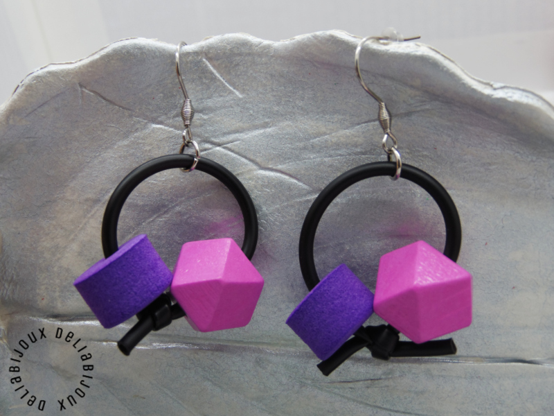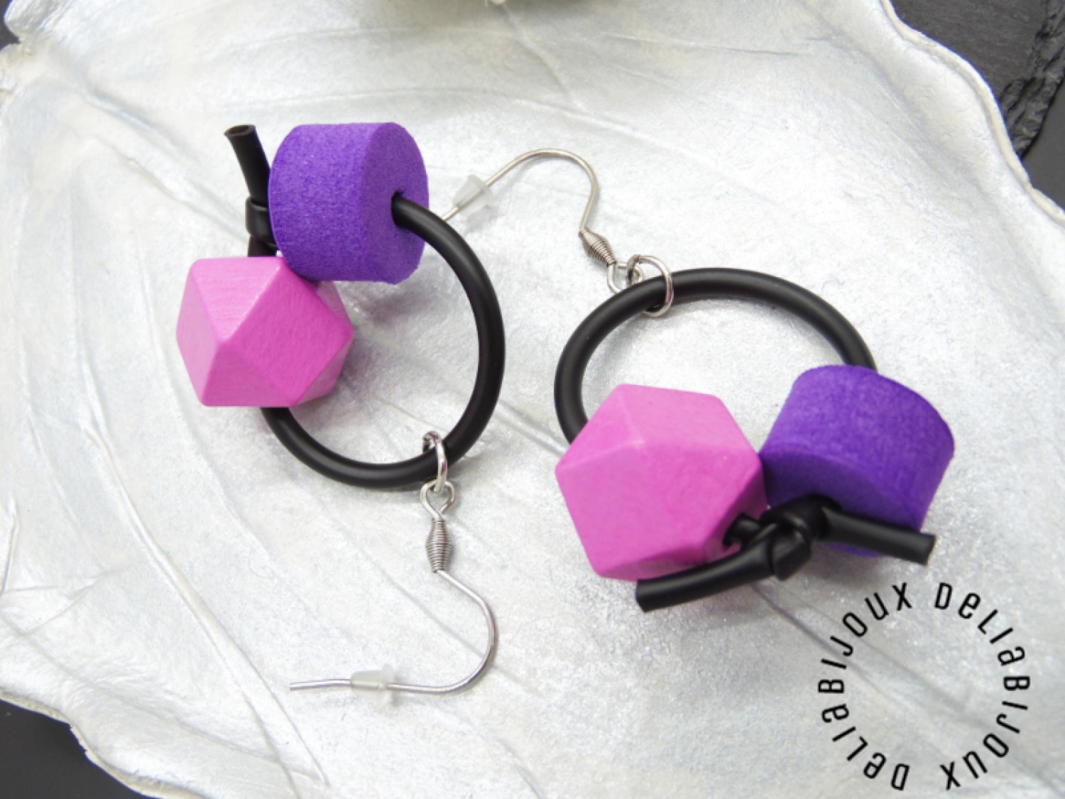 Cercei handmade statement, model contemporan, versatili, realizati din margele de lemn fatetate (15 mm), margele spuma (15 mm), bile inox (4 mm) si elemente metalice.