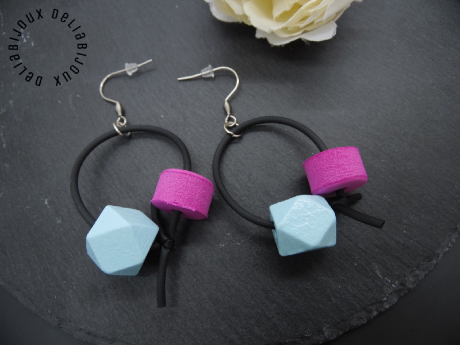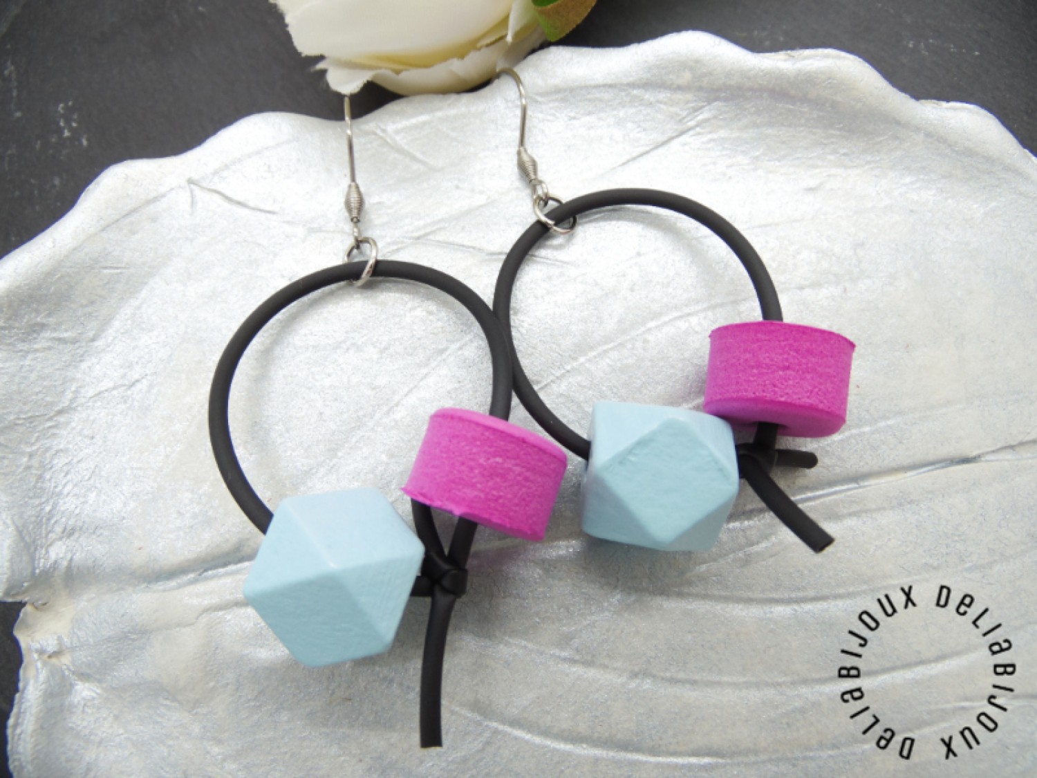 Toate aceste elemente sunt armonizate și fixate pe un tub negru de silicon, care asigură o fixare sigură și confortabilă. Tubul de silicon este flexibil și ușor, ceea ce face ca cerceii să fie plăcuți de purtat și potriviți pentru orice ocazie.