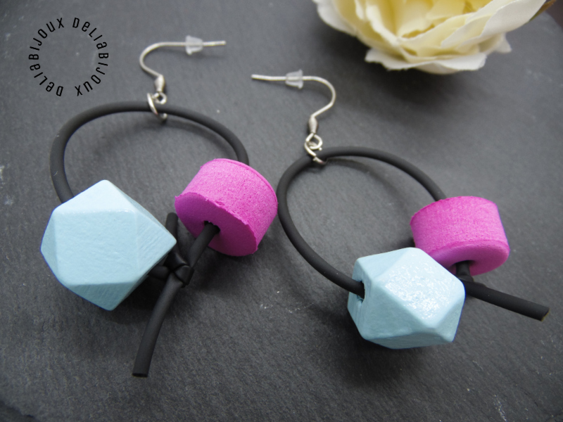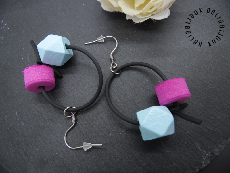 Cercei handmade statement, model contemporan, versatili, realizati din margele de lemn fatetate (15 mm), margele spuma (15 mm), bile inox (4 mm) si elemente metalice.