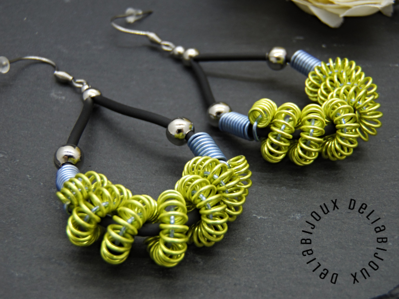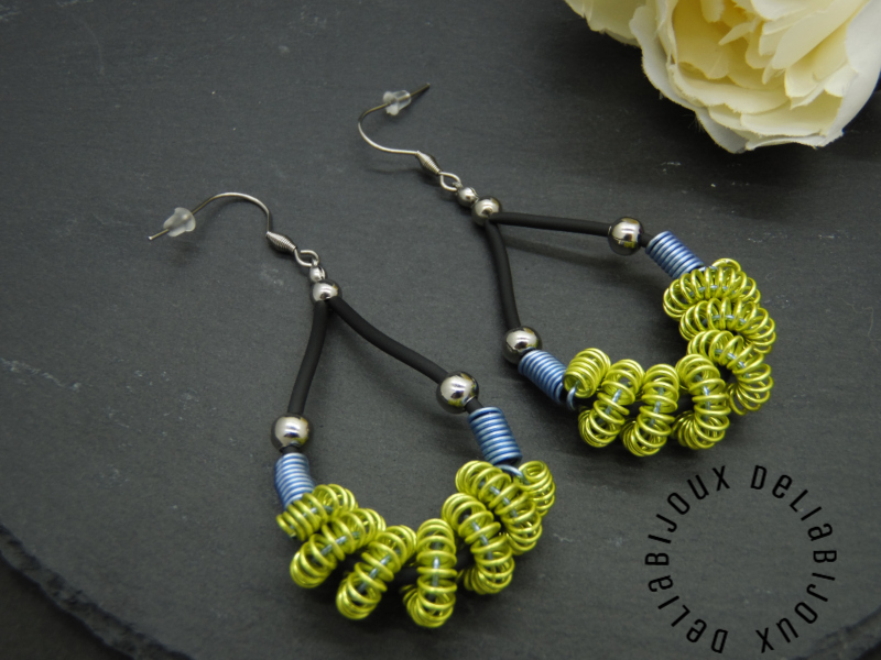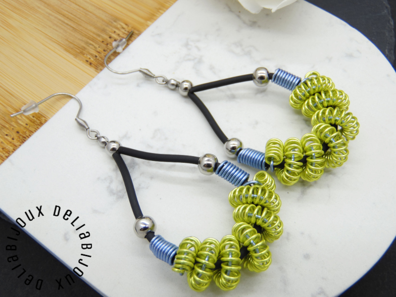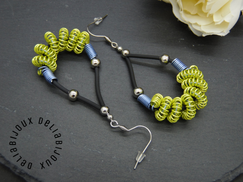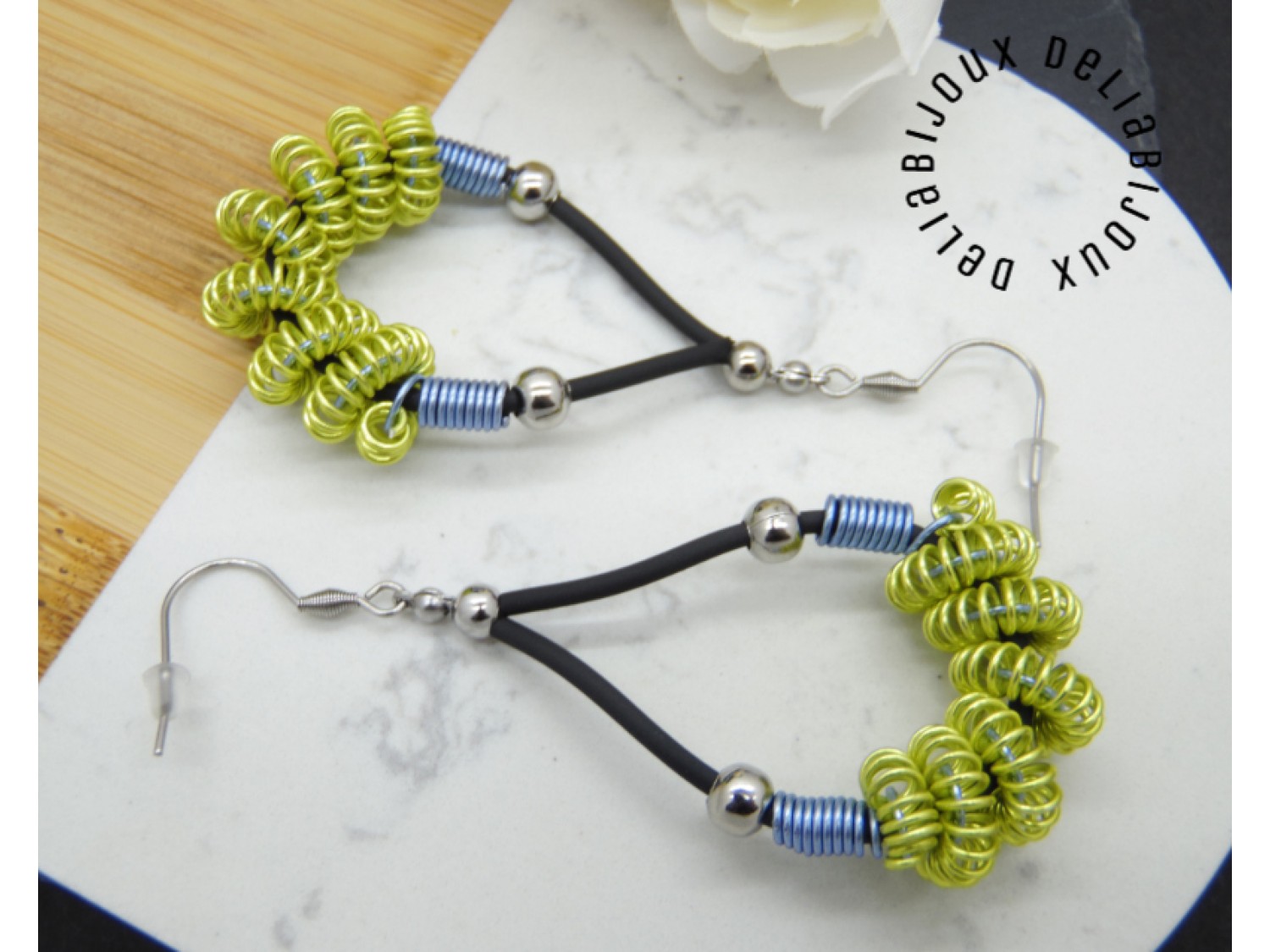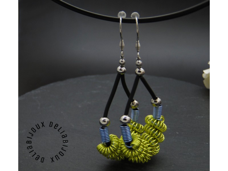 Cercei realizati manual din sarma de modelaj din aluminiu, bile inox (5 mm), tub negru silicon, elemente metalice otel inoxidabil si dopuri de silicon. Tortitele sunt din otel inoxidabil.