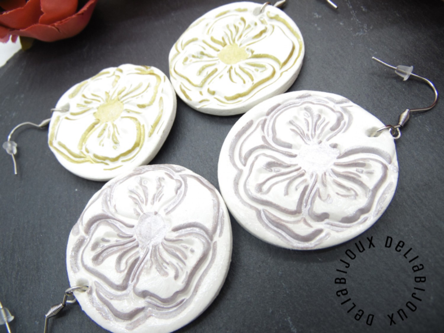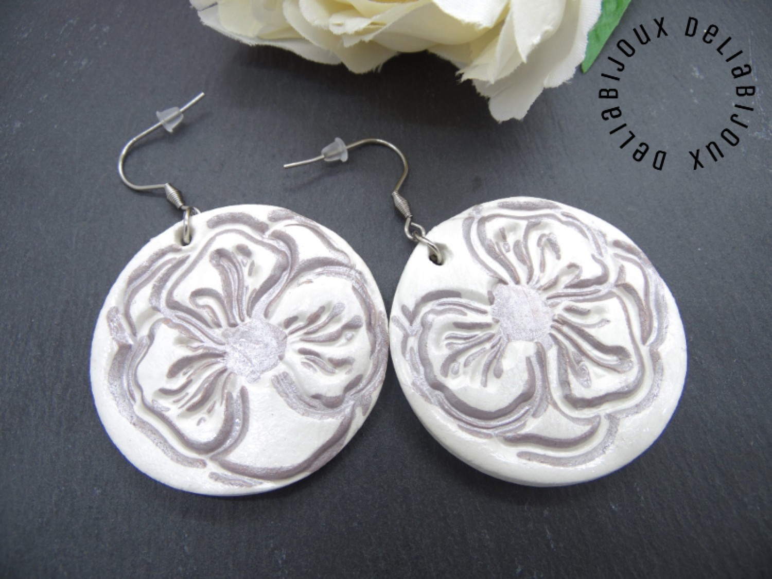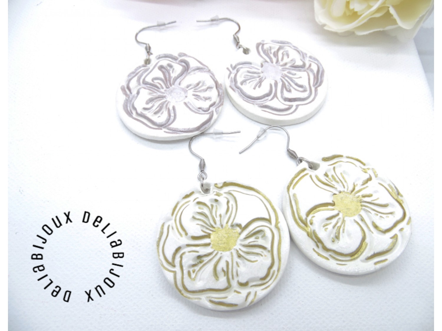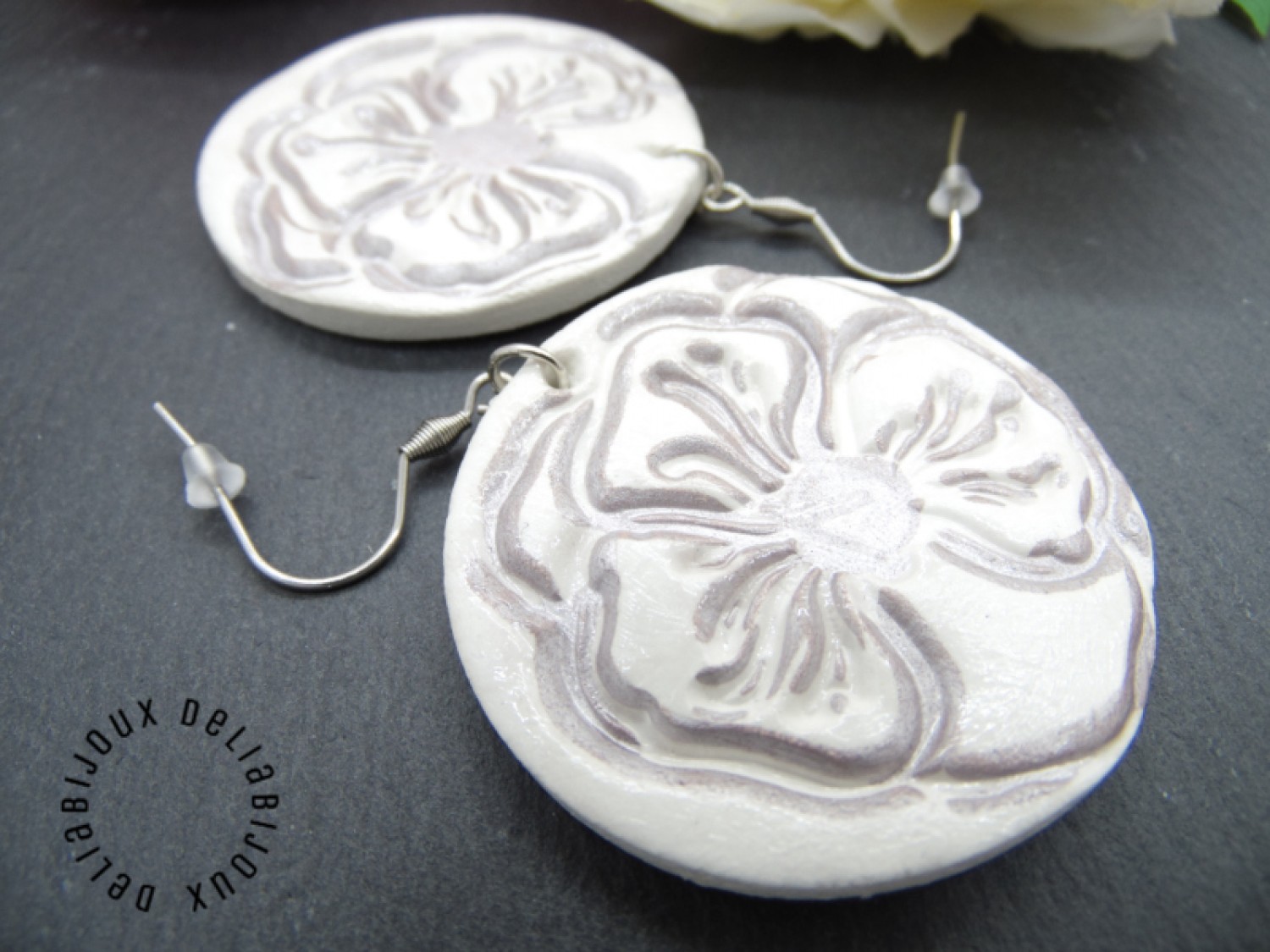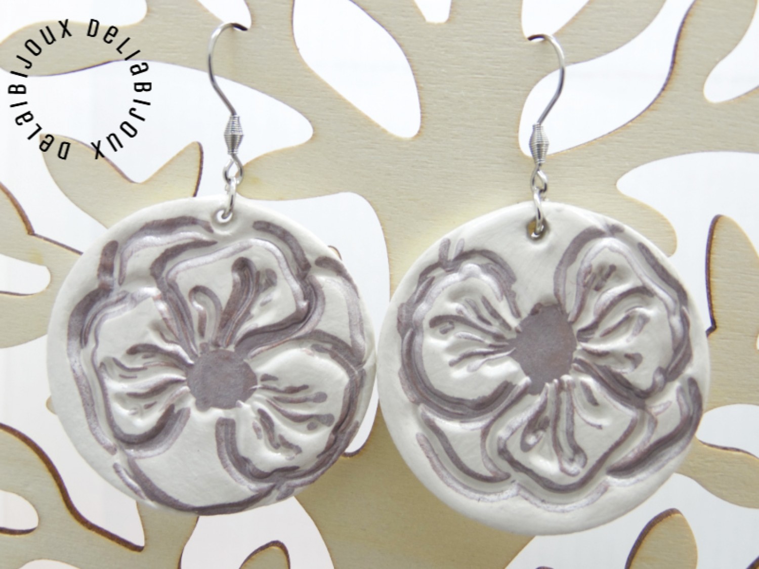 După modelarea și uscarea lor la aer, cerceii au fost conturati cu o nuanță fina de argintiu si apoi sigilati cu lac. În plus, pe o fata a fiecărui cercel se află o amprentă botanică, detaliu floral fermecător, creată cu migală, care adaugă un element natural și distinctiv, oferind o notă de originalitate și unicitate fiecărui cercel. Argintiul adaugă o strălucire subtilă și adâncește frumusețea detaliilor, evidențiind florile într-un mod elegant și subtil.
