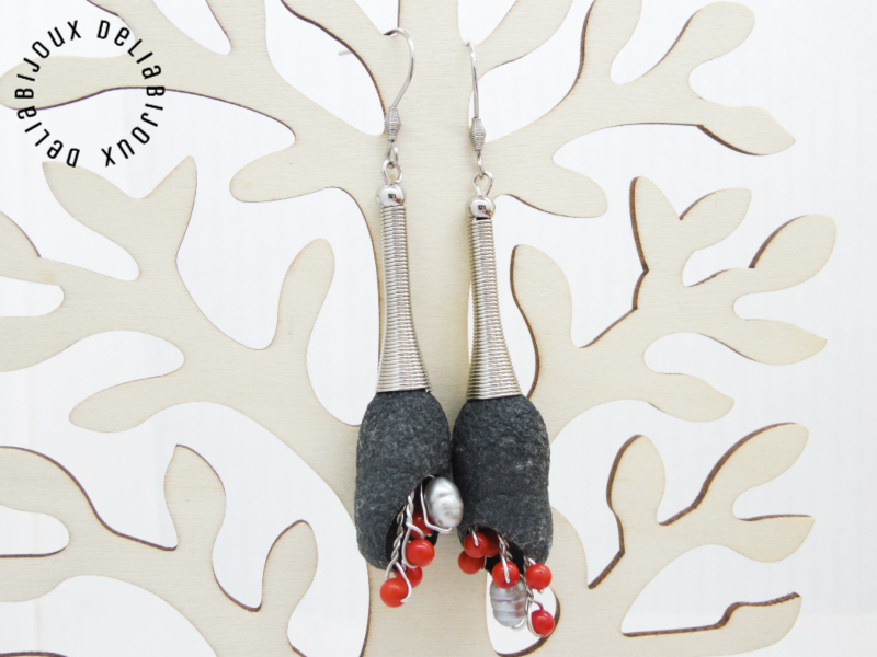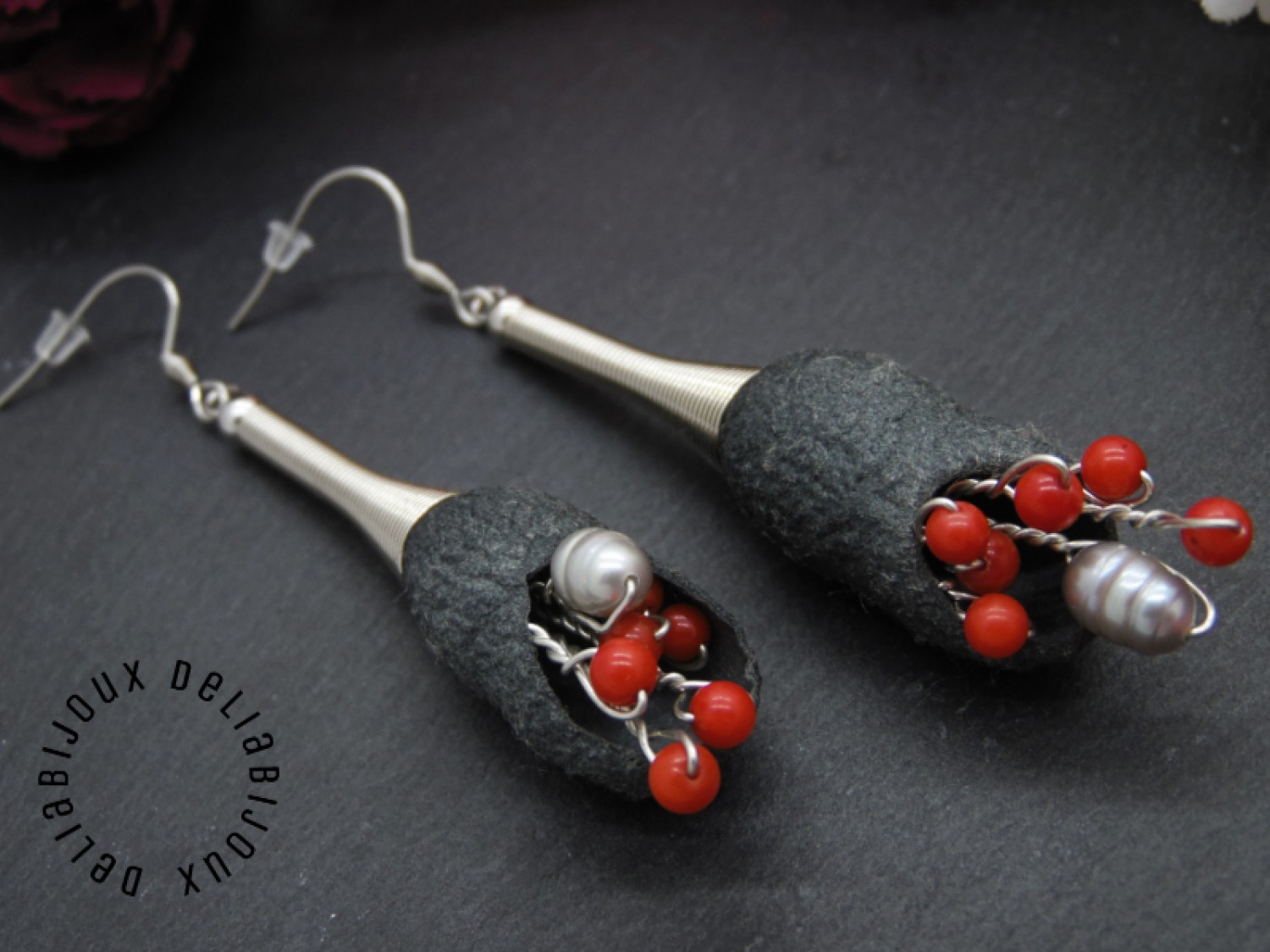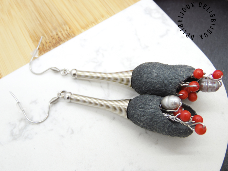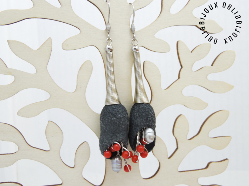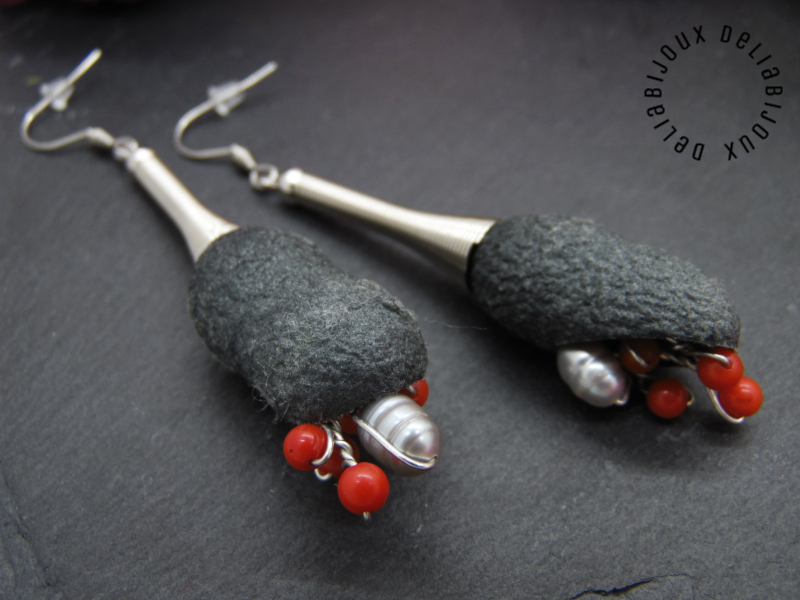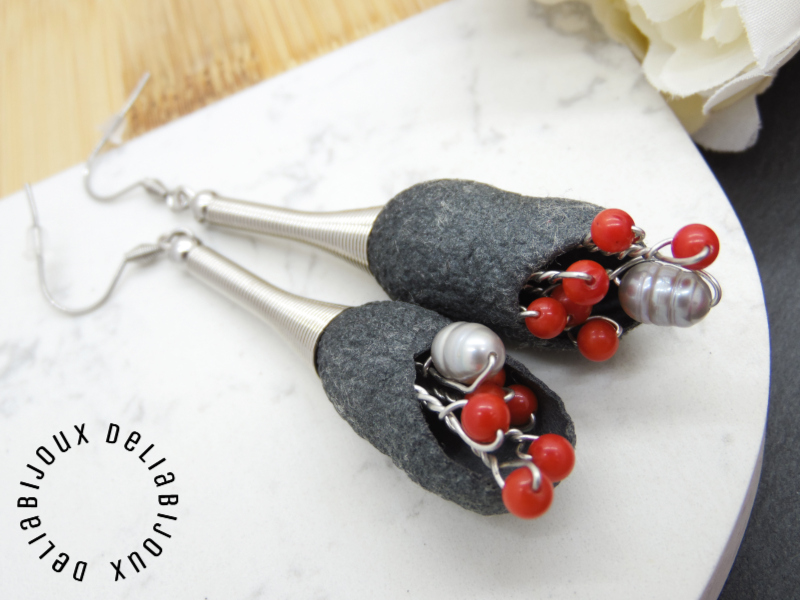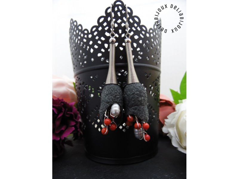 Forma și textura coconilor de mătase gri adaugă un element natural, organic și minimalist, creând o bază interesantă pentru designul cerceilor. Această alegere neobișnuită de material aduce un contrast plăcut cu strălucirea perlelor de cultură și intensitatea coralului roșu.