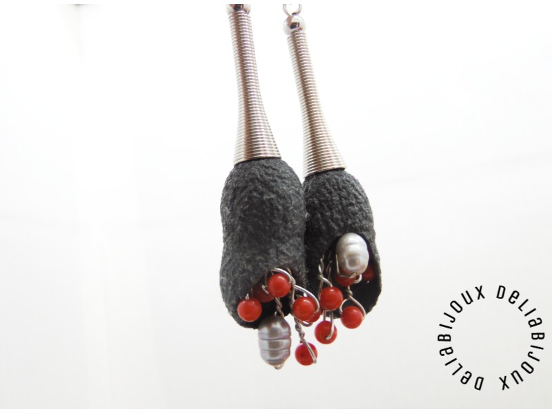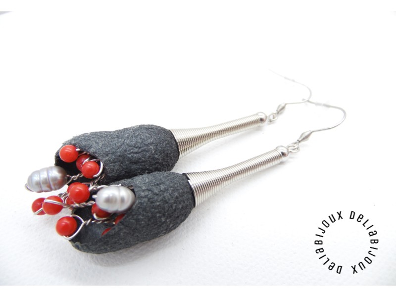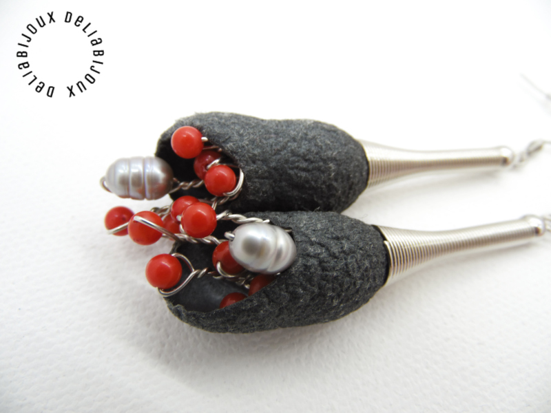 Cercei statement, lungi, usor asimetrici, realizati din coconi de matase naturala (~3 cm x 1.5 cm; marimea este aproximativa, pot exista mici diferente de marime si textura intre coconi, nefiind identici), perle de cultura (forma neregulata 7-8 mm), bile de inox (5 mm), margele de coral ( 3 mm), tortite din otel inoxidabil, elemente metalice, sarma de modelaj din alama si dopuri de silicon.