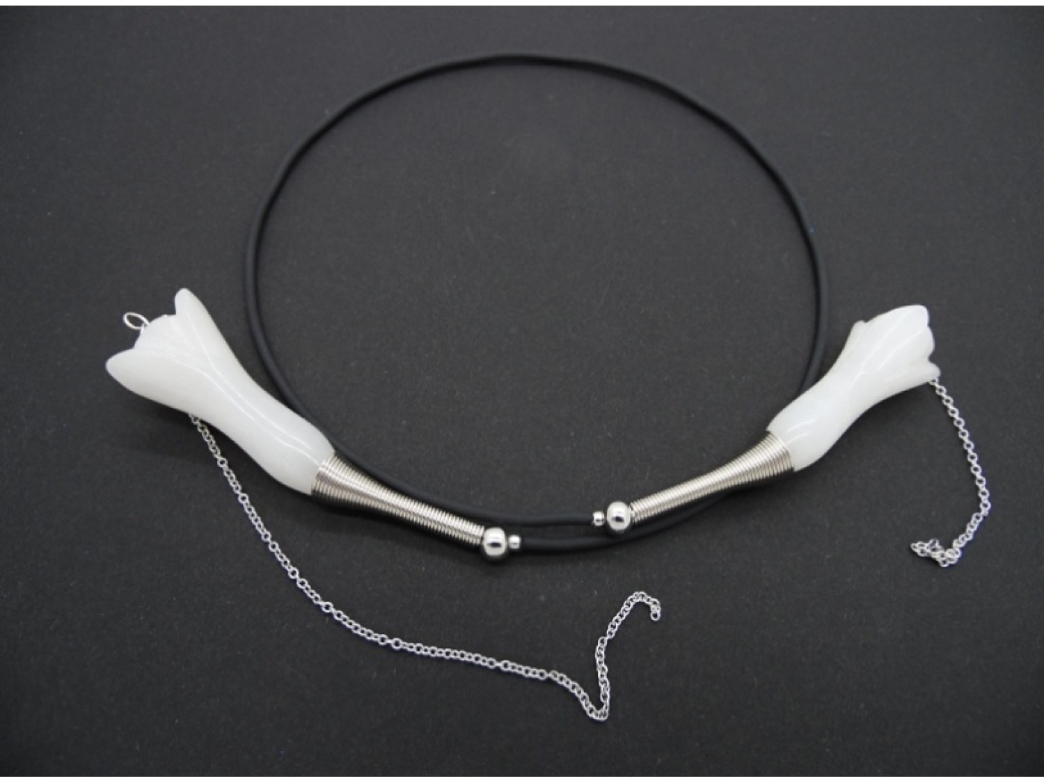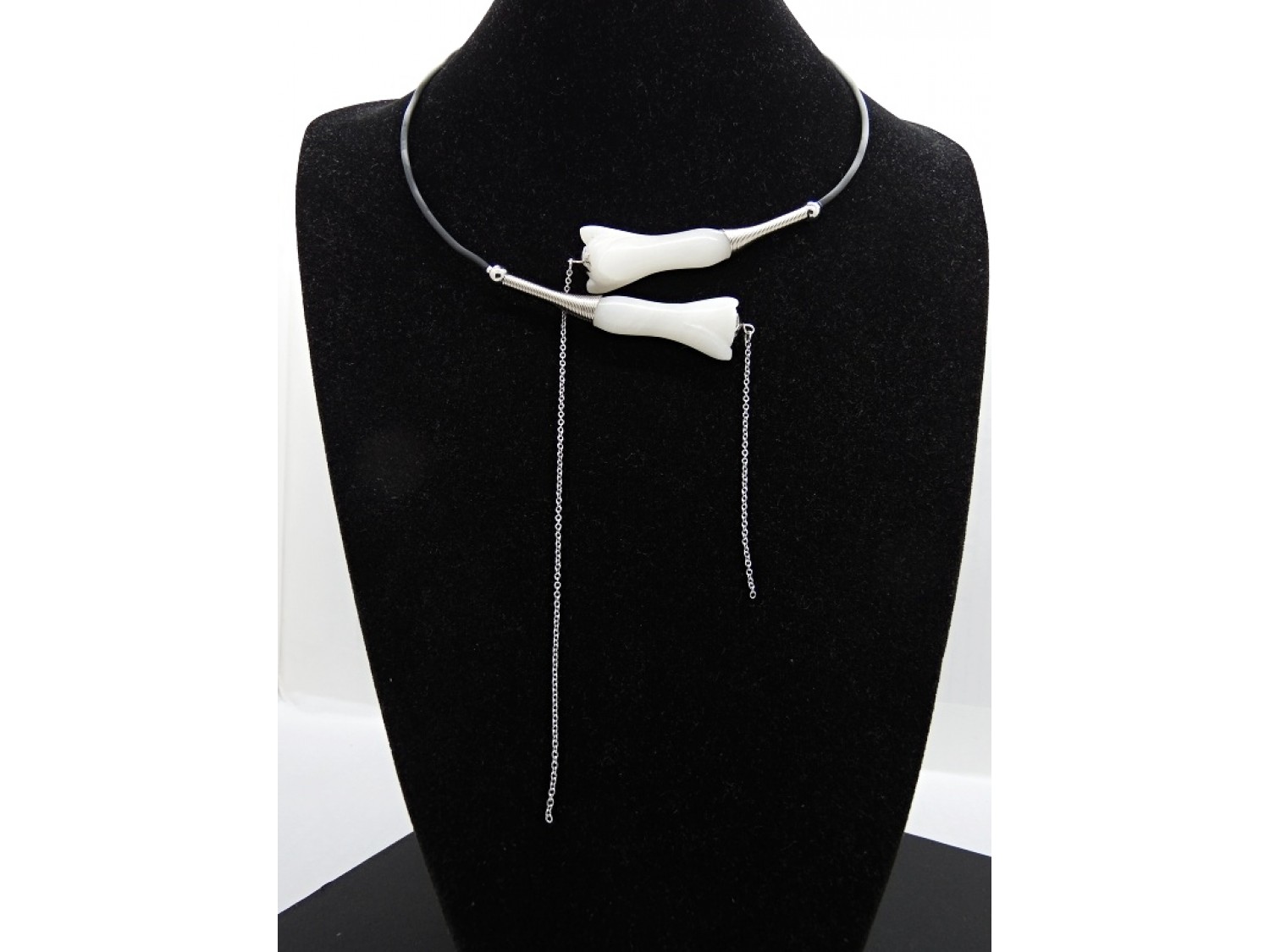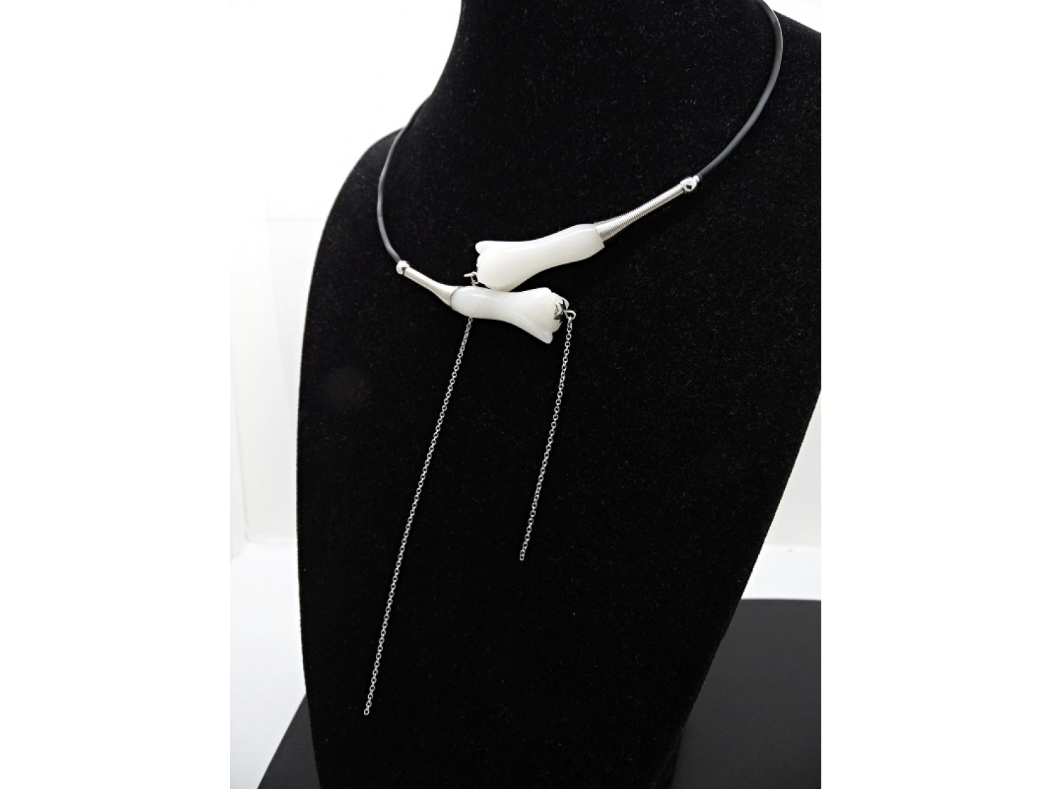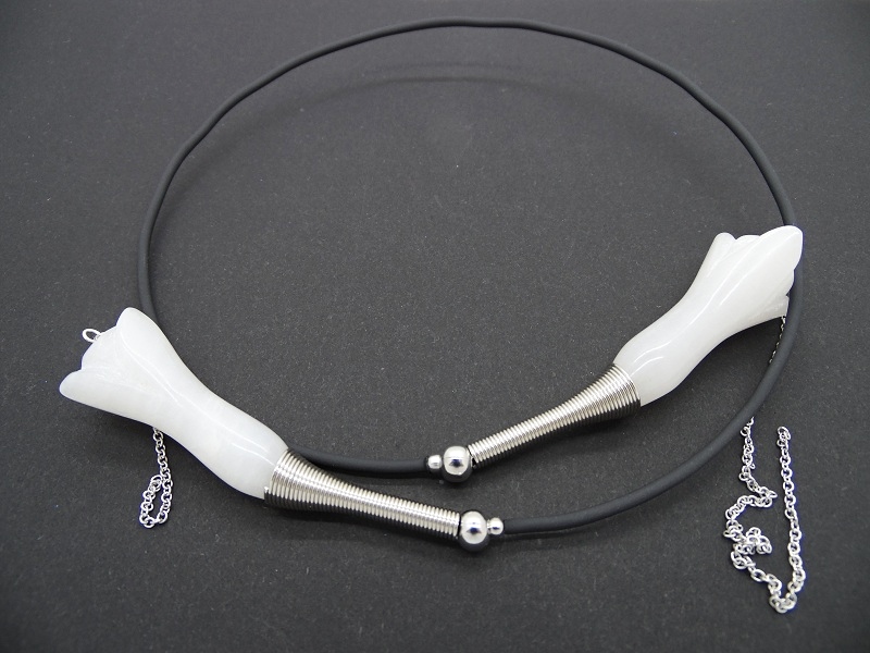 Colier statement la baza gatului, choker, realizat pe sarma cu memorie, din flori agat (45 mm lungime, 18 mm latime), bile inox (3 mm, 6 mm), elemente metalice, tub silicon negru, elemente metalice, lant otel inoxidabil (15 cm si 7 cm). Colierul nu are inchidere. Diametrul colierului ~ 11 cm. Lungimea desfasurata a colierului - 52 cm.