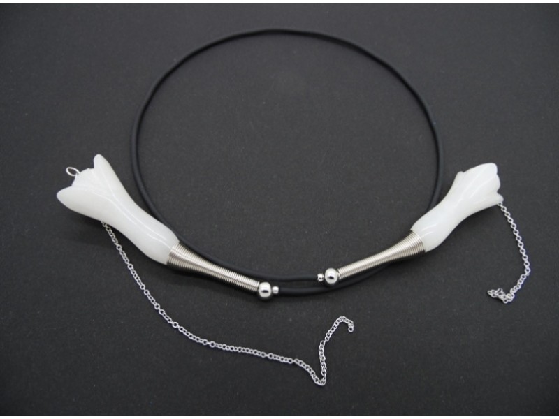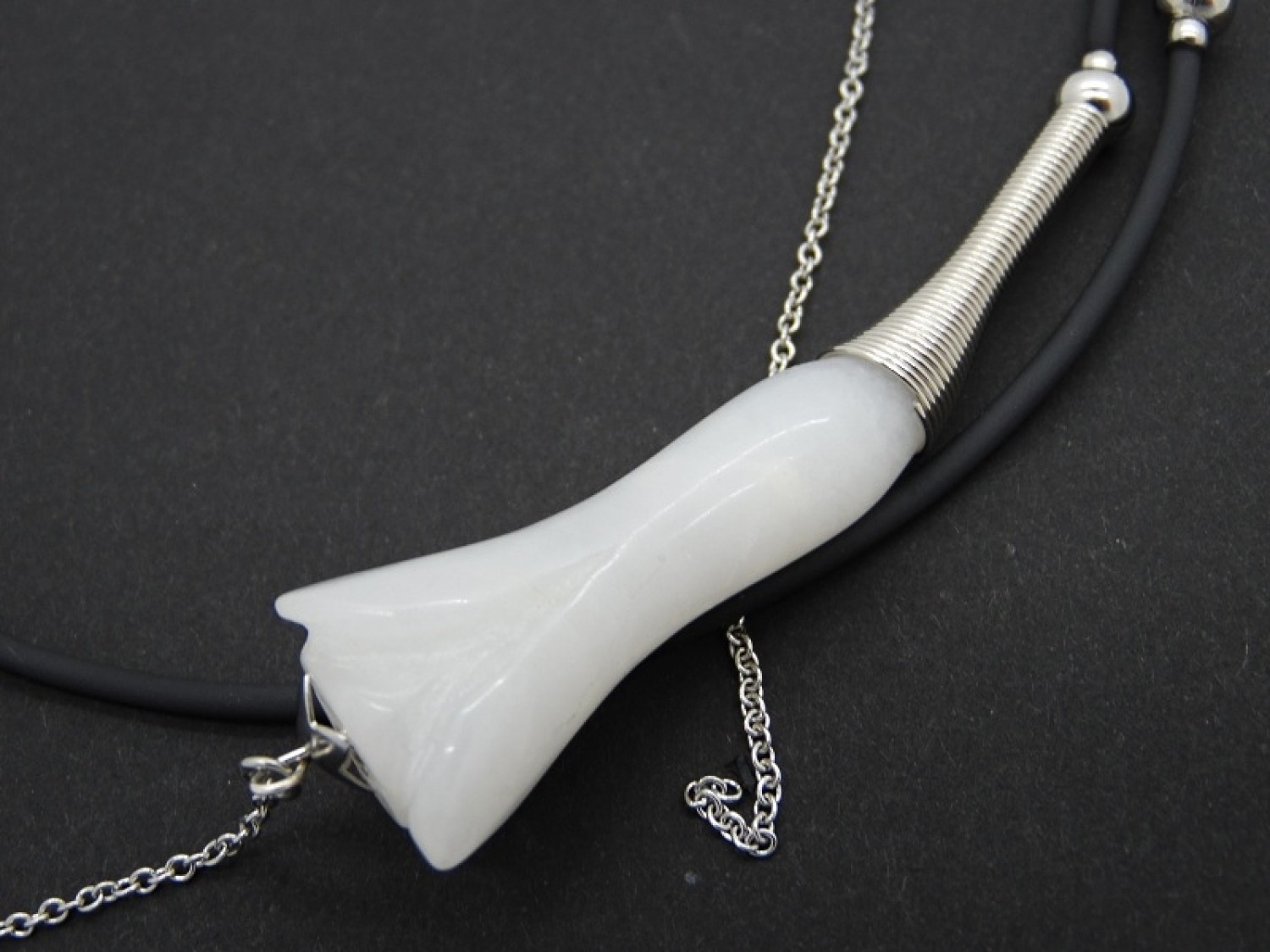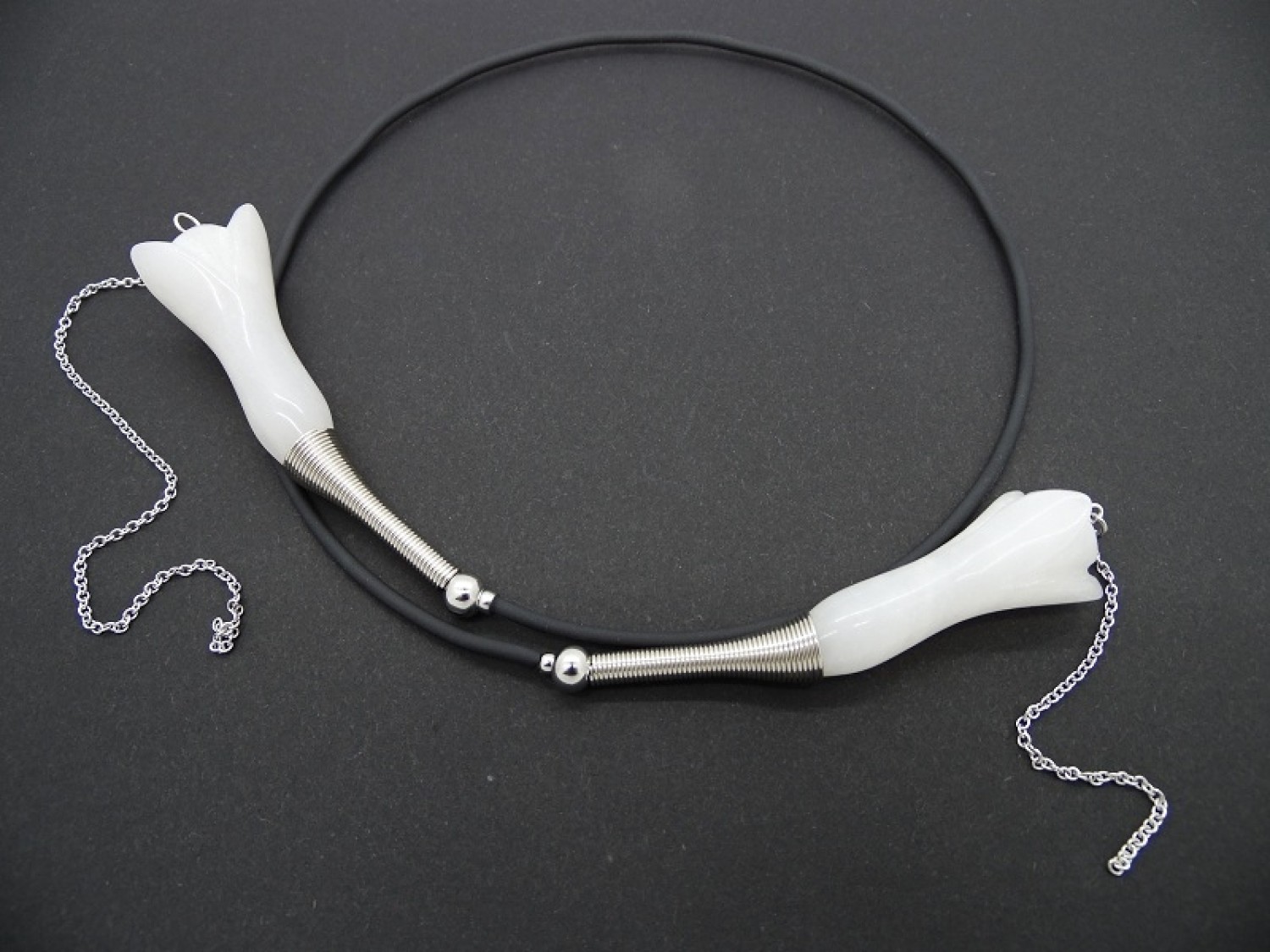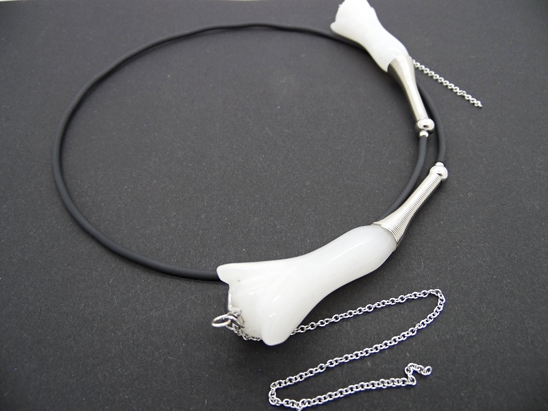Colier statement la baza gatului, choker, realizat pe sarma cu memorie, din flori agat (45 mm lungime, 18 mm latime), bile inox (3 mm, 6 mm), elemente metalice, tub silicon negru, elemente metalice, lant otel inoxidabil (15 cm si 7 cm). Colierul nu are inchidere. Diametrul colierului ~ 11 cm. Lungimea desfasurata a colierului - 52 cm.