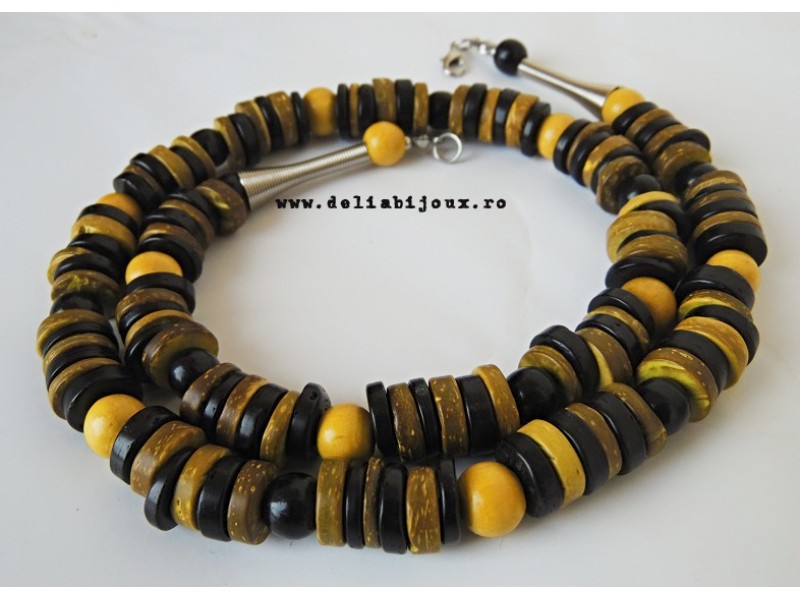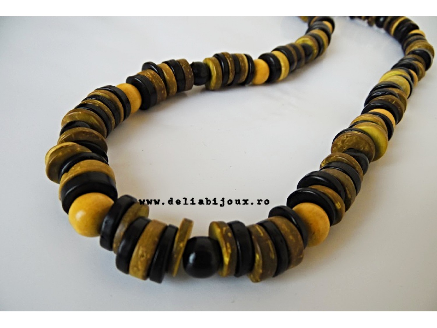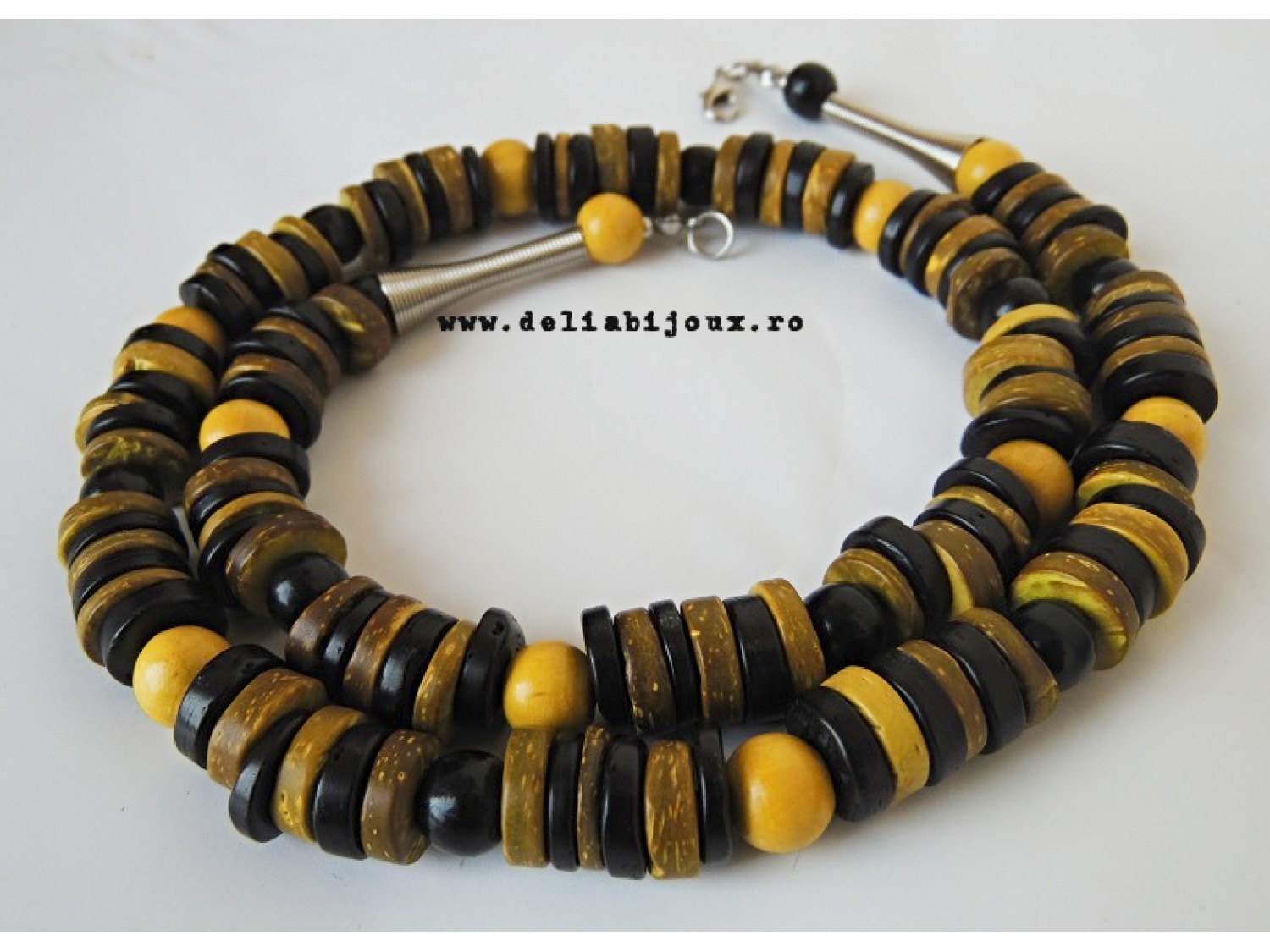 Colier realizat din margele de lemn (8 mm si 10 mm) si discuri de lemn de cocos (12 mm - nu sunt identice), bile de inox (3 mm) si elemente metalice argintii. Inchidere tip lobster.